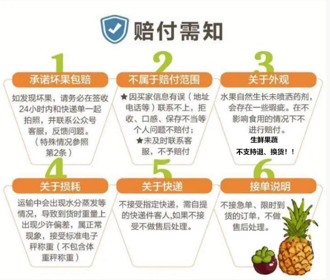 【售后标准】生鲜果蔬必须在实际物流到货24小时内签收查看,有坏包赔!超时、拒收、收货地址不详、联系不上收货人不售后!请买主一定要注意查看下物流哦(文末赔付需知必看)。