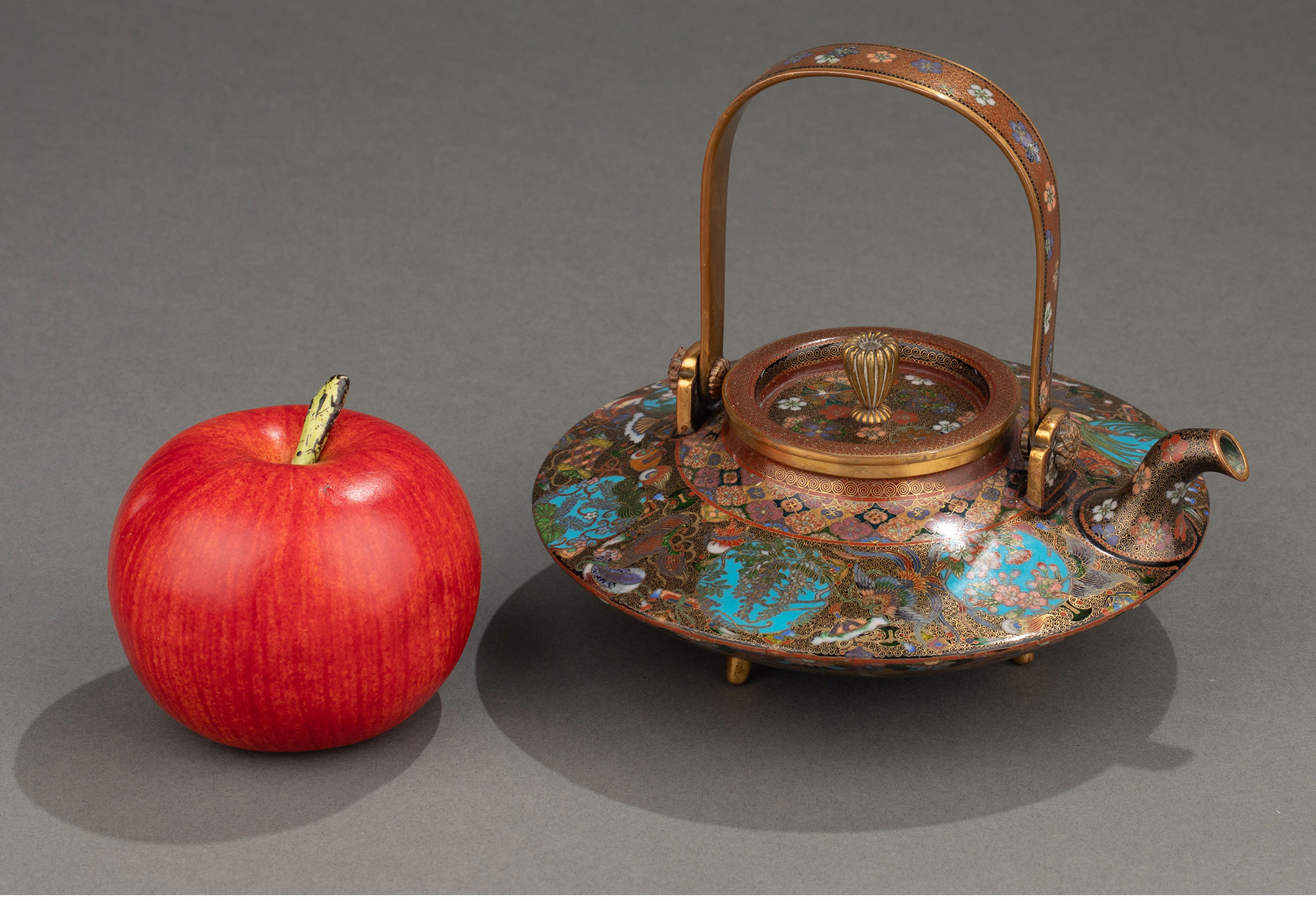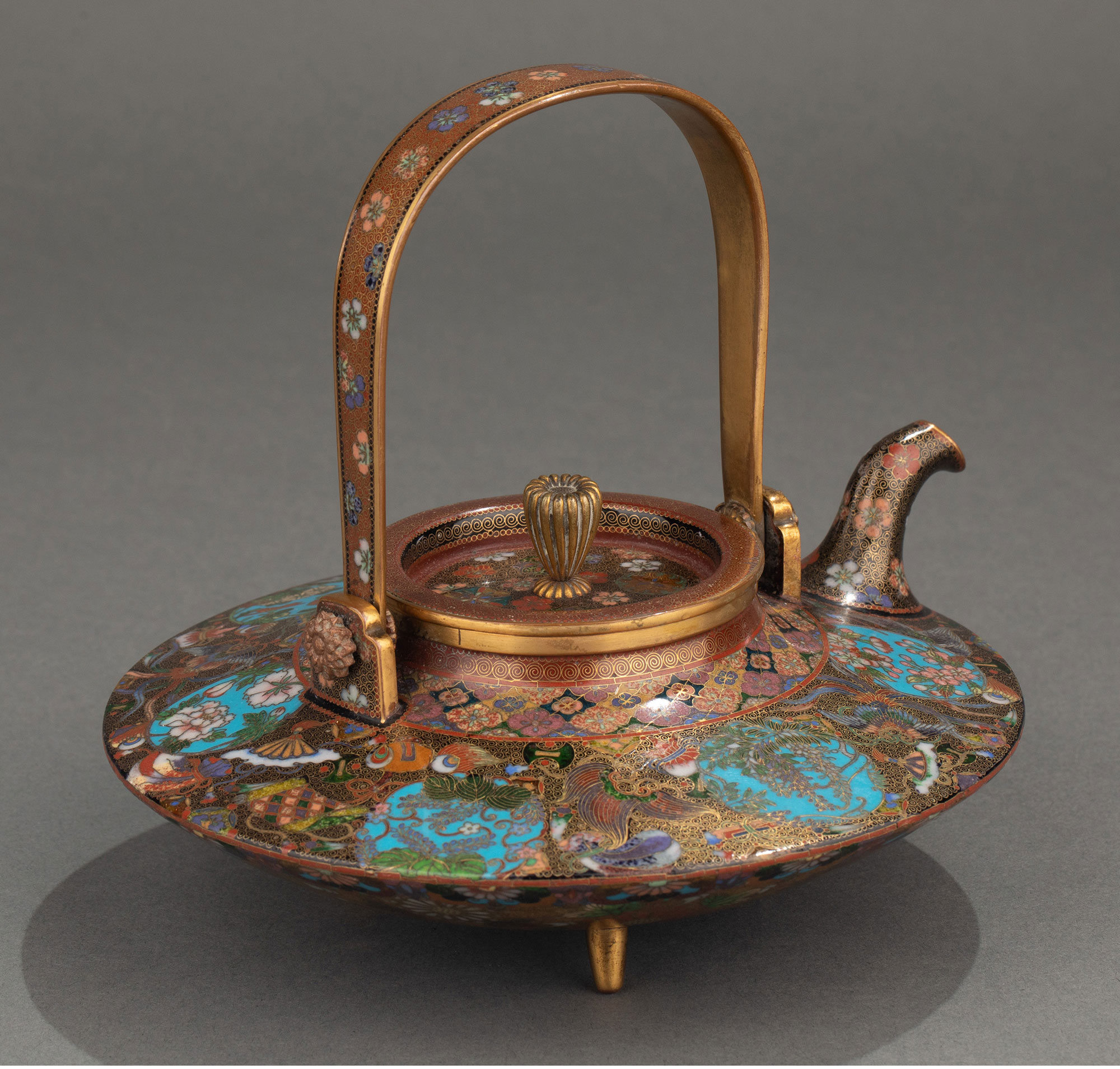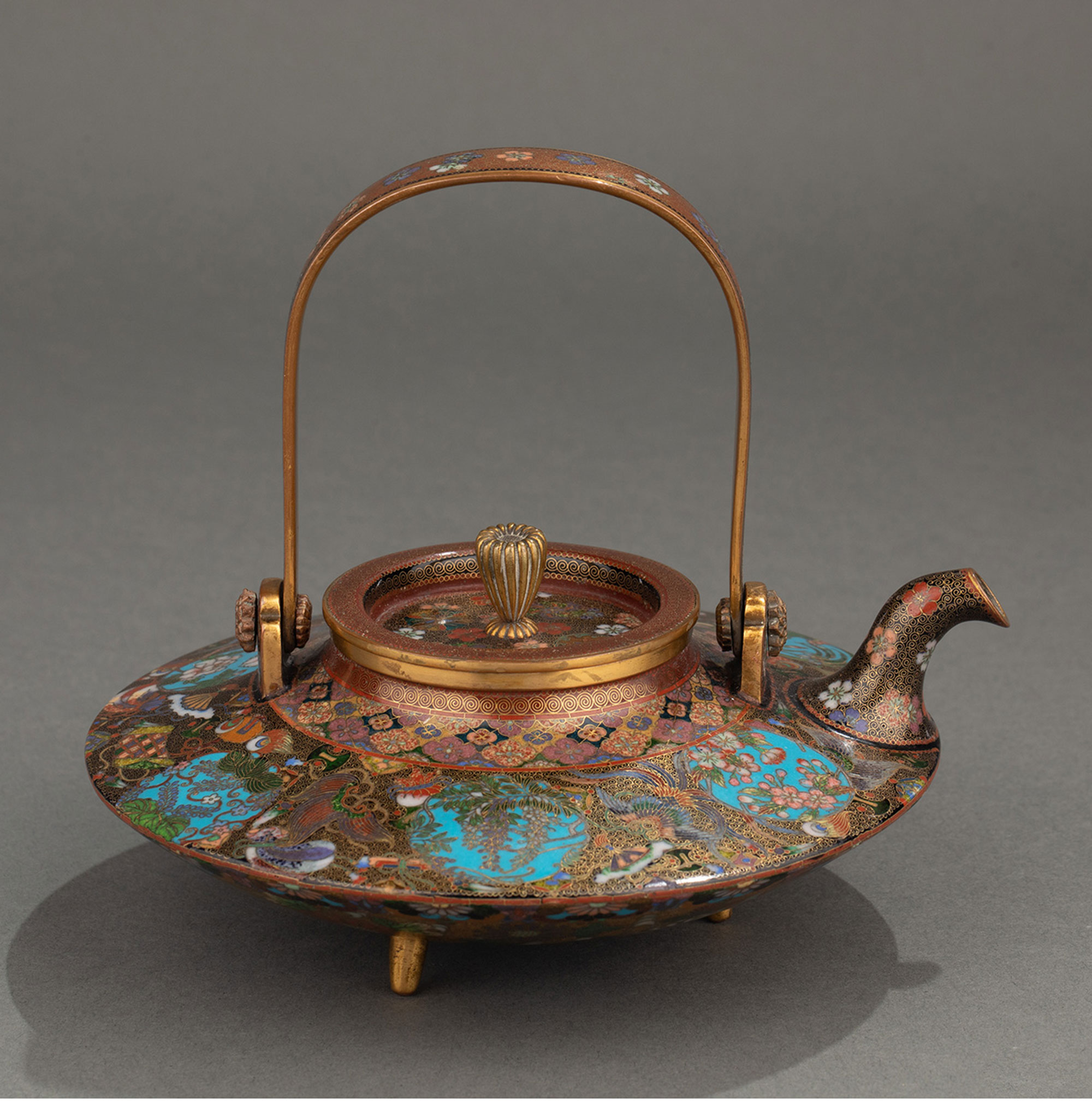 1895年代日本明治时期出品稲葉七宝风格吉祥花鸟装饰提梁茶壶/清酒壶