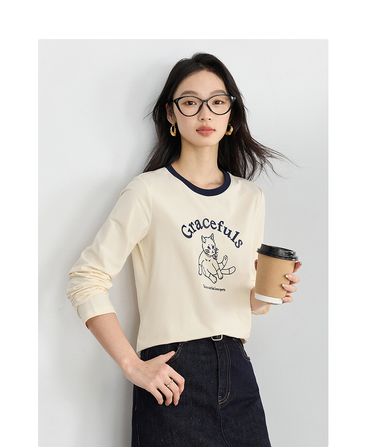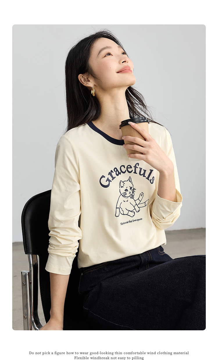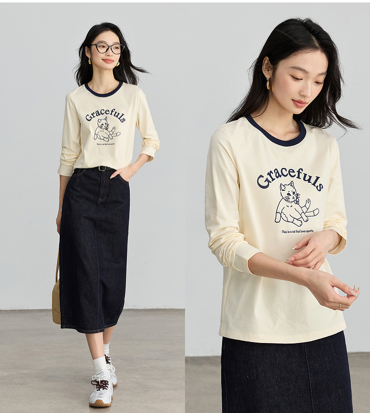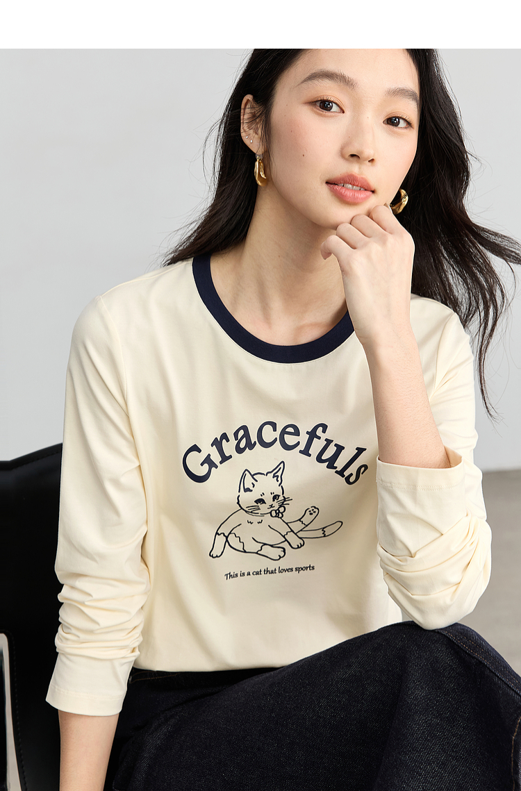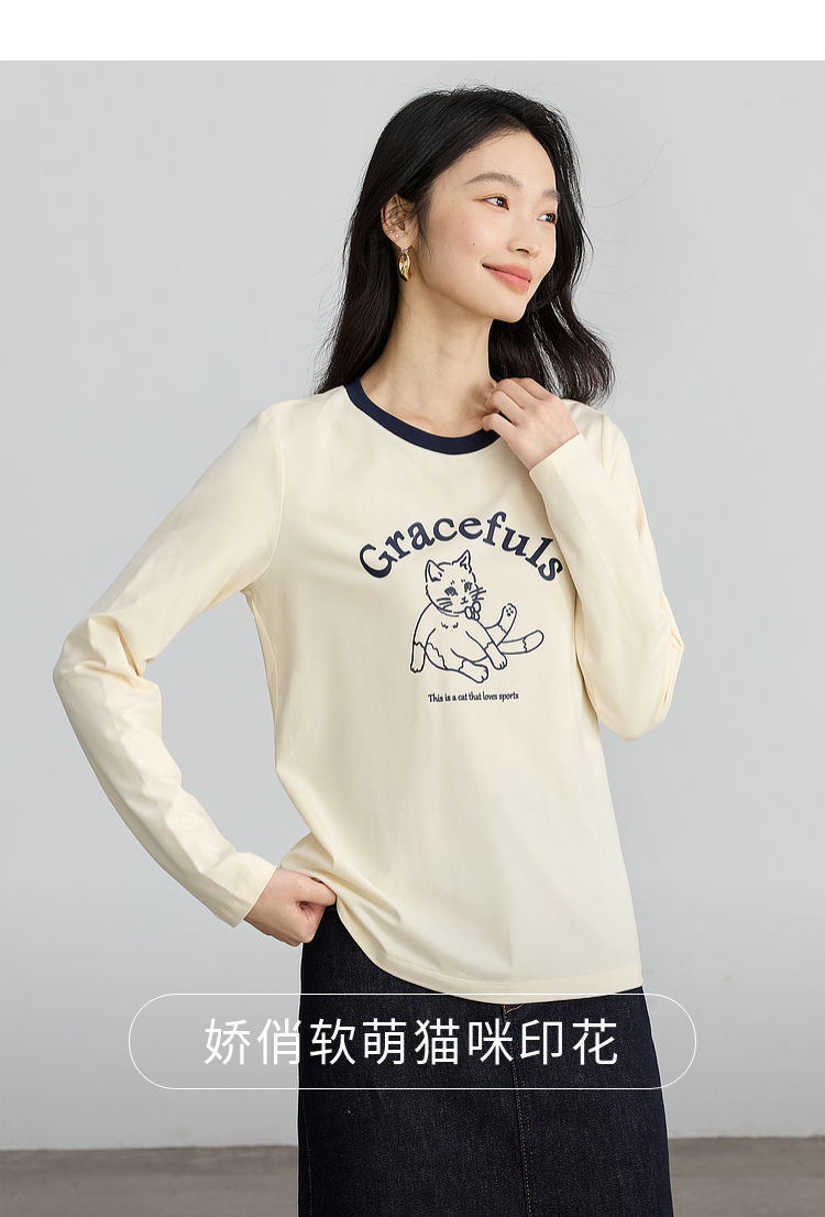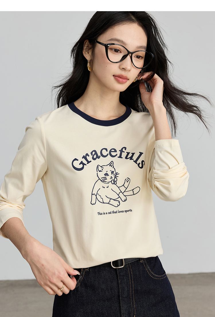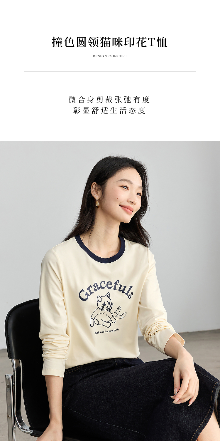 【年终特卖】熙世界2025春秋新款撞色圆领猫咪印花T恤长袖美式复古正肩上衣