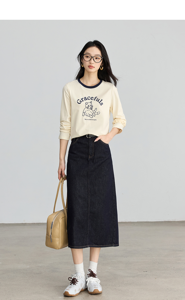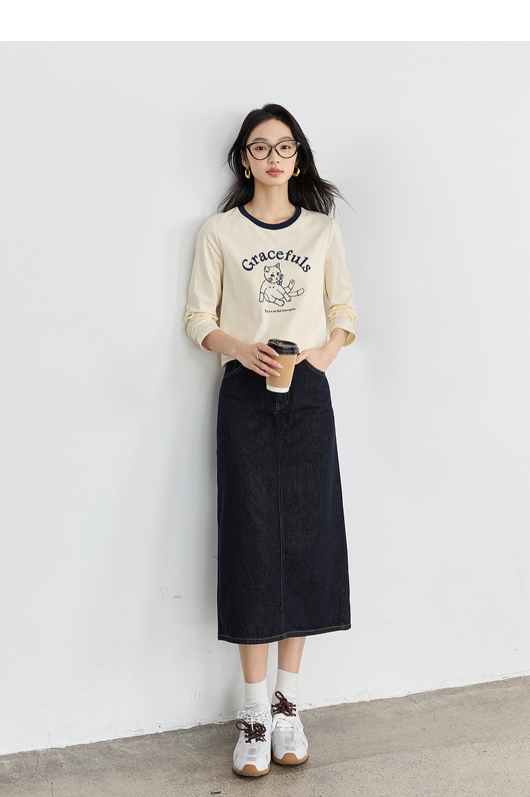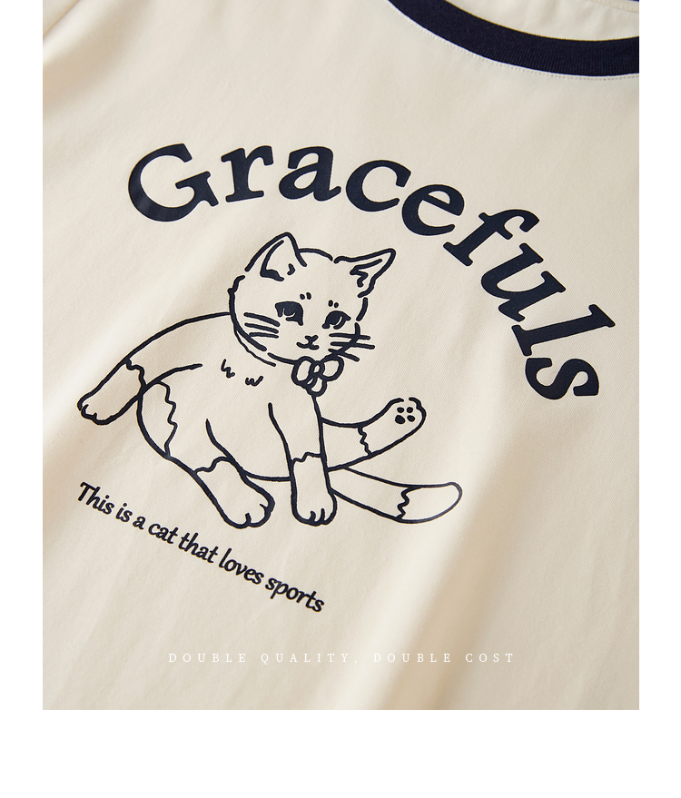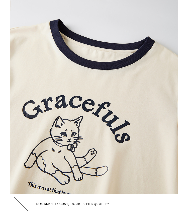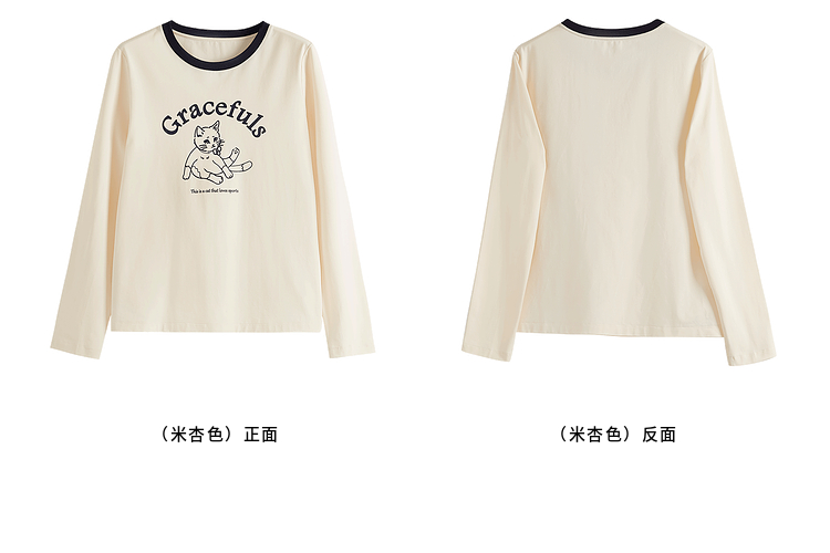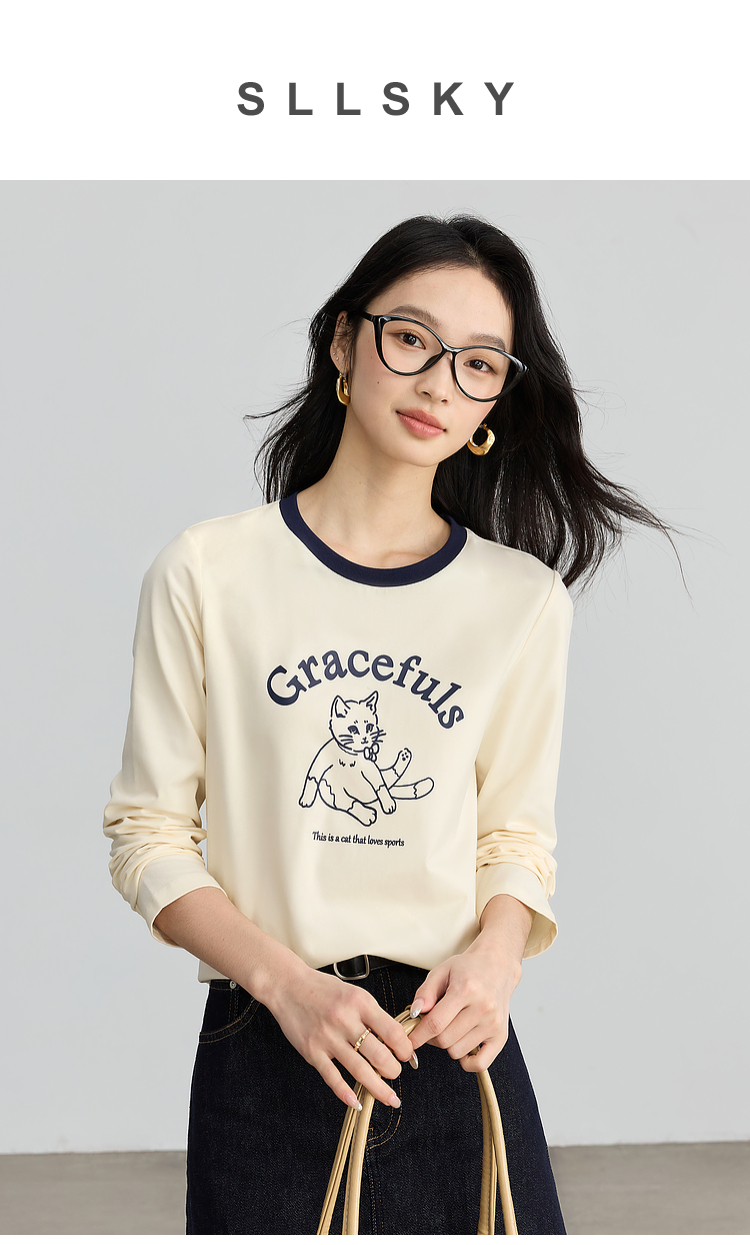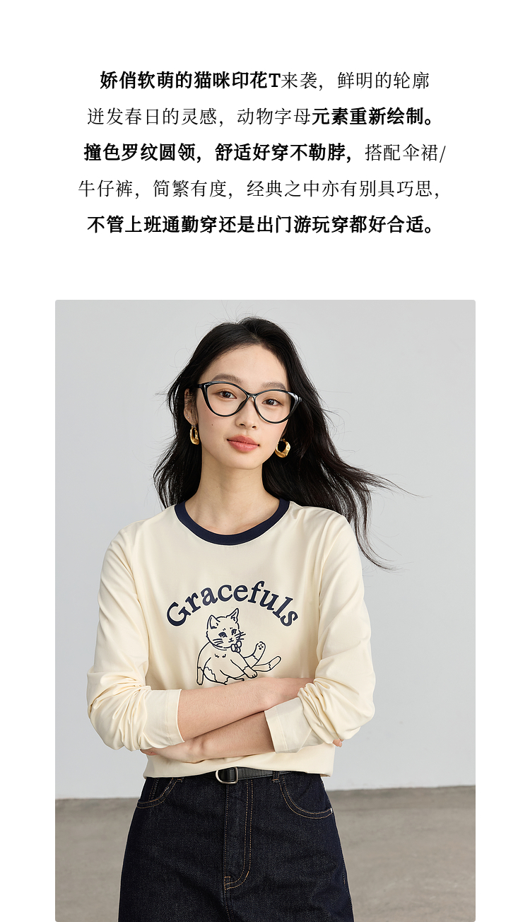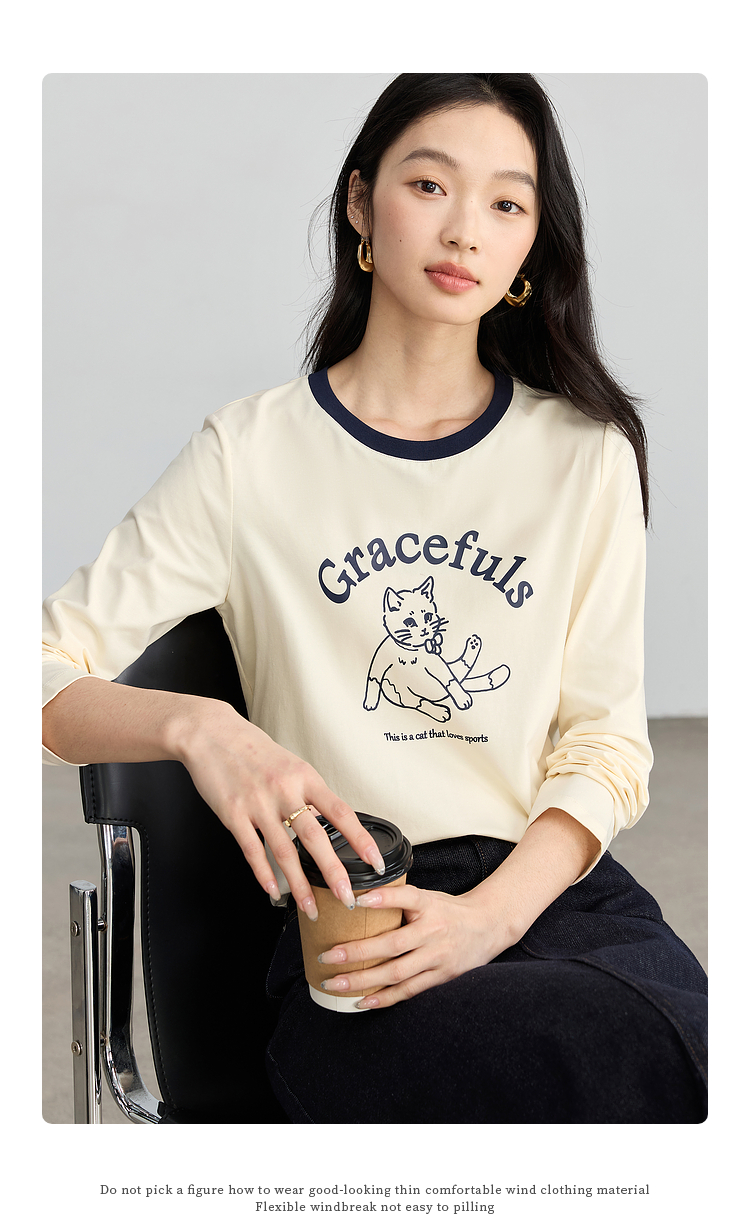【年终特卖】熙世界2025春秋新款撞色圆领猫咪印花T恤长袖美式复古正肩上衣