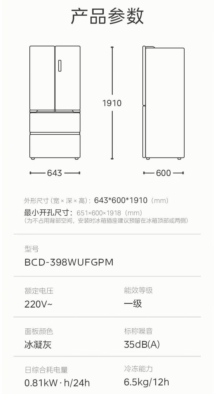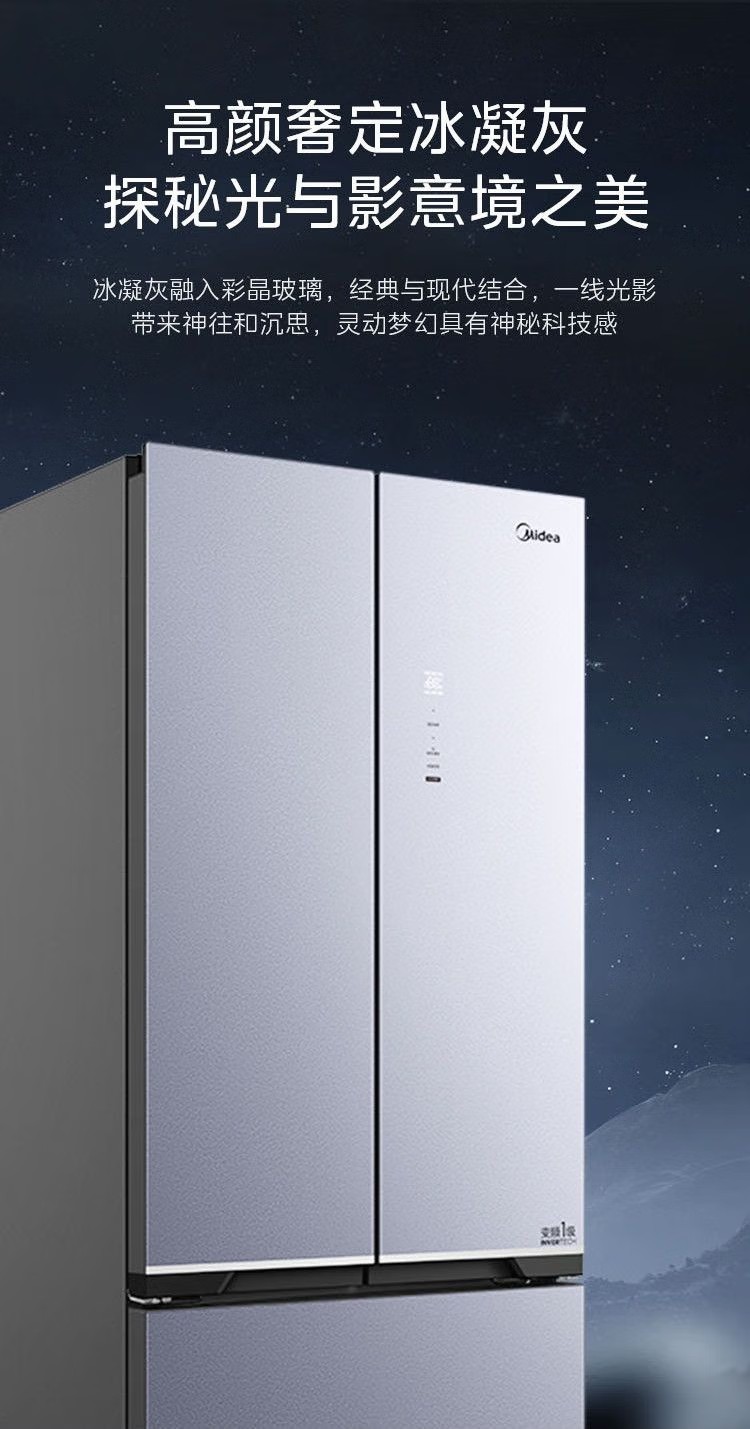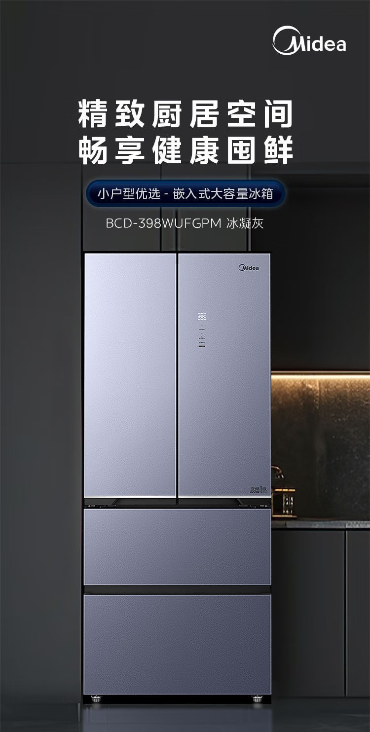 美的(Midea)冰箱398升法式四门纯平全嵌大冷冻抗菌保鲜节能变频家用大冰箱BCD-398WUFGPM冰凝灰