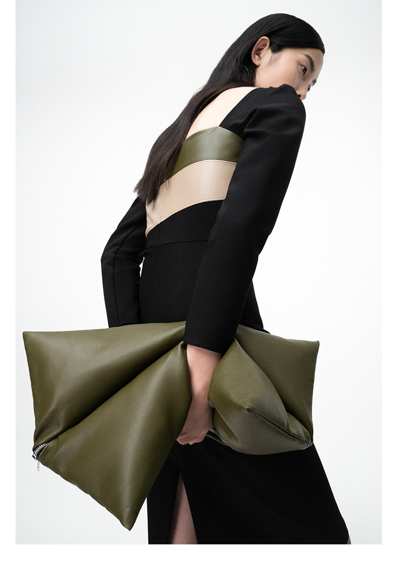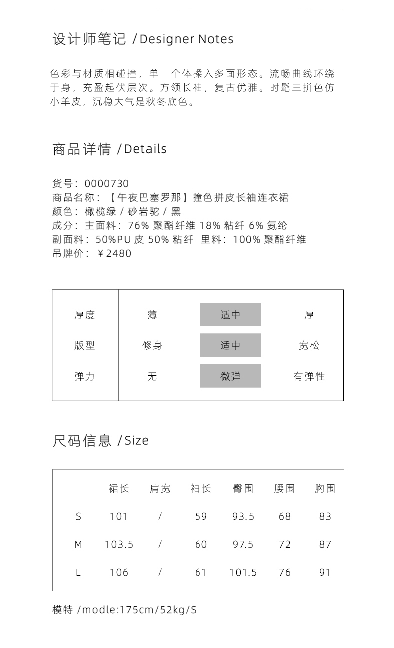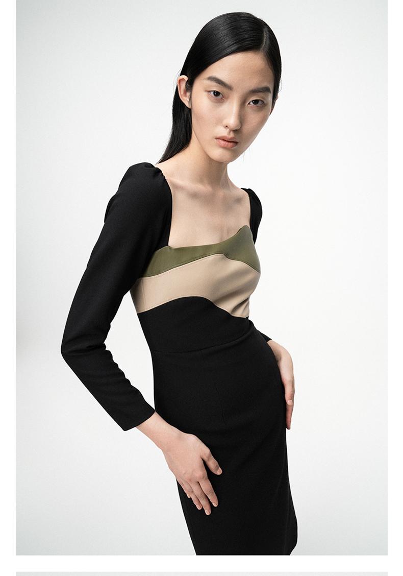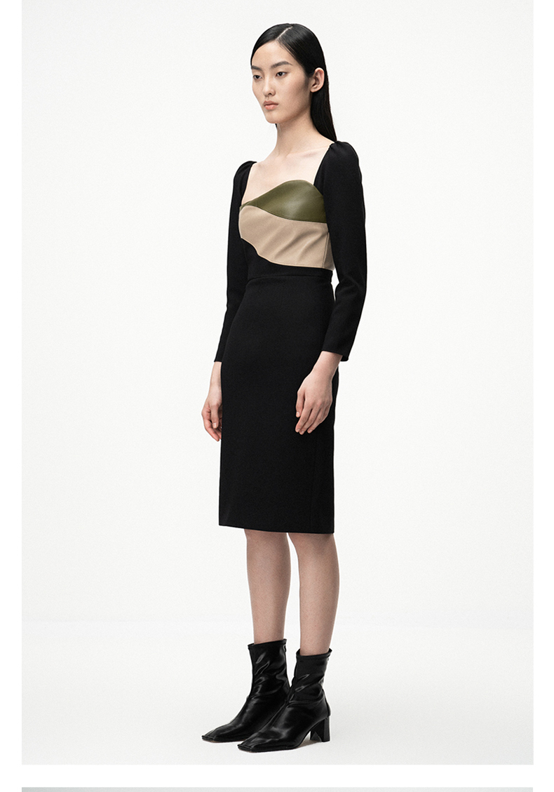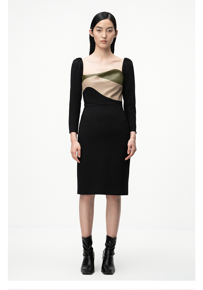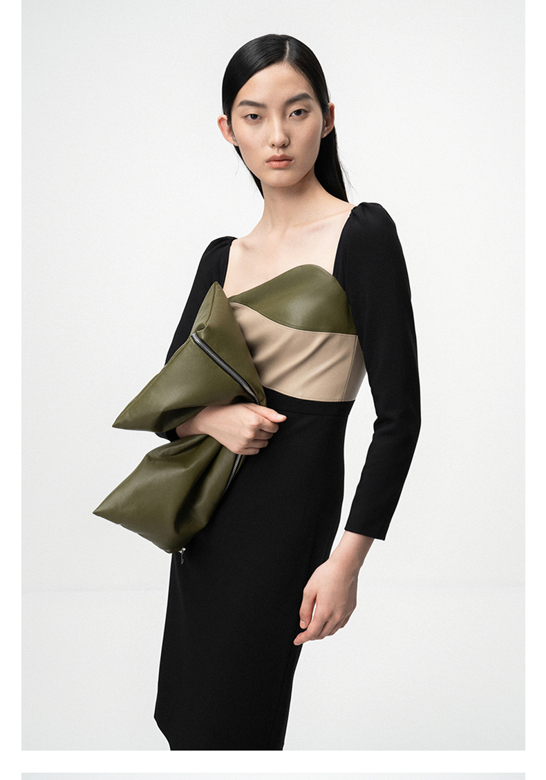 【午夜巴塞罗那】橄榄绿不规则曲线撞色拼皮长袖连衣裙/0000730