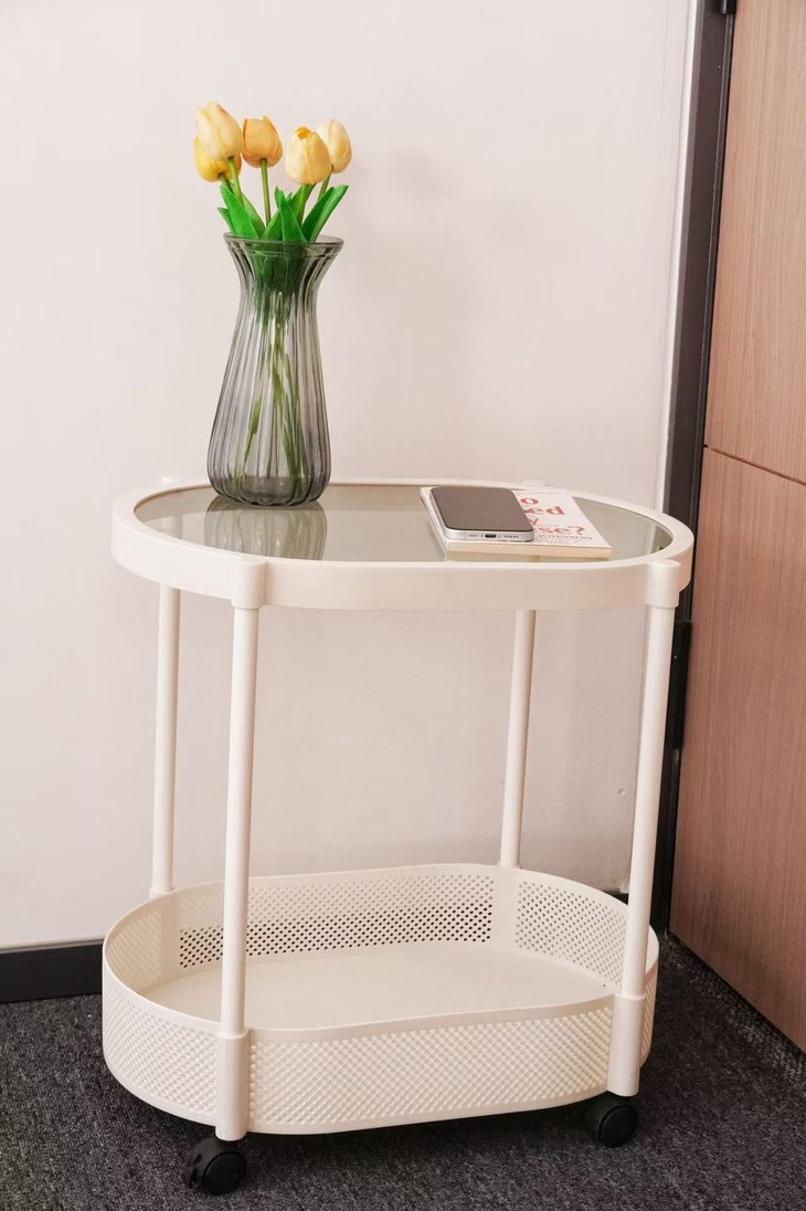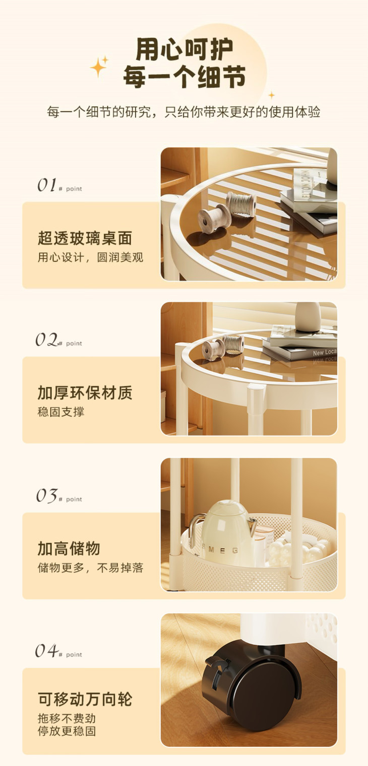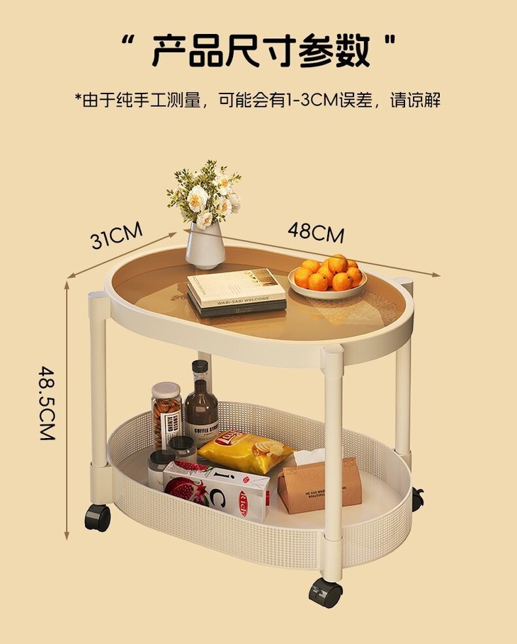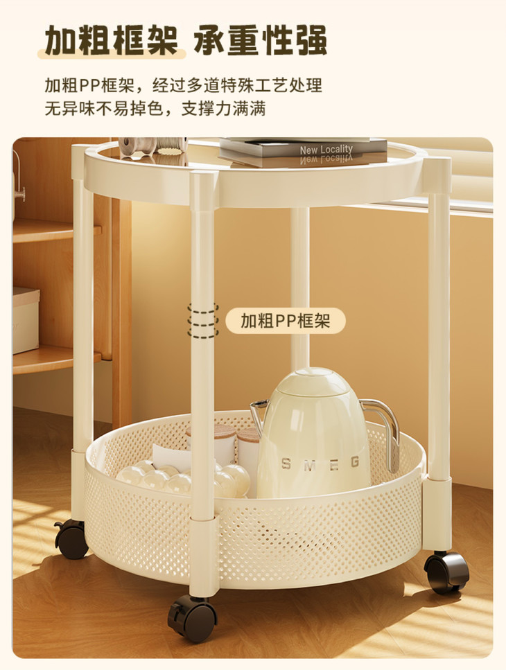 ✅超清晰玻璃桌面搭配简约框架,久看不腻更百搭 ✅小巧身形,占地面积仅0.18㎡,小户型空间也能随意放 ✅上层桌面置物+下层加高储物框,双层储物超实用 ✅48.5cm高度,使用高度合理,拿取物品方便不费力 ✅360度旋转万向轮,顺滑转动不伤地板,哪里需要推哪里 ✅加粗PP框架+四平受力设计,质感好,承重能力优秀
