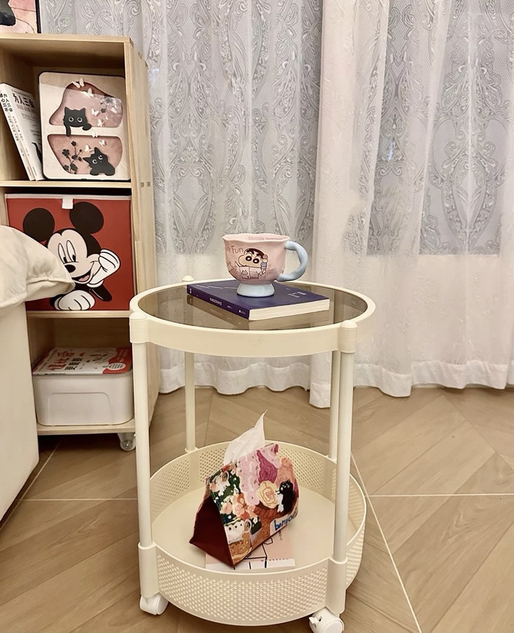 🔺双层的置物部分,超实用 上层桌面可以放一些随手经常要用的东西 下层加高储物框还能收纳物品,空间够大 真的会比一个纯边几方便不少