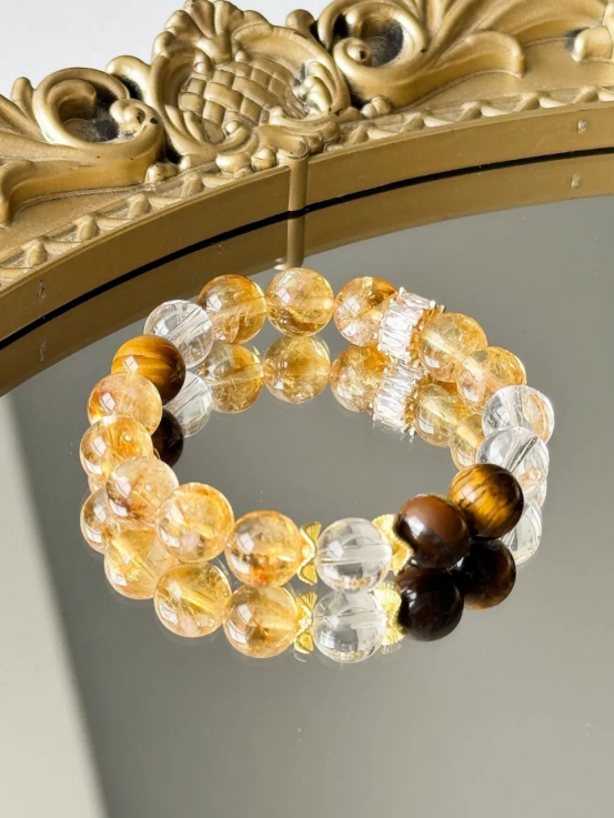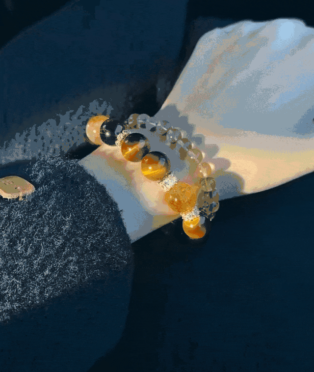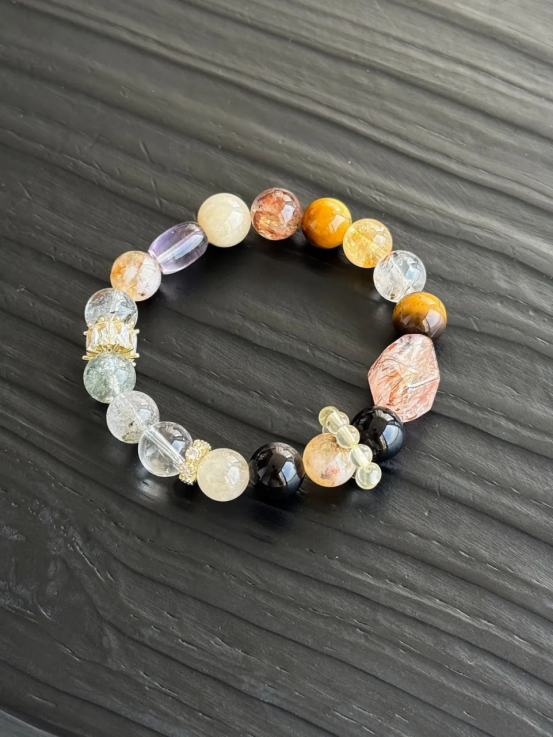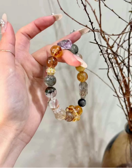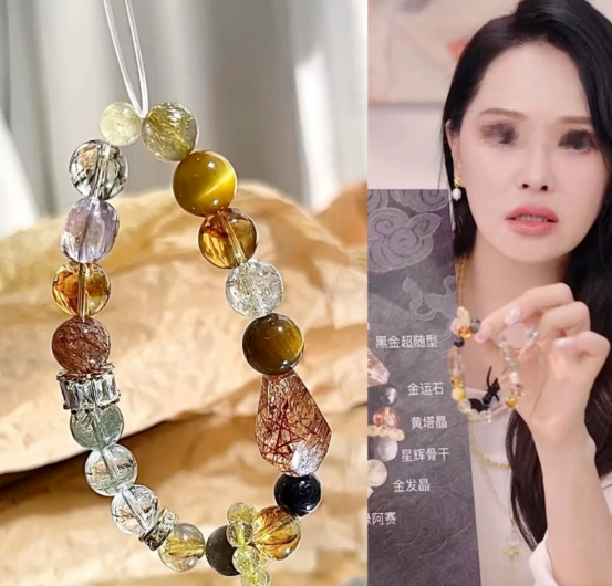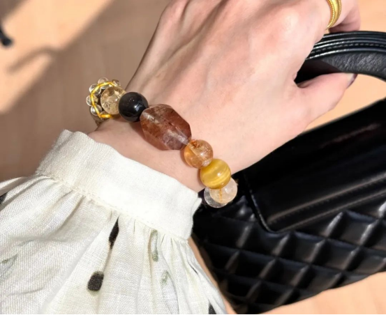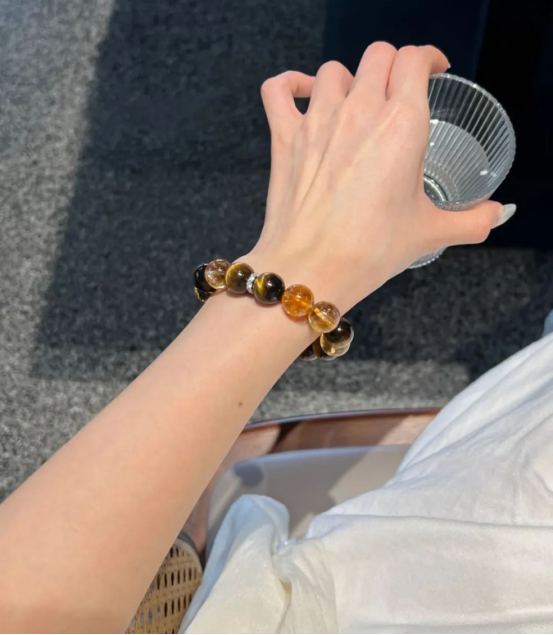 一个手串囊括了白水晶+黄水晶+木变石+黑曜岩等多种材质,非常全面。