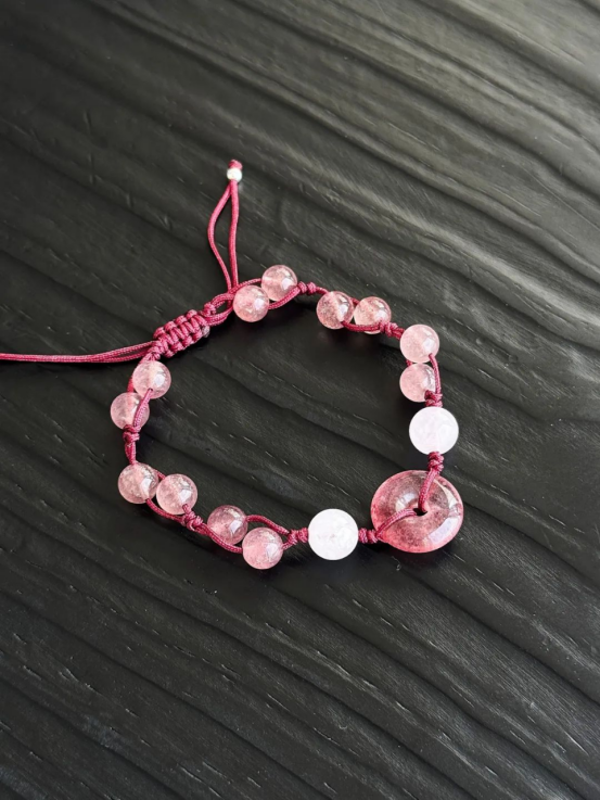 简约但又不失设计感的风格,日常跟各种穿搭风格都能融合。 手串由平安扣牵引,粉晶开头,每一截红绳上都有成双成对的两颗草莓晶相互缠绕。