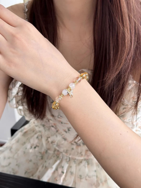 10 梦蝶-月光石白水晶手串 79元 整体偏柠檬黄的色调,上手有一种呼之欲出的清新感。 手链结尾处的月光石自带那种朦胧感的滤镜,像是温柔恬淡的美人,静静守护。