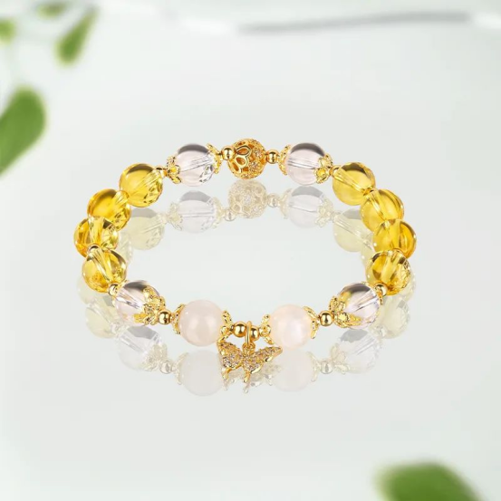 黄塔晶黄澄澄的,很多人又称它为“财富吸铁石”。 再加上粉水晶和紫水晶,想要爱情事业双丰收戴它准没错。