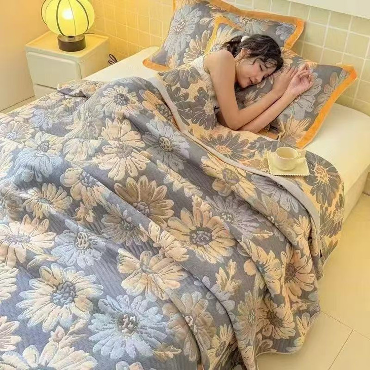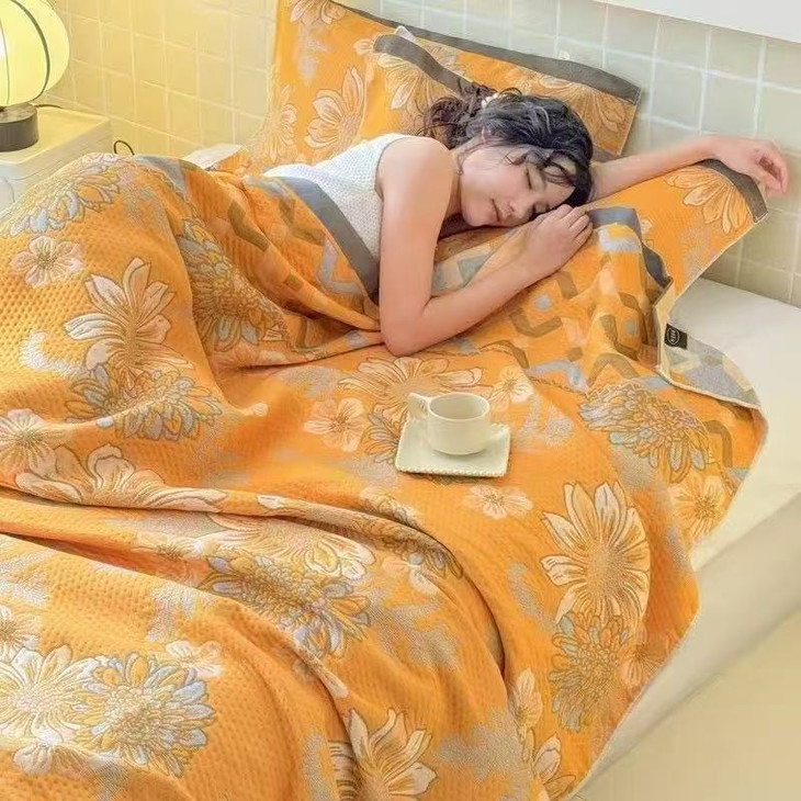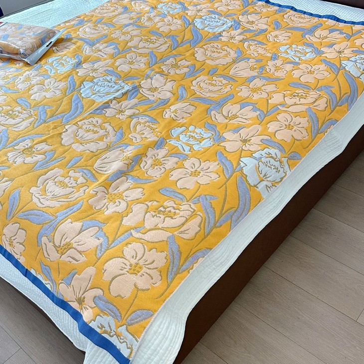 多层棉纱繁花盖毯——把春日温柔裹在身上 明黄色的底色上,绚烂的花朵热烈绽放,仿佛把整个春天都藏进了这条盖毯里! 多层棉纱盖毯,高颜值与实用并存,给宝宝或自己一份治愈系温暖🌼 ✨ 高级感满分的春日美学 明黄底色搭配手绘风繁花图案,明亮又温柔,ins风十足,随手一搭就是氛围感神器! ✨ 多层纱布 蓬松透气,亲肤软糯,越洗越柔软,春夏当空调毯,秋冬做贴身盖被,一年四季都能用。