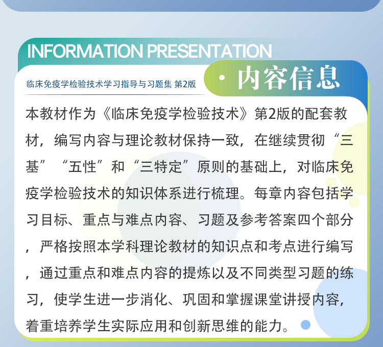 本教材作为《临床免疫学检验技术》第2版的配套教材,编写内容与理论教材保持一致,在继续贯彻“三基”“五性”和“三特定”原则的基础上,对临床免疫学检验技术的知识体系进行梳理。每章内容包括学习目标、重点与难点内容、习题及参考答案四个部分,严格按照本学科理论教材的知识点和考点进行编写,通过重点和难点内容的提炼以及不同类型习题的练习,使学生进一步消化、巩固和掌握课堂讲授内容,着重培养学生实际应用和创新思维的能力。