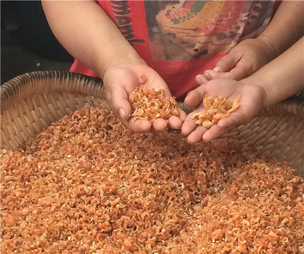 (上图)我们一上岸,就看到了刚刚打捞上来的鲜海米,看上去就非常的诱人。生海米有直接食用的食谱。这就是金钩海米的原材料。后面的制作过程会给大家一一介绍。