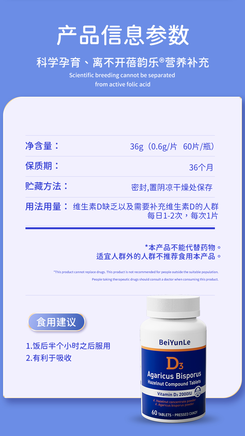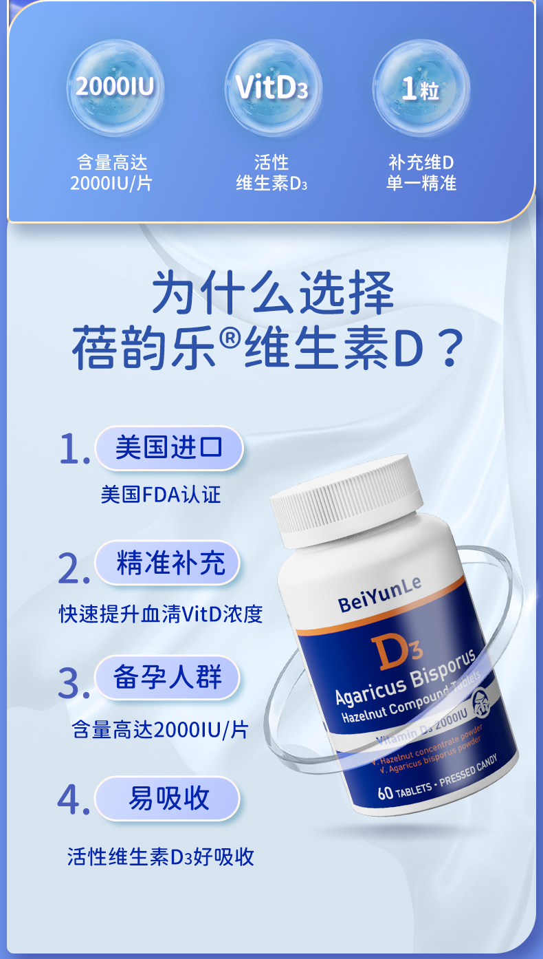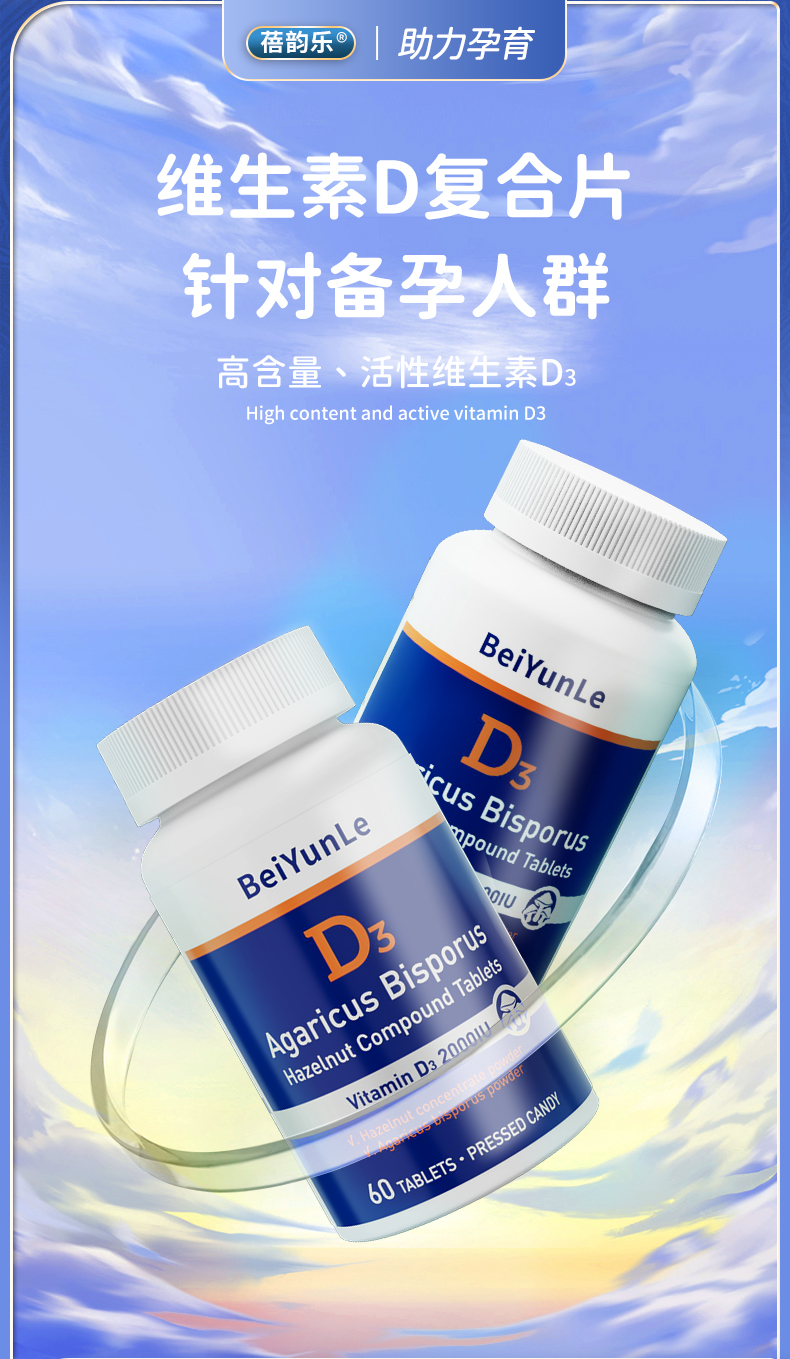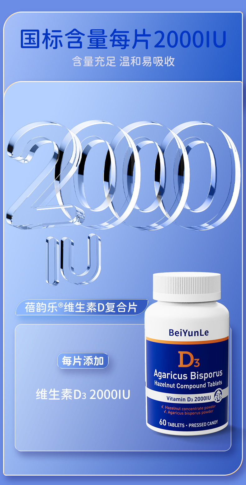 蓓韵乐双孢蘑菇榛子复合片 维生素D3 60粒/瓶 美国原装进口