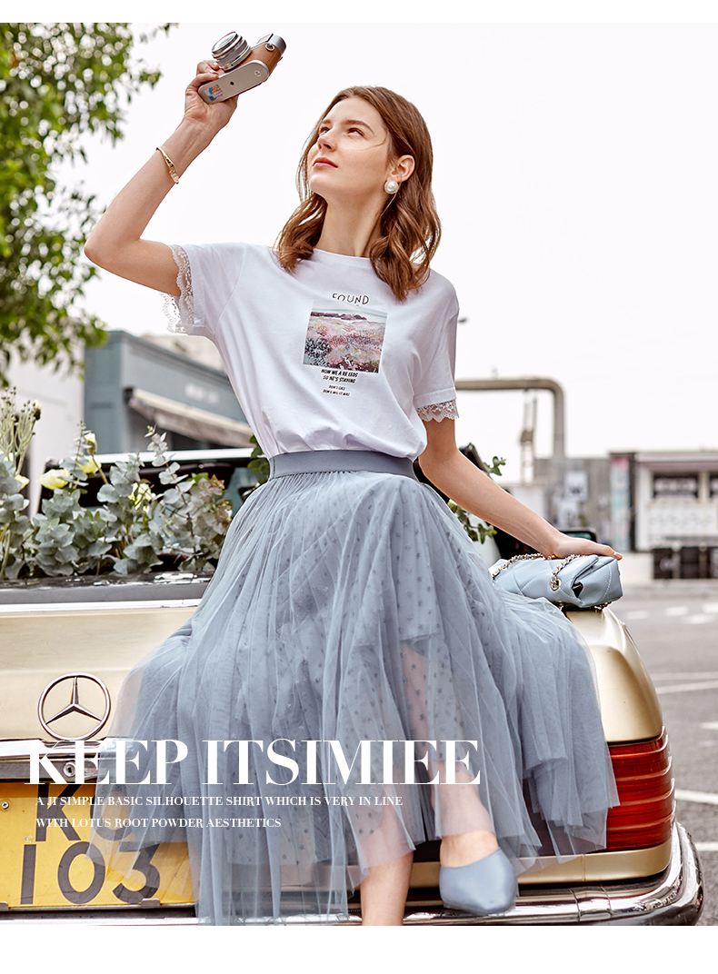 OLrain欧芮儿杏色短袖T恤女夏季法式气质蕾丝衫百搭镂空花边上衣
