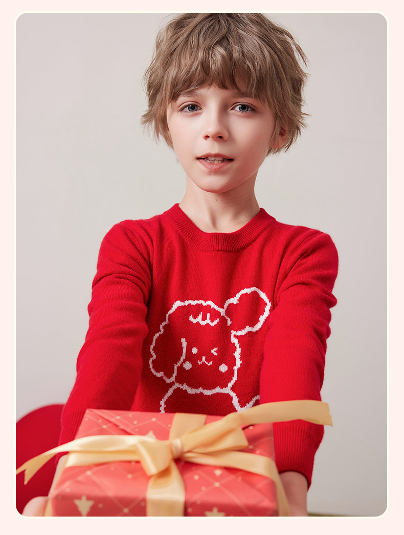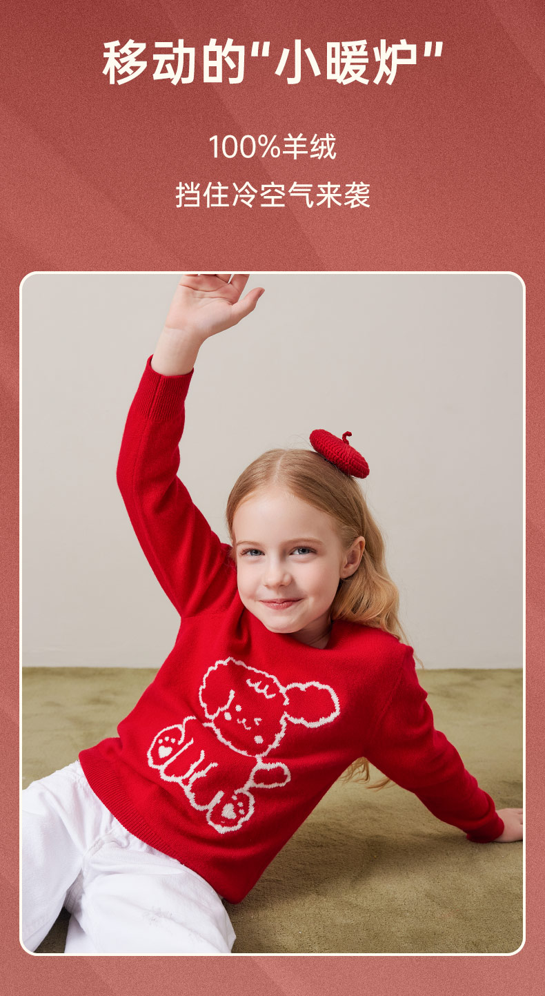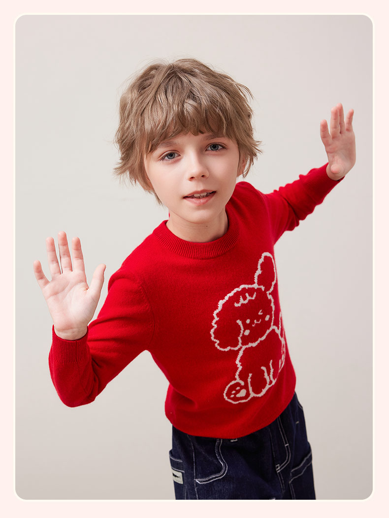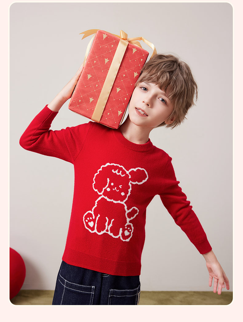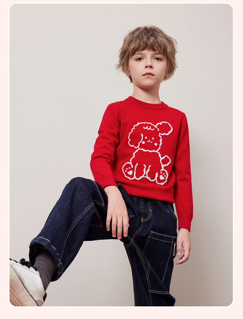 mettekids儿童100%羊绒衫秋冬男童中国红套头毛衣女童针织衫童装