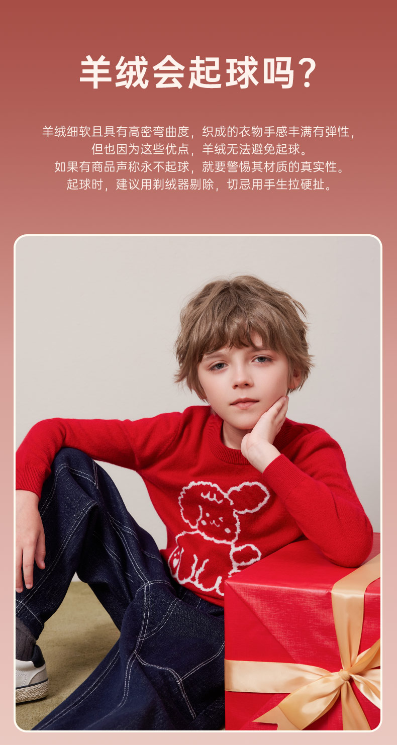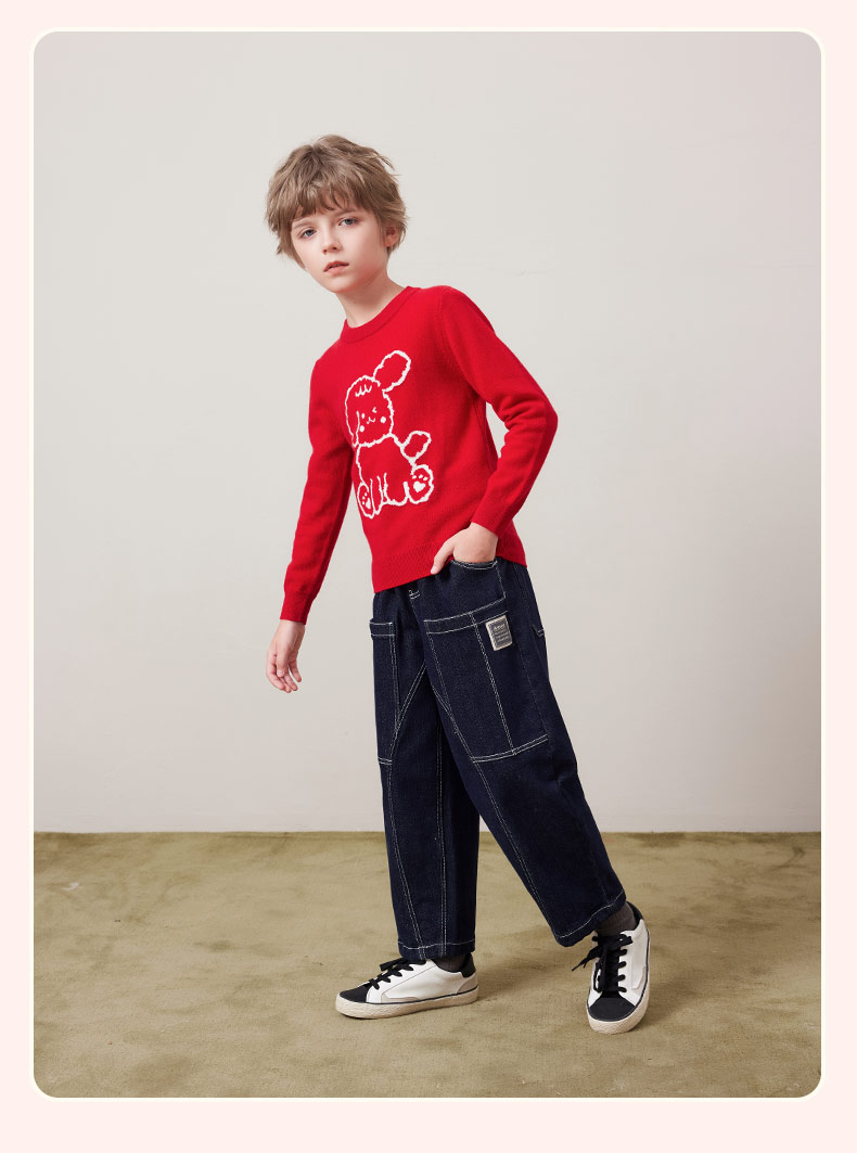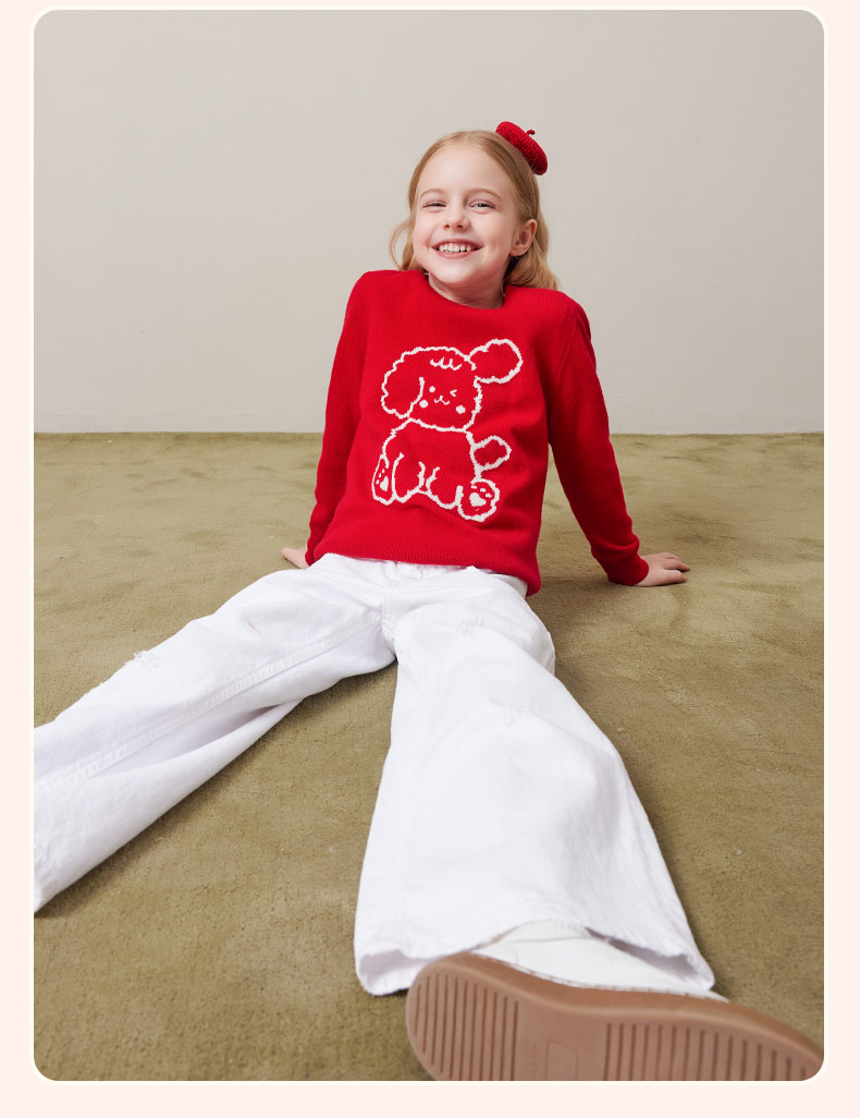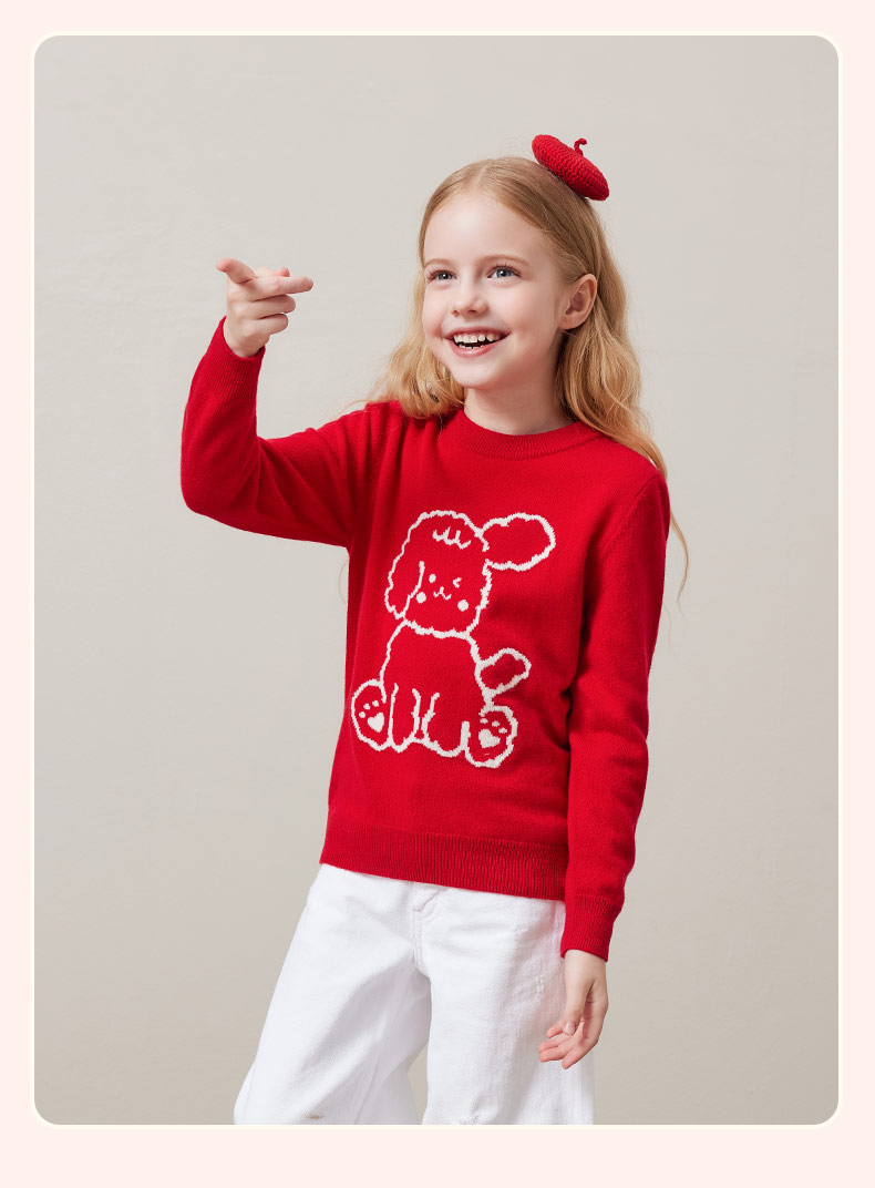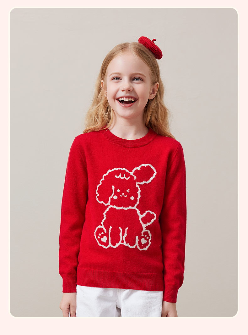 mettekids儿童100%羊绒衫秋冬男童中国红套头毛衣女童针织衫童装
