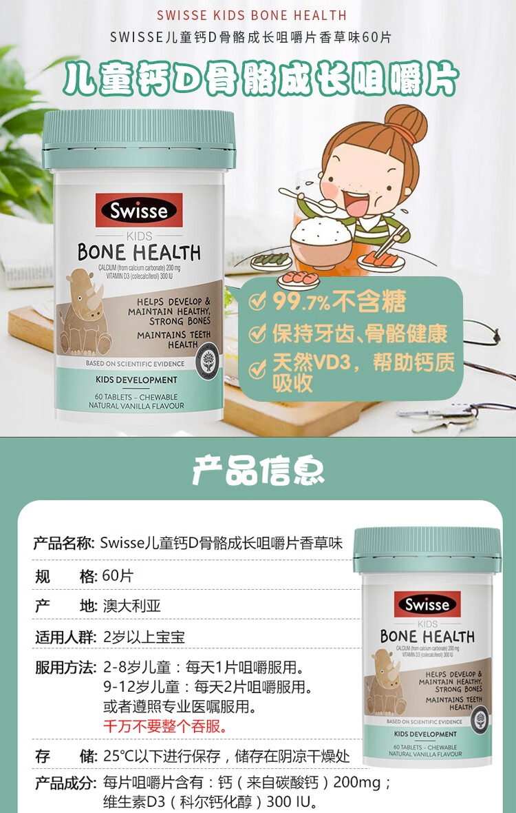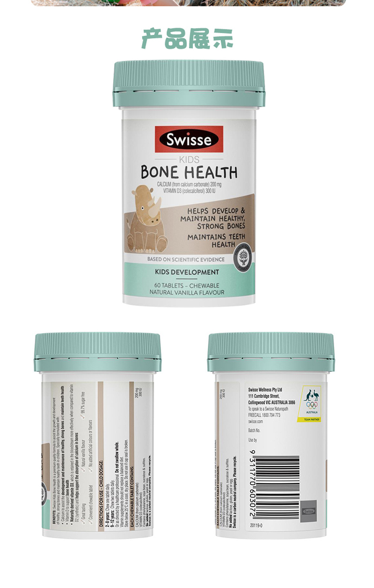 【保税仓】澳洲Swisse儿童钙犀牛钙咀嚼片60片(有效期至25年3月)