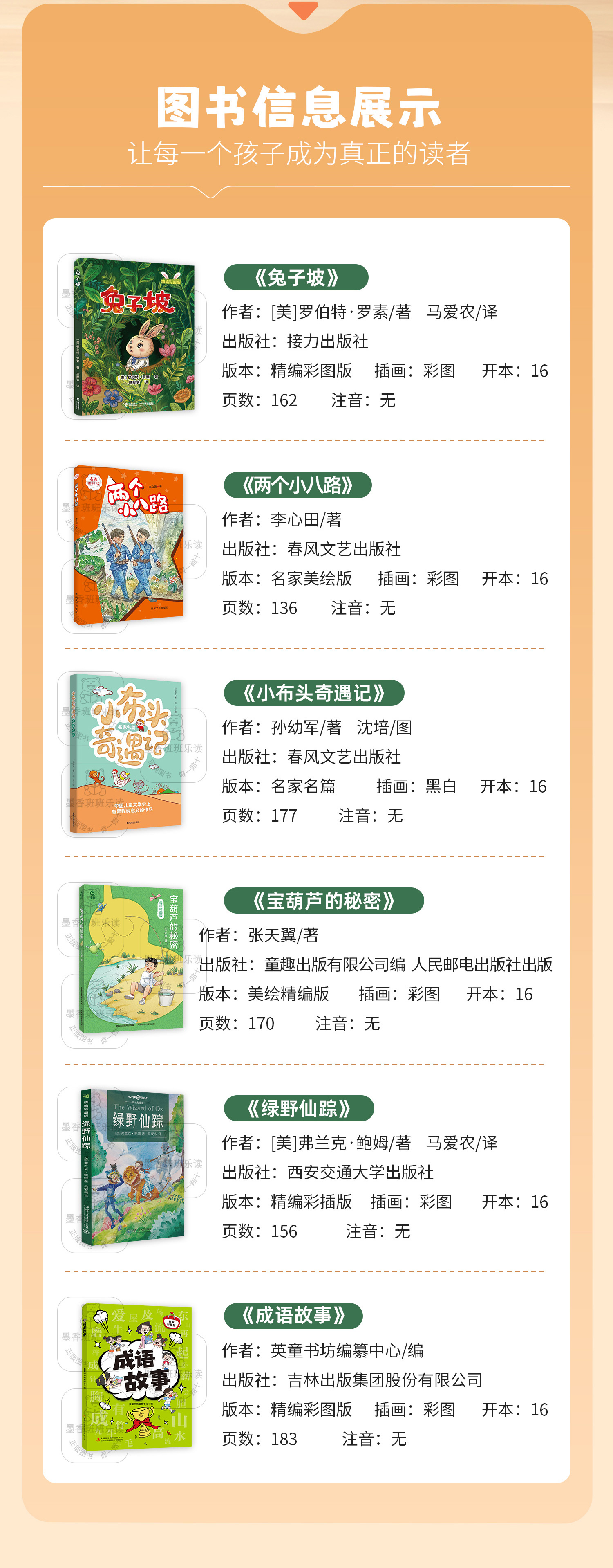 班班25秋三年级【单本】《兔子坡》《两个小八路》《小布头奇遇记》《宝葫芦的秘密》《绿野仙踪》《成语故事》+导读单