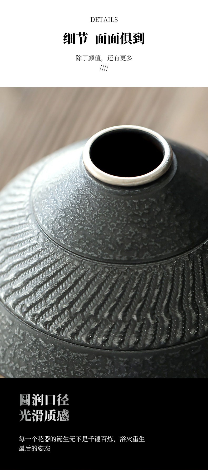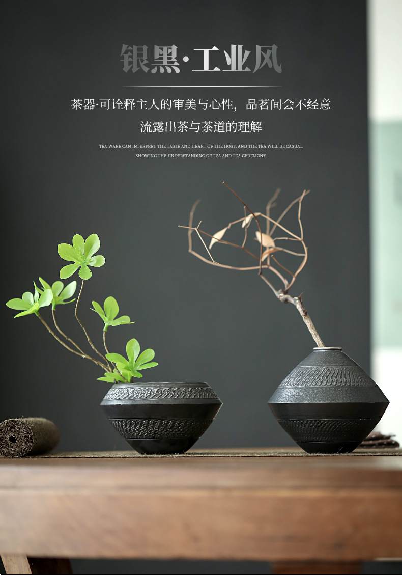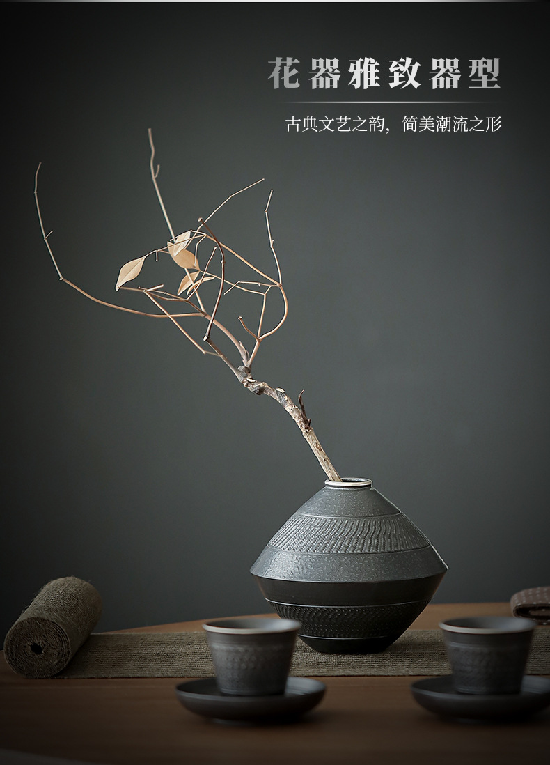 黑玄粗陶手制花瓶复古禅意桌面花器陶瓷花插水培小花插工艺品摆件