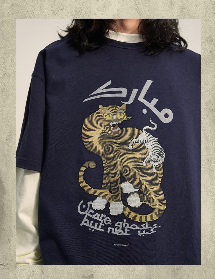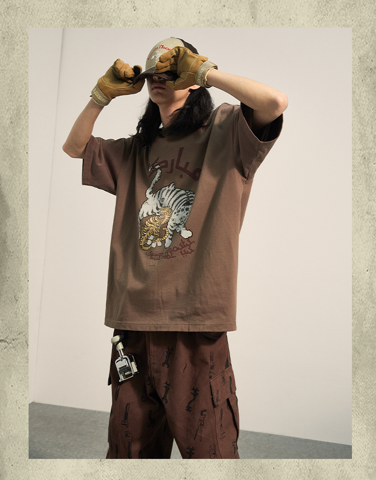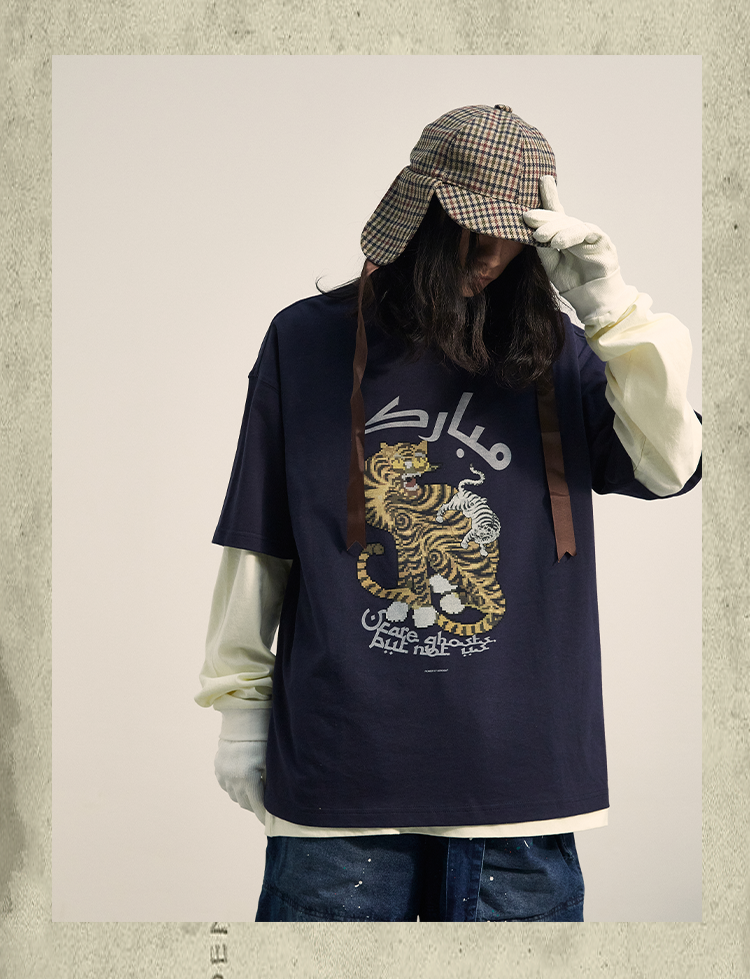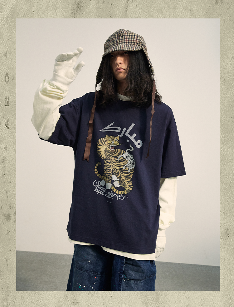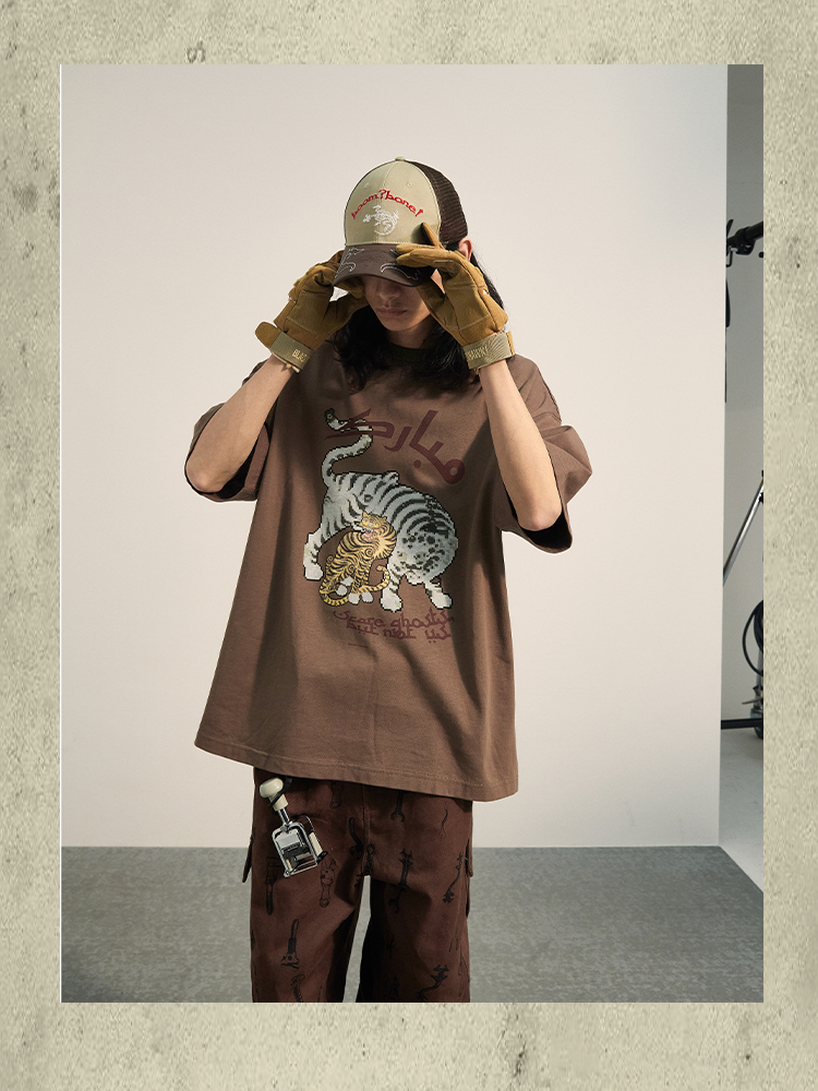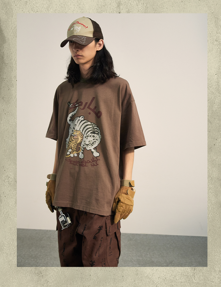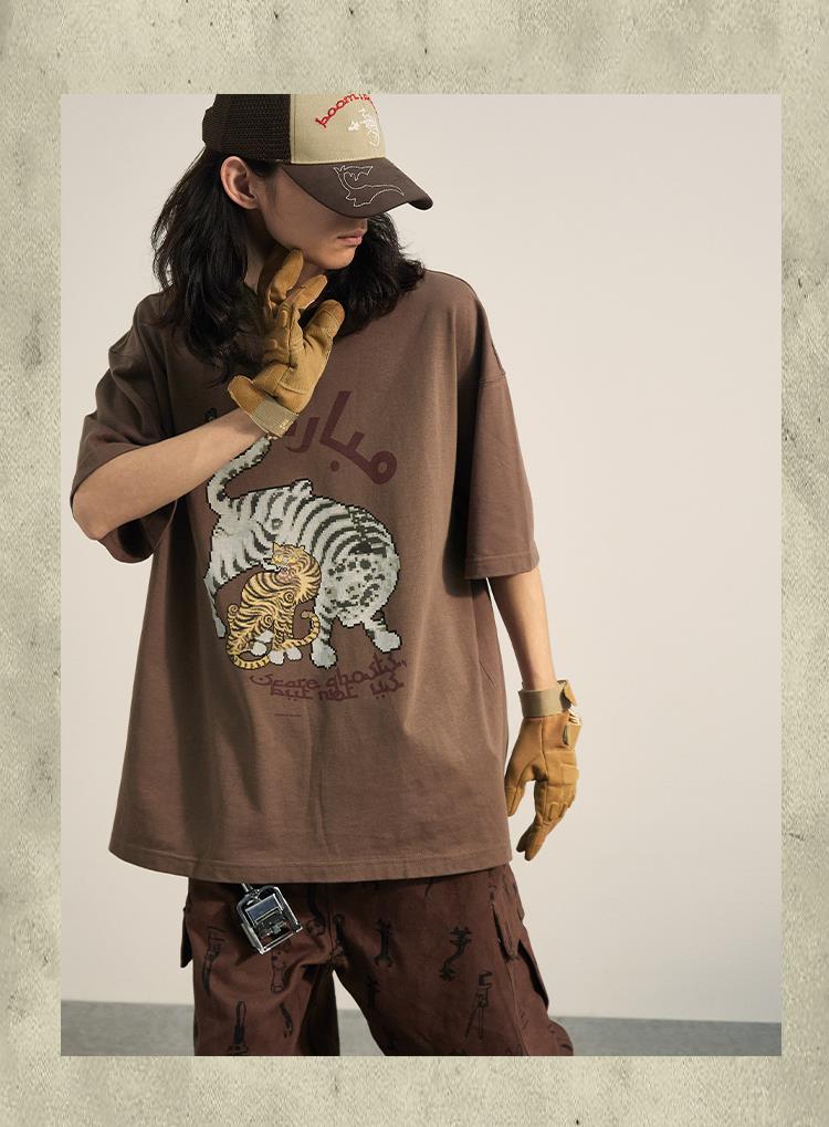 POH「李朝猫虎画」印花街头BF风打底上衣国潮牌宽松休闲短袖T恤男
