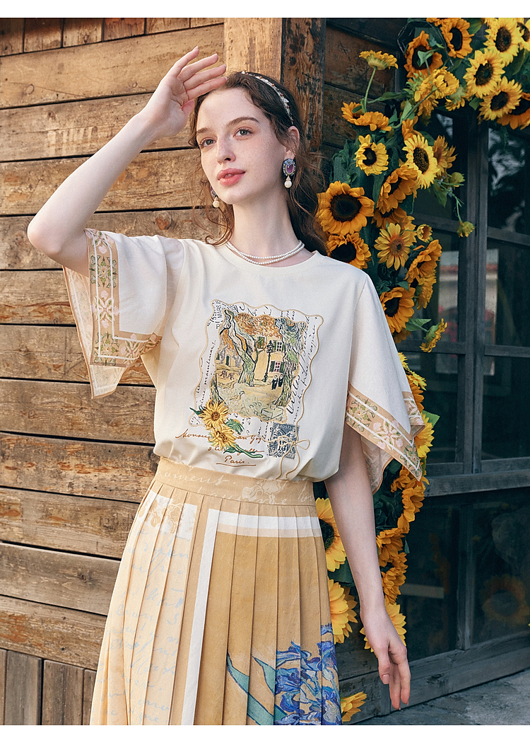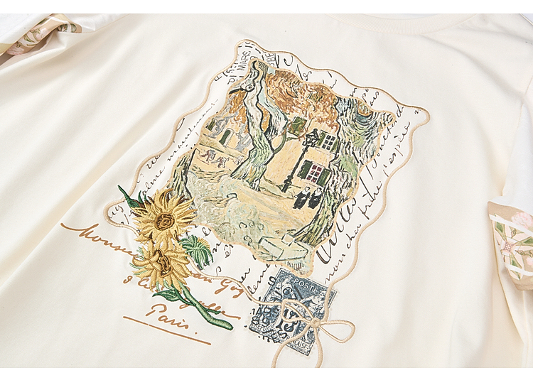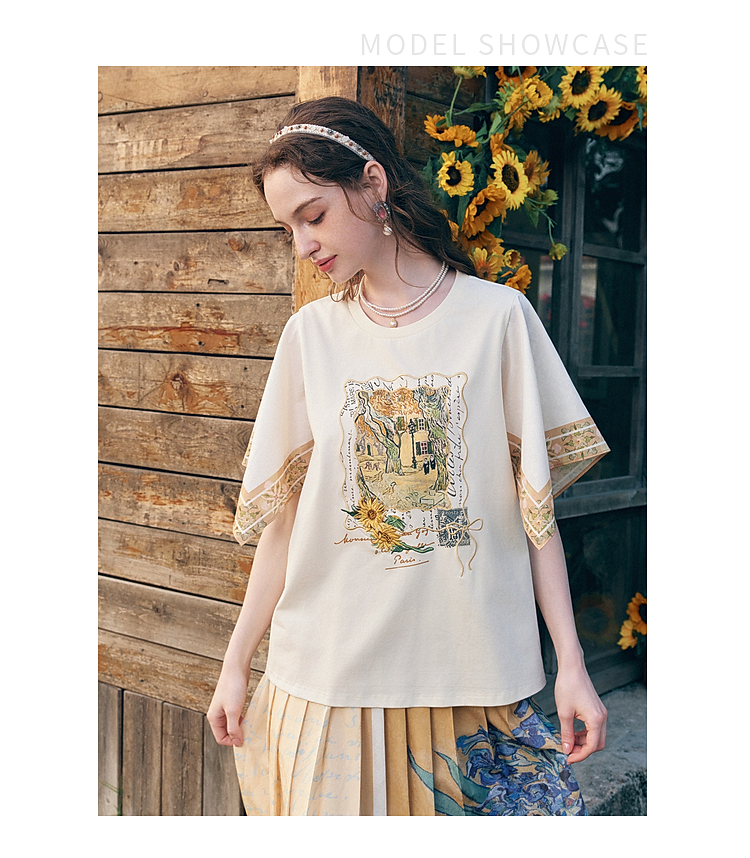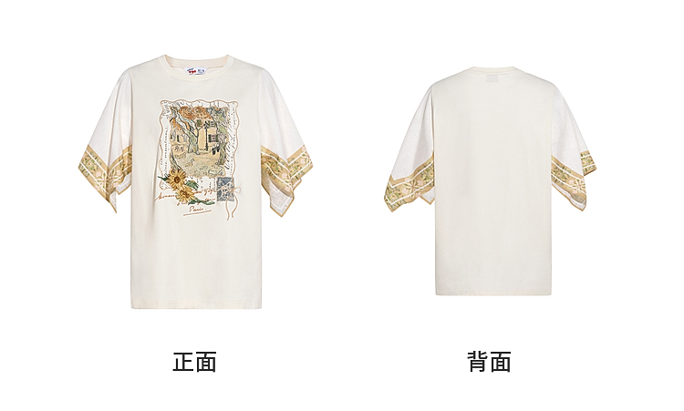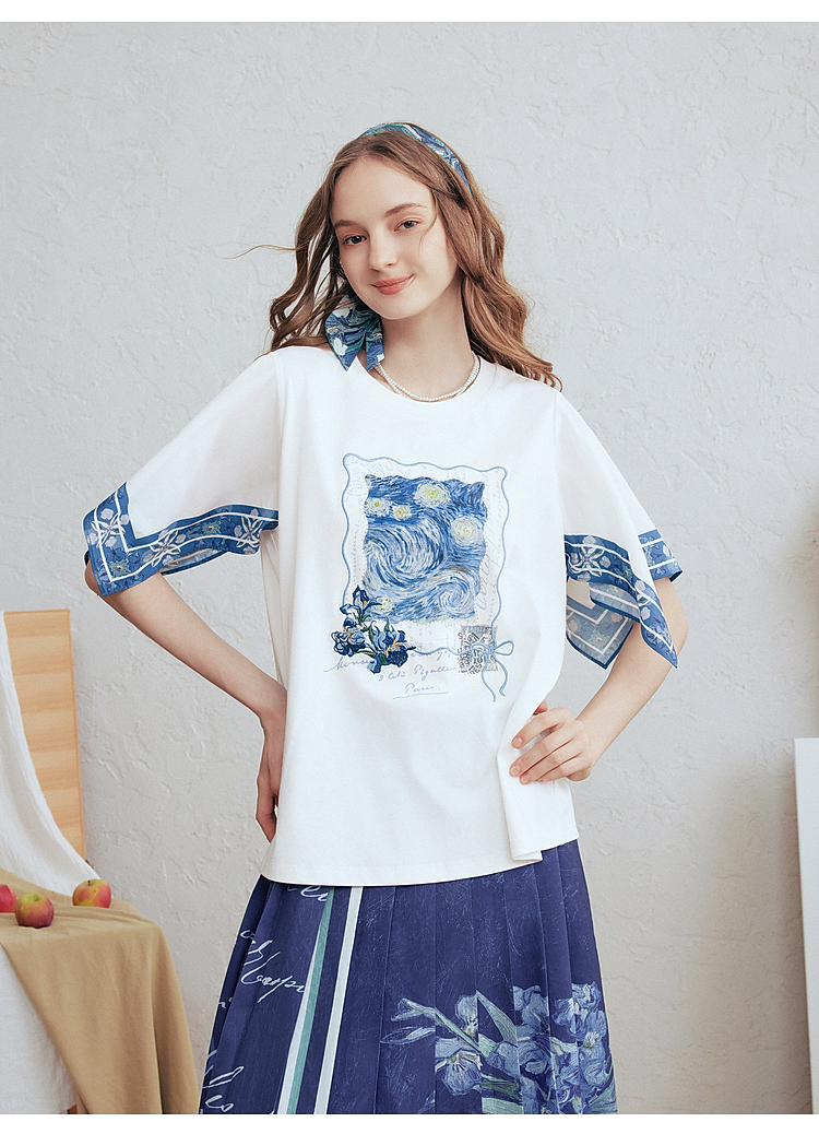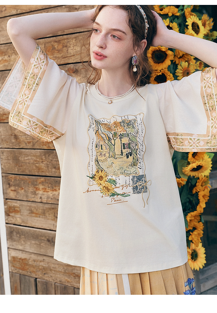两三事梵高文艺风铃纸鸢2026春新款小清新印花不规则袖t恤女宽松