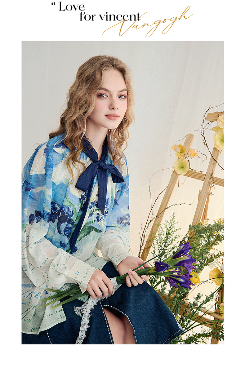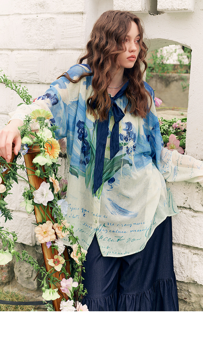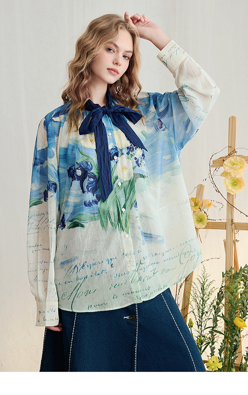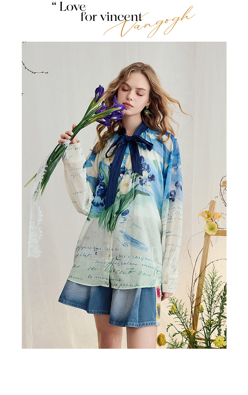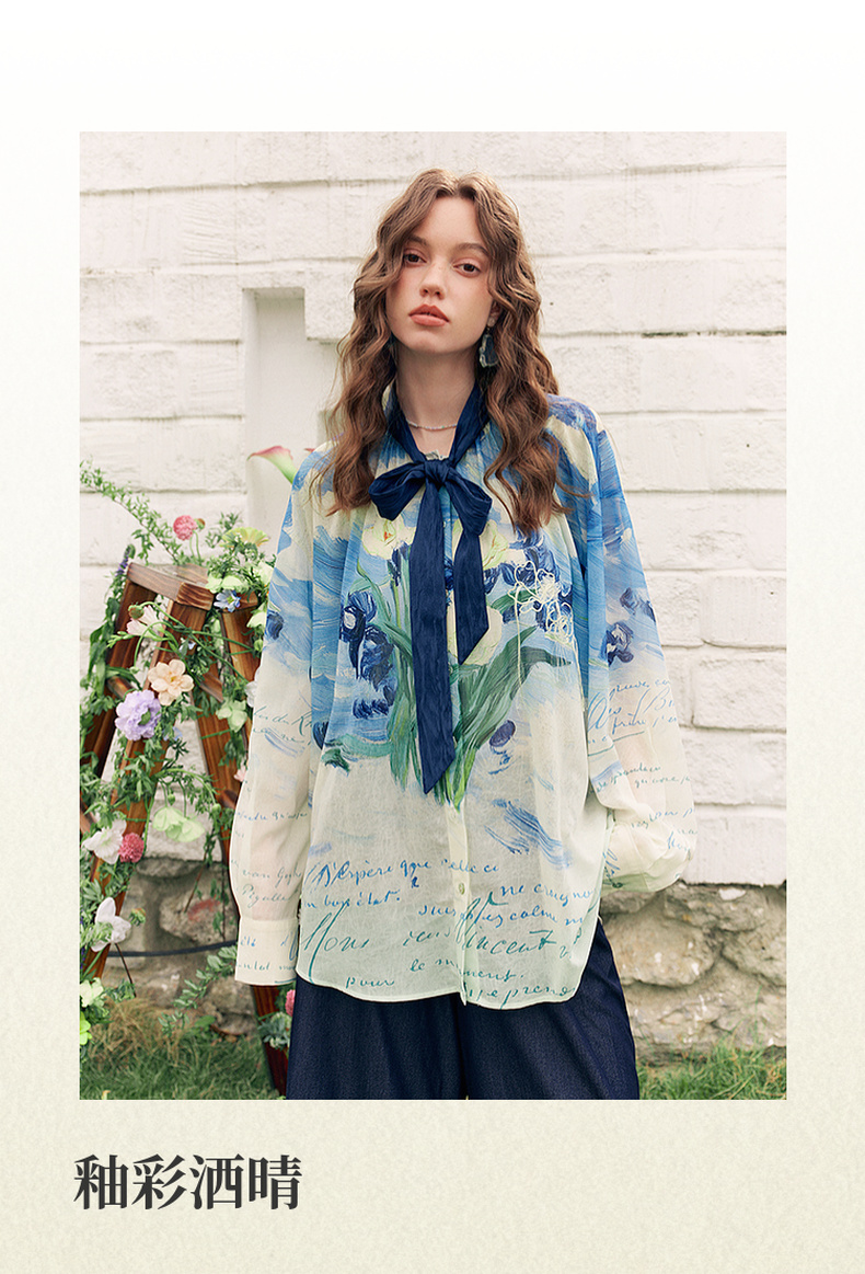 两三事梵高文艺釉彩洒晴2025夏季新款绣花拼色绑带领印花雪纺衫女
