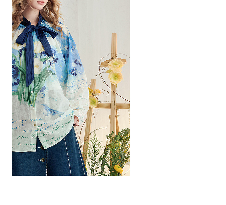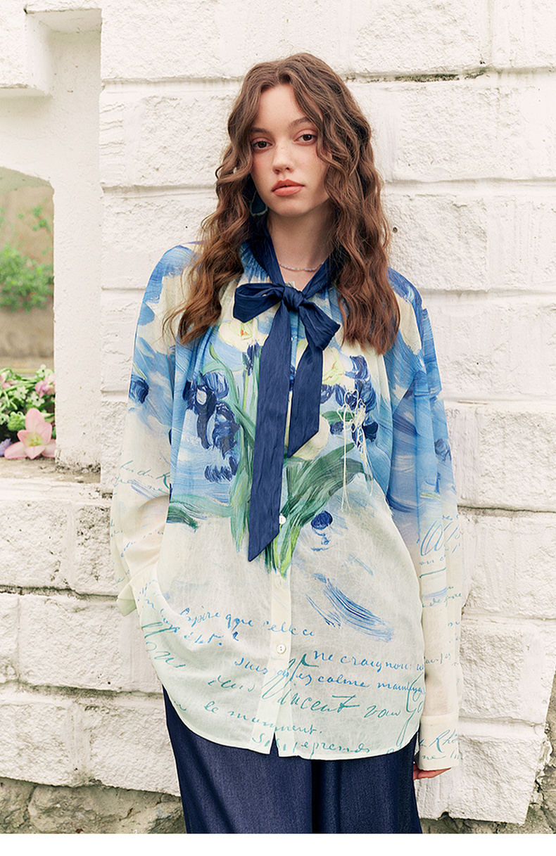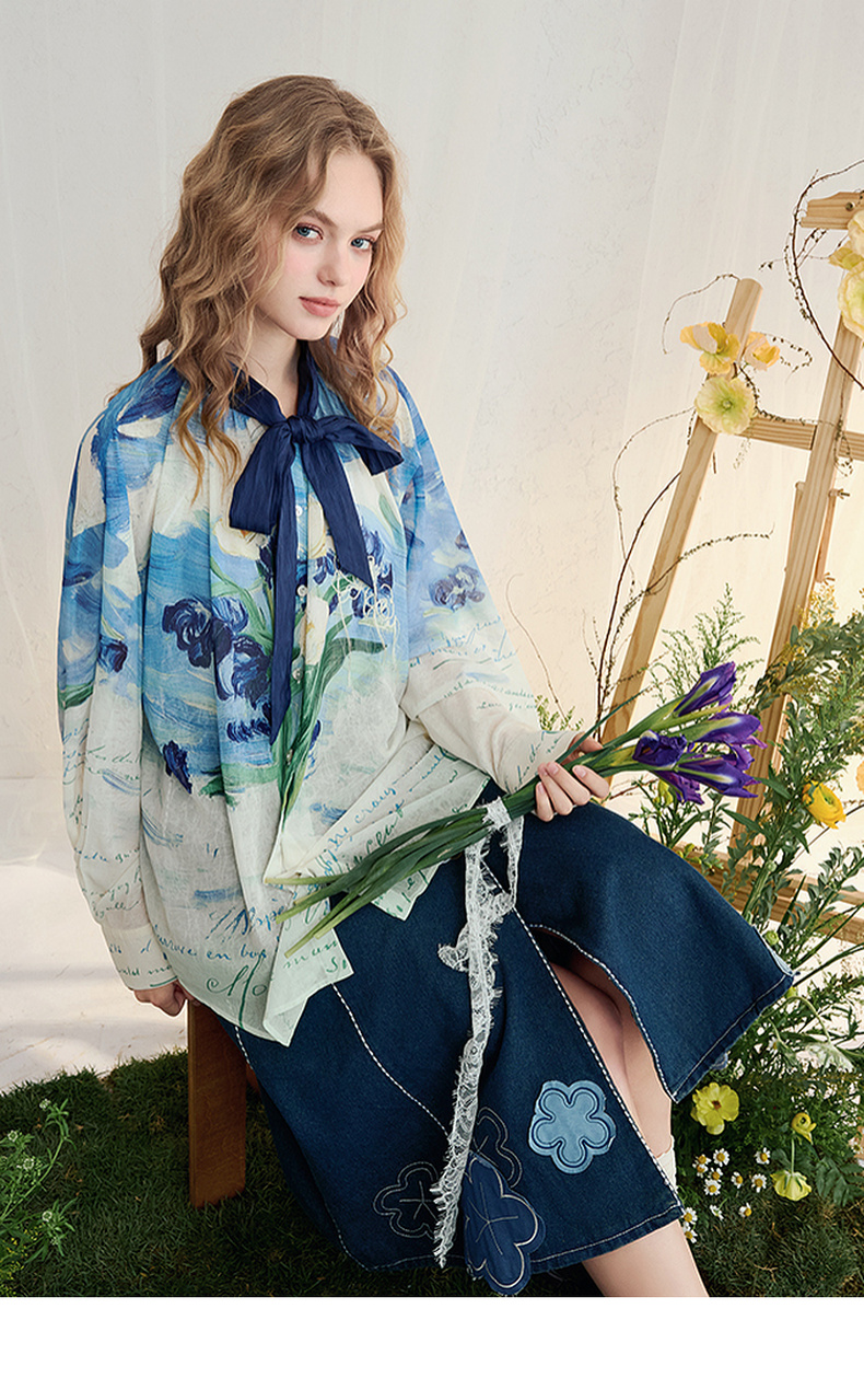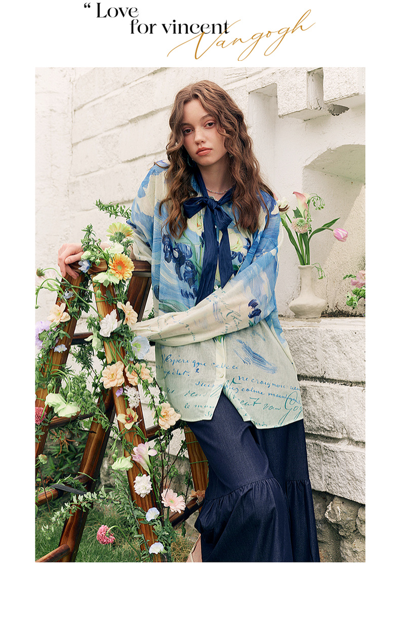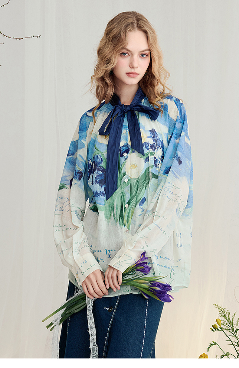 两三事梵高文艺釉彩洒晴2025夏季新款绣花拼色绑带领印花雪纺衫女
