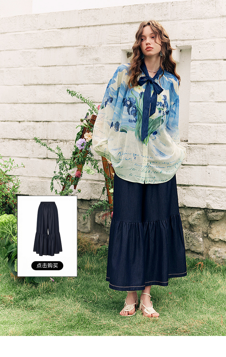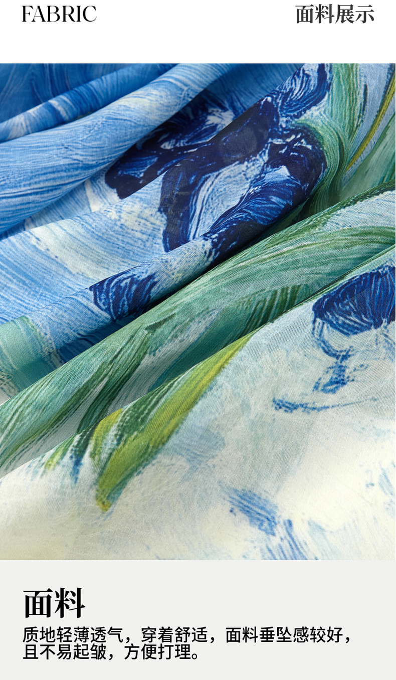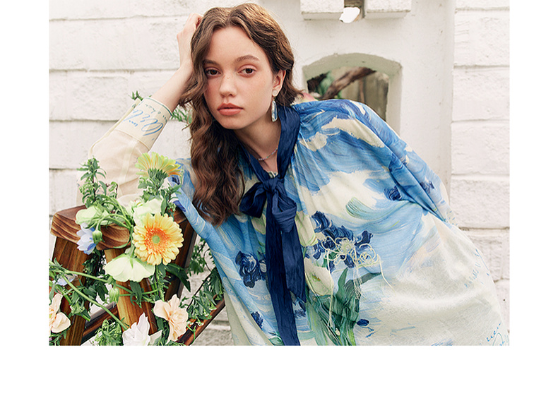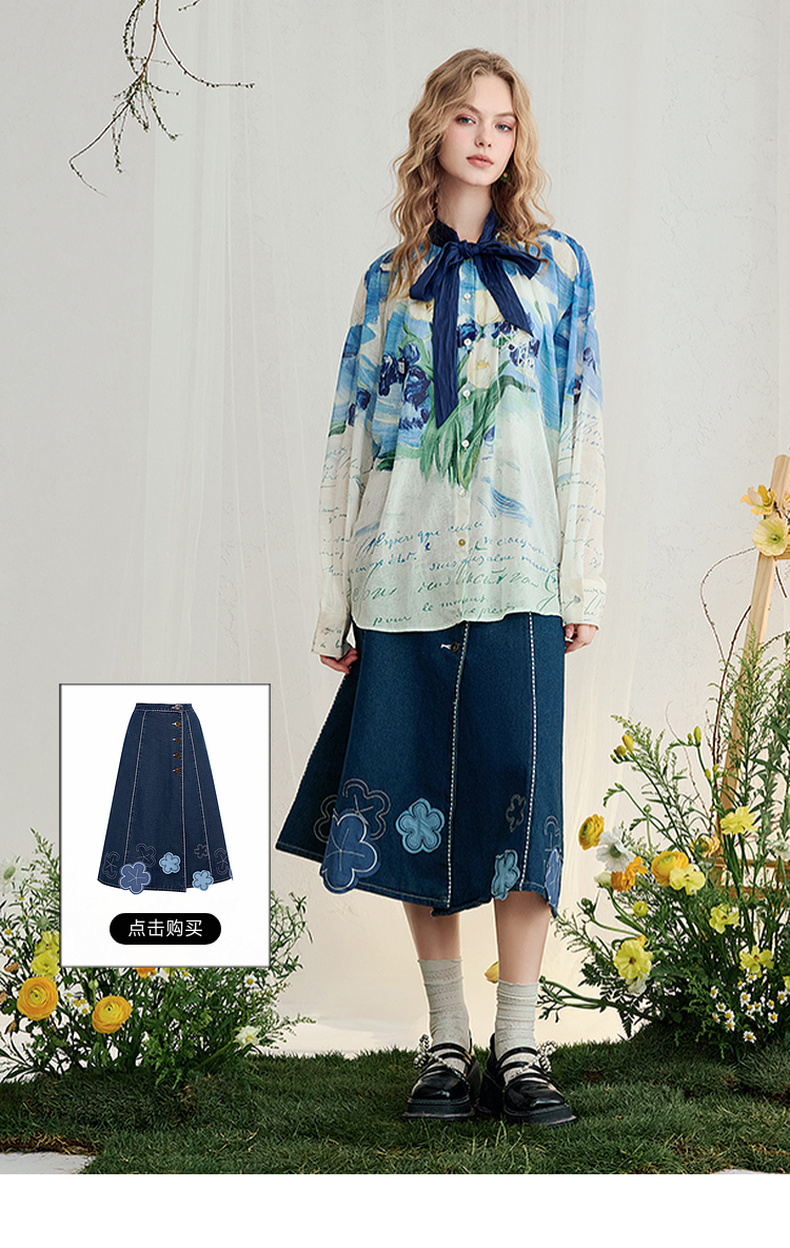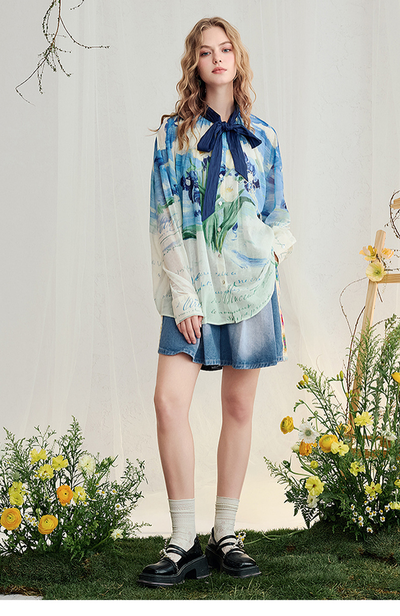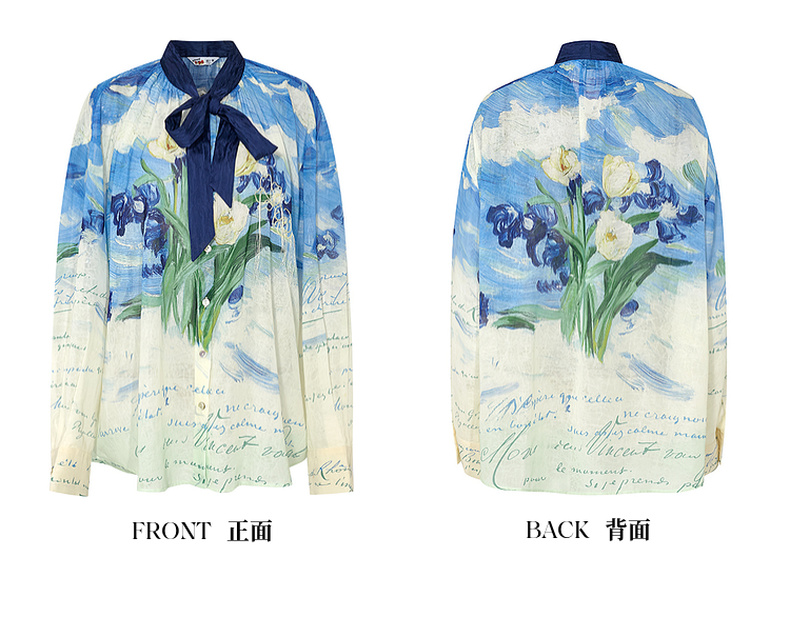 两三事梵高文艺釉彩洒晴2025夏季新款绣花拼色绑带领印花雪纺衫女