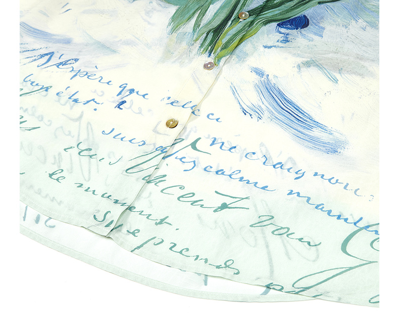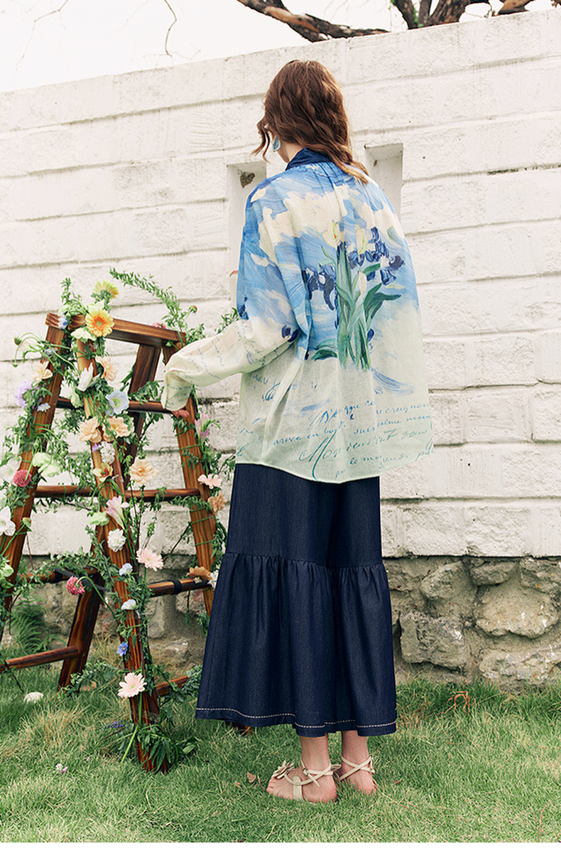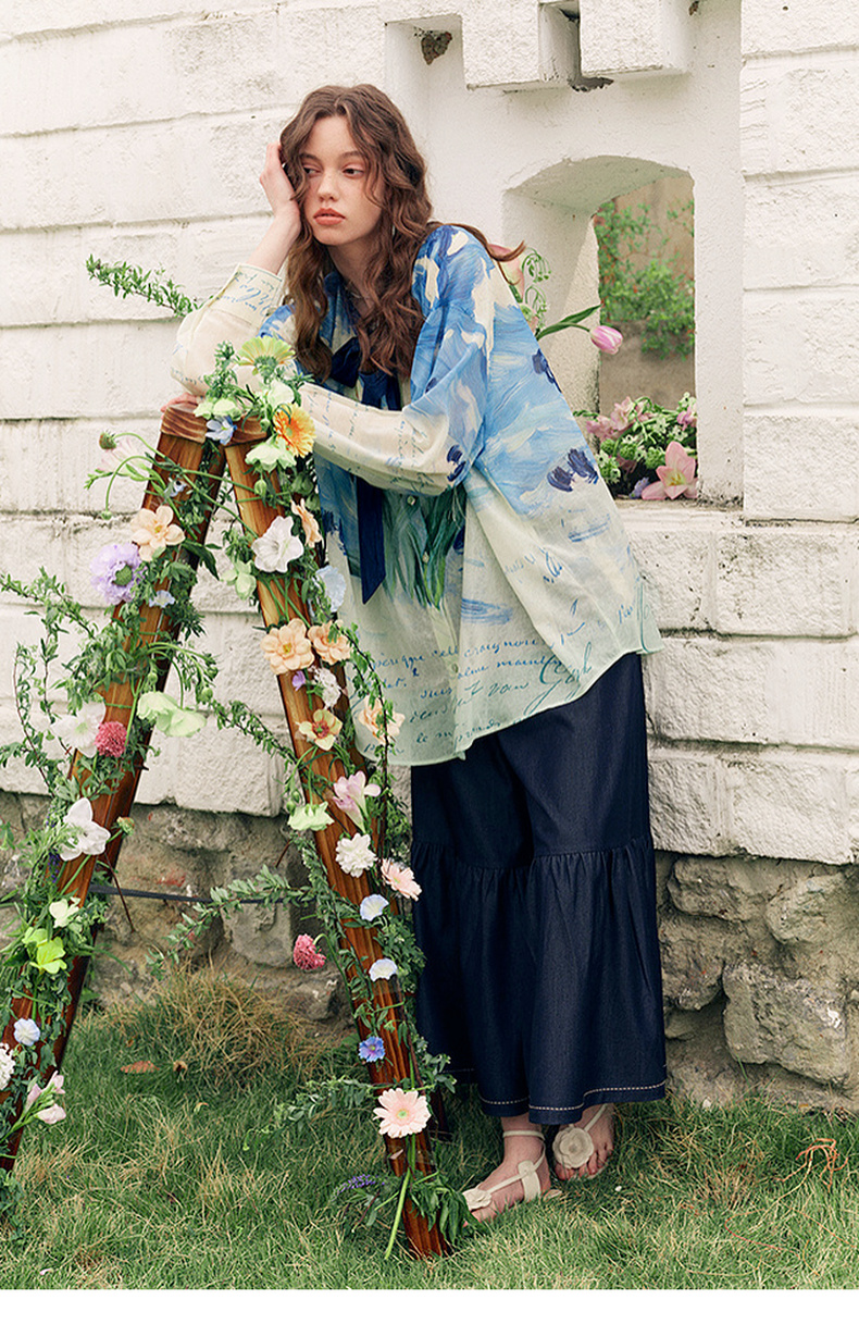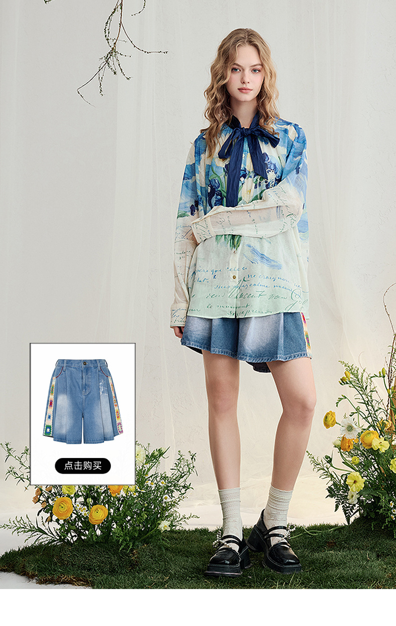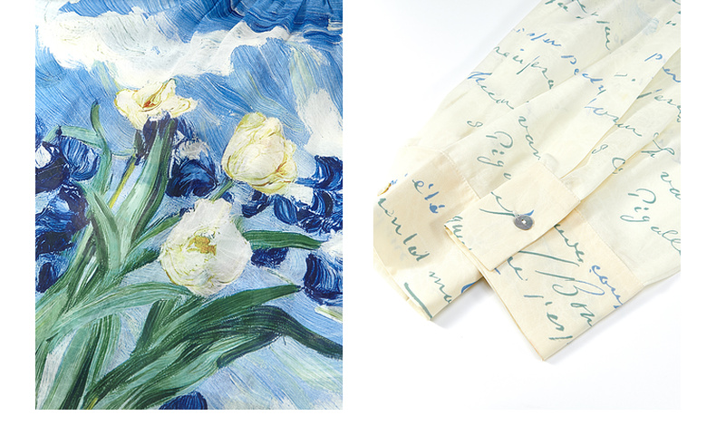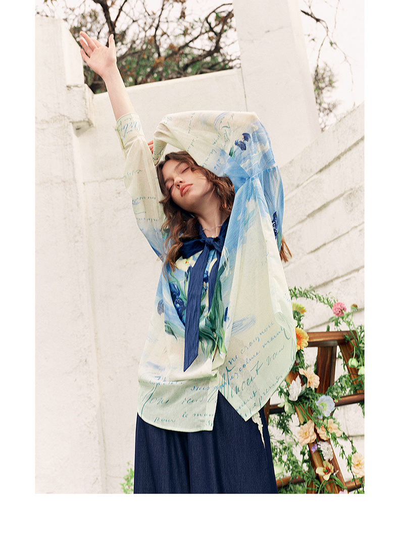 两三事梵高文艺釉彩洒晴2025夏季新款绣花拼色绑带领印花雪纺衫女