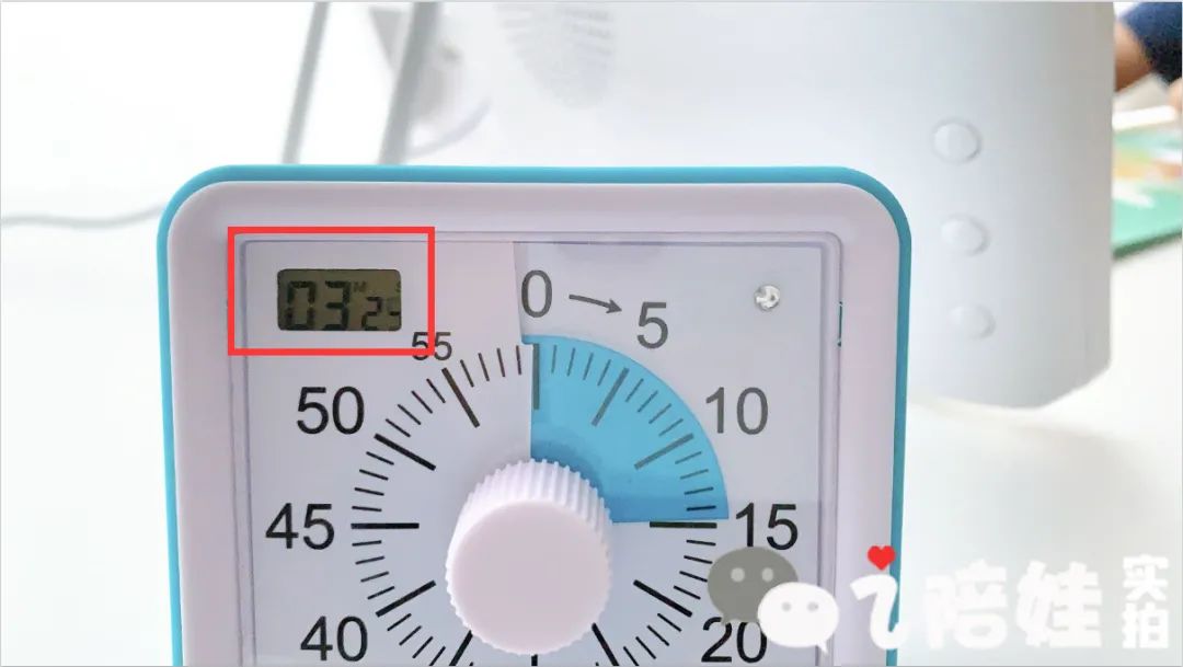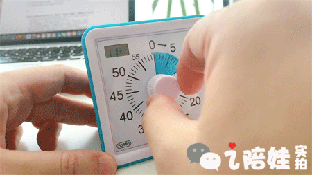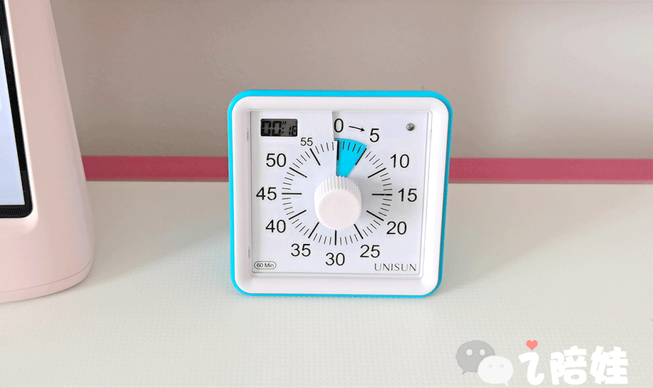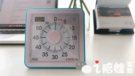 我一直有用计时器的习惯(一是记性不好,一是工作繁多需要),市面上各种各样的,我买过太多种:电子屏、番茄钟、厨房计时器、沙漏……,真的买出了经验。但我很少给芊芊用,因为要不就是按键多设置复杂,导致使用率低。要么就是响铃声大或者走针嘀嗒响的,容易吓一跳和影响专注力。所以我一直想找一个真正能帮她提高效率的计时器。去年,我发现了UNISUN的计时器。平心而论,到目前为止,功能设计是我见过的真的让孩子有时间意识的。我十分喜欢它的剩余时间可视化,就像下图里↓蓝色区域越来越少,说明剩余时间越来越少,芊芊抬头看一眼,不必算时间,只要看蓝色区域就好,特别直观(为了看得更明显,我把视频调快了)。因为时间是很抽象的概念,所以大部分计时器,在孩子时间观念不强的阶段,显得没什么用。比如芊芊小时候看计时屏还剩1分45秒,并没觉得马上要到点了而紧张起来,对电子数字的变化可以说毫无感觉。