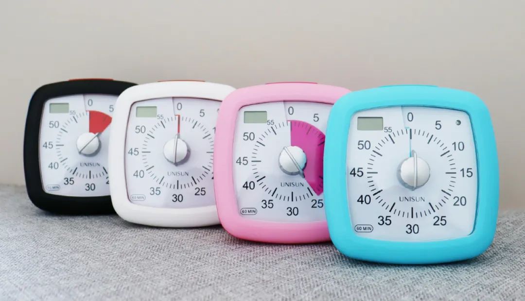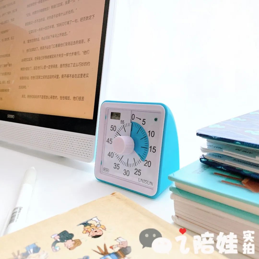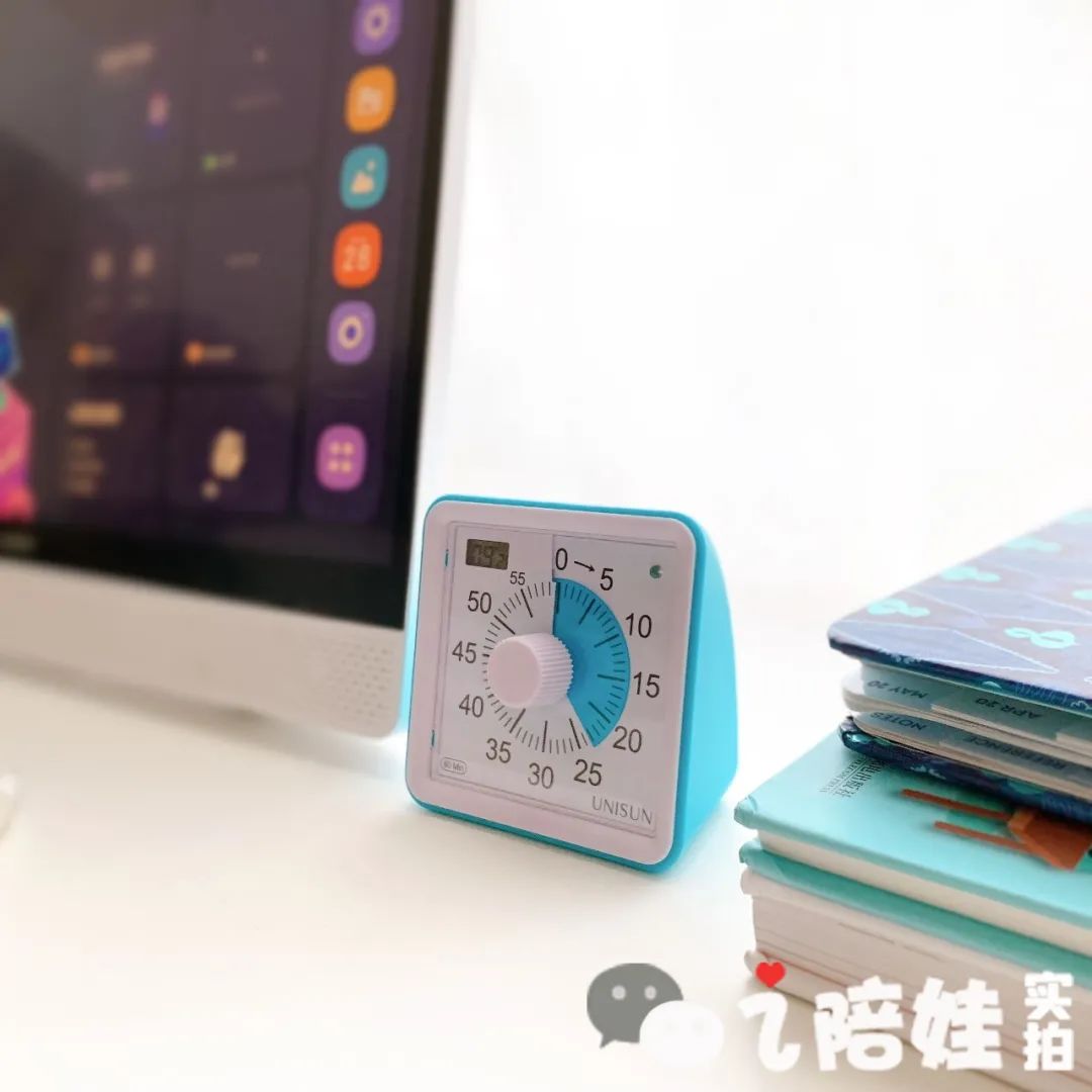 只有沙漏比较直观,我买过一排不同时间的,5min、10min、30min……,一个沙漏只能设置1种时间,并且漏的过程中,无法得知具体剩多长时间。因为是色块显示替代电子屏数字,芊芊写作业用时,拿眼扫一下就知道还剩多少时间。低龄孩子也能做到心中有数,不必琢磨几分几秒是多久。所以我自己很喜欢UNISUN这个设计,顺手发了个圈听听大家意见,结果闺蜜入手后反馈:● 我女儿用这个计时器,做作业的效率确实有提高,原来11点完不了事的,现在有这个明显有紧迫感了,甚至有次多出1个小时的自由活动时间。