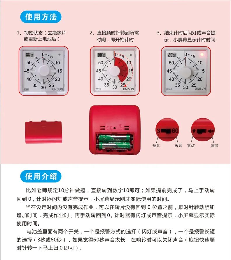 其实我觉得上小学的孩子也不需要多么复杂的功能,但买过这么多计时器,目前就这个UNISUN时间管理器我觉得好用。有了它,就相当于有了一个时间小管家,以我和闺蜜的使用经验来说,好多事情都用得上。让孩子更合理利用时间,提高做事效率。不需要充电,2节7号电池就行。续航能力不错,我家用了这么久还没换过电池。需要设置的都藏在计时器背后,闹铃提醒方式和时长来回拨就能设置。并且可以选择时长,从3秒~60秒,如果闪灯3秒怕孩子注意不到,可以选闪灯60秒。同样,如果切到铃声提示,就是对应的响3秒和响60秒。