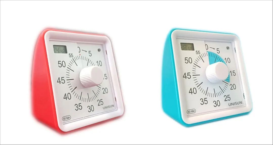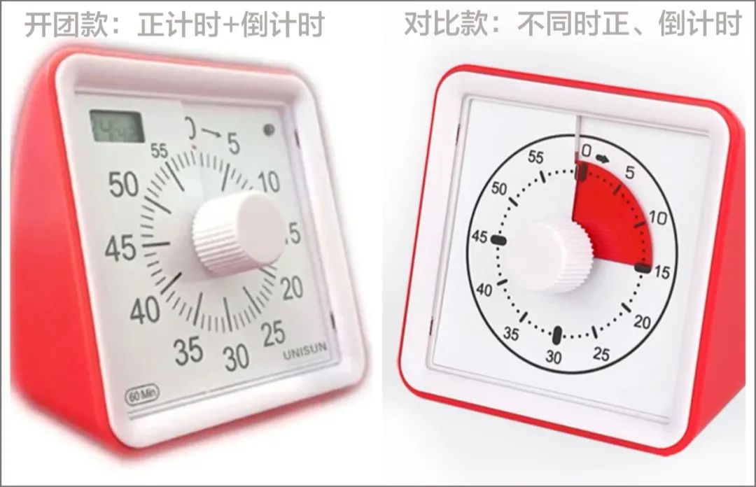 先说外观,虽然UNISUN跟小闹表一样,但它的功能实在够用了。可以同时正计时、倒计时。咱们最常用的就是“倒计时”,蓝区时间逐渐减少,会增加一定的紧迫感,让孩子提高效率。“正计时”也很实用,我以前买过许多计时器,从十几的到几百的,基本没用过正计时功能,我觉得那跟钟表有什么区别啊。但我闺蜜说这个功能她家用的挺多,能让孩子清楚自己完成每一项任务的所需时间。比如做100道计算题,今天用了多久,一周后用了多久,数字屏显清晰明确,进步真真切切看得见。UNISUN的静音效果不错,除非拿到耳朵边或者特别的安静,能听见指针走的动静,平时放手边,几乎听不见声音。而相比之下,左边这个计时器老是“滴滴答答”,孩子会分心,右边这个是台灯上的计时器,不是倒计时,只在左上角那一小块地方显示时间,孩子想知道剩多少时间,先得找到、看清,再计算,界面上还有好多别的信息,孩子很容易被干扰。而UNISUN针对一些安静的使用环境(比如教室、办公室、卧室),可以自行选择适合的闹铃方式,响铃也行,闪灯也行,并且可以选择提示时间的长短,3秒还是60秒。