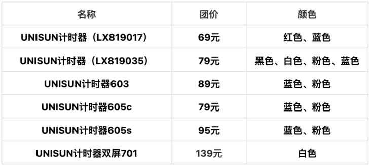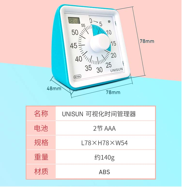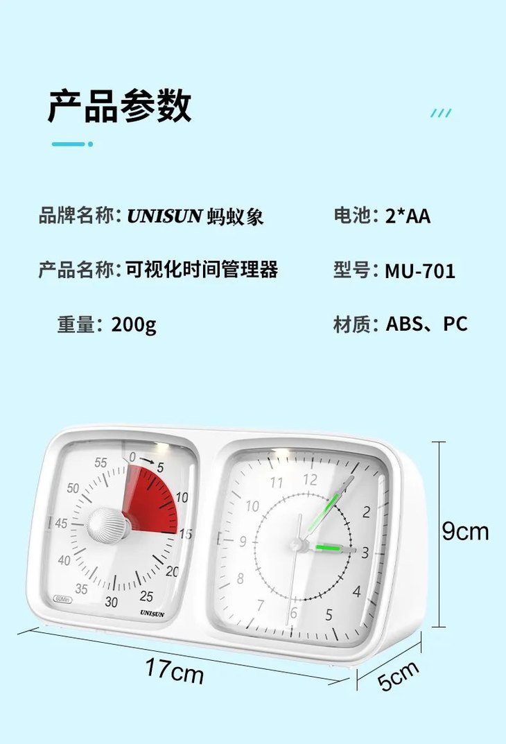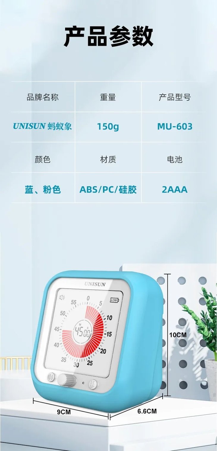 1、UNISUN计时器(LX819017)的大小规格如图所示↓2、UNISUN计时器(LX819035)的大小规格如图所示↓1、UNISUN计时器(603)的大小规格如图所示↓2、UNISUN计时器605c的大小规格如图所示↓3、UNISUN计时器605s的大小规格如图所示↓4、UNISUN计时器(双屏701)的大小规格如图所示↓这个UNISUN计时器,跟十几块钱的计时器比不算便宜,但这个可视化功能孩子真挺受用,而且其他功能也很全,比我买过100、200的要好用。