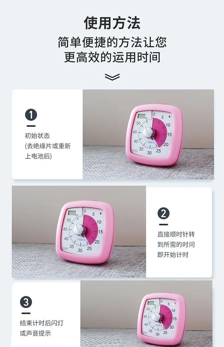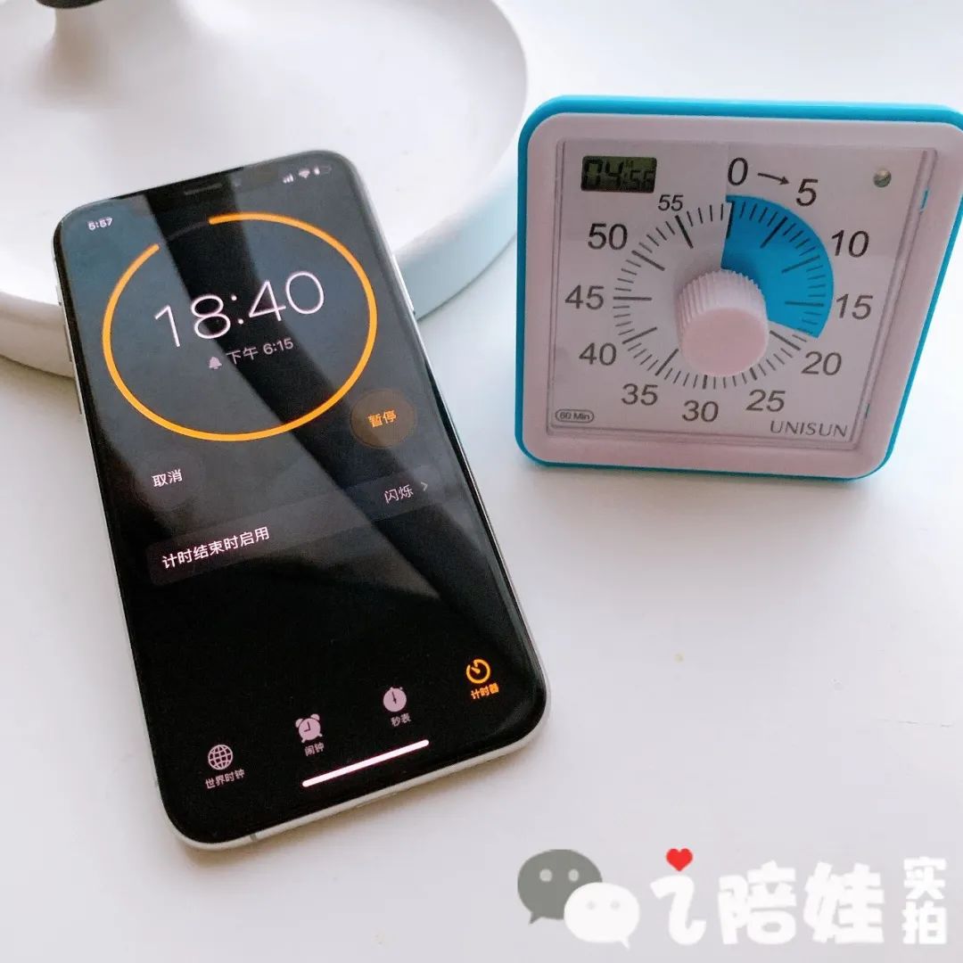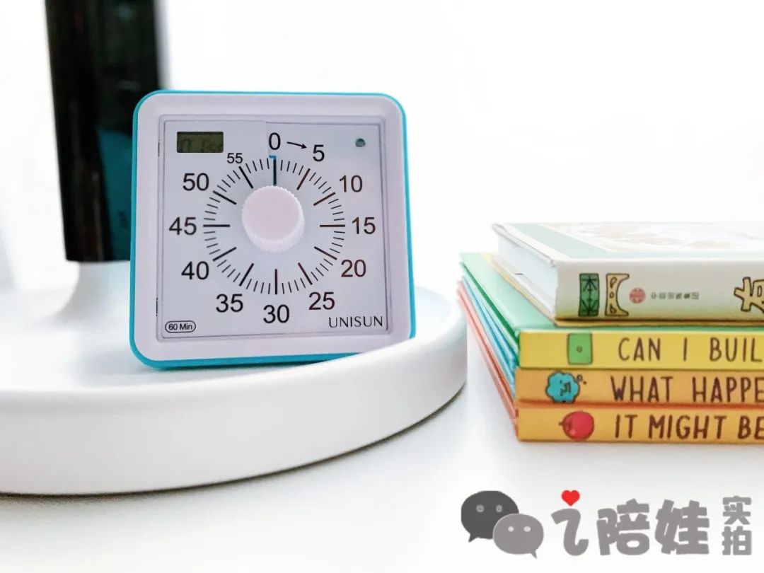 她们用的很多情形,正是我们聊天时吐槽孩子最多的。而这个可视化小计时器,找到了一个关键点,把时间变直观了,结果就见效了。市面上有少数相似的设计,我对比完,觉得还是这款更好使,下面说说我的几个体会。比如有的没有闪灯,就是说需要安静的时候不适合用。像自习室、办公室,还有晚上学习时,总之一切安静的时候,闹铃都显得格外刺耳。但UNISUN是可自定义响铃或闪灯2种到时提醒,适用情况更多。没用过的人,可能不懂这个设计细节有多大用处。像我和几个闺蜜常用的了解,孩子专注时,会被铃声突然吓到。还有芊芊这种敏感的孩子,她很怕响铃,铃声让她焦虑,总瞄着快到点赶紧关上。用闪灯来替代,她就不会觉得紧张不舒服。每次这种时候,我就特别感动,这个设计是真的有在深入调研使用人的痛点。还有同时显示倒计时和正计时,比大多数同类计时器方便。因为你一定想不到,它有“防作弊”效果如果孩子偷着拧了时间,对照下正计时和倒计时的显示就能发现了。还有就是操作简单到1秒就能设定好,可以改动,可以回拨,我敢说2岁也会用。不像很多计时器,从分到秒,甚至年、月、日,一下一下地按个没完。我买过按错要从头来的,所以后来再买,第一诉求就是操作必须简单。除此之外,UNISUN的性价比更高。实话实说,我第一次见到,心里只想说一两百也要买,结果售价才几十。其他相似设计的售价有的在140元左右,够买2个UNISUN,功能还没它全。唯一的小bug:1分钟定时比较不准,倒计时1分钟,它的正计时显示49秒,2分钟倒计时,正计时显示1分42秒,时间太短的话,会有误差十几秒的样子,做不到精确计时,不过我觉得不影响使用。毕竟又不是秒表,1~2分钟的计时很少用,或者用时多拧半个格就行。稍微长一点,比如5分钟,我测试正计时和倒计时基本一致。接下来我把要详细说的先做一个目录,方便你们直接跳到想看的部分哈: