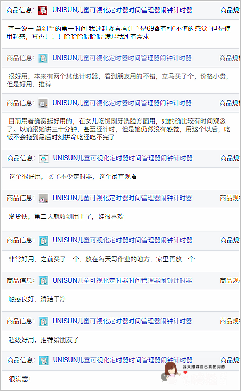 ● 2是我会收集大家的反馈信息,买过妈妈遇到新问题也会给大家集中说下。这个计时器断货了好几次,尤其是第一次推荐时候,当天我让品牌方给大家留的1500套就没了,陆续都是到了多少就赶紧大家补上。我理解它为什么这么受欢迎,它确实懂孩子的需求,把计时可视化,一键操作也很简单,而且其他小细节也都是咱们之前看重的。大家收到以后反馈也都很好。