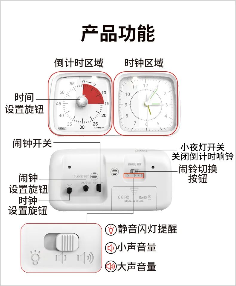 1.内置高端扫描机芯,静音无声 2.还增加了暖心小夜灯,晚上也不用担心看不到时间了 3.顶部触摸键开启小夜灯,暂停响铃。时间表上下午区分,缺电提醒,声音有3种模式可选 4.旋转按钮,孩子都可自主操作的定时按钮背部按钮:可调节时间12/24小时制。 5.常按SET进入时间设置和闹铃音量的调节 6.605S充电款:背部USB充电可充满电运行,供电DC-V5V,电池容量1200MAH 7.605C电池款:装有2节AA电池,正常使用6-12个月UNISUN蚂蚁象视化话时间管理器,让孩子更好的掌握时间,自觉学习! 8.有俩款规格可选:USB充电款和电池款。均有红色和蓝色可选 |
