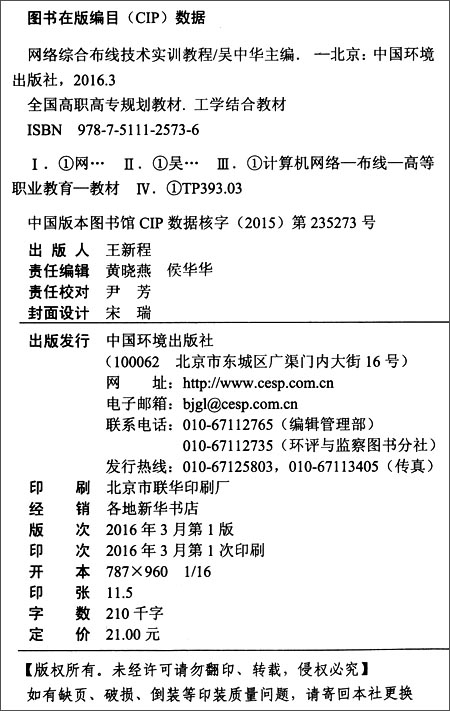 网络综合布线实训教材 全国高职高专规划教材 工学结合教材 吴中华 环境保护 9787511125736
