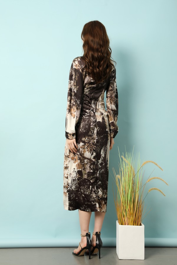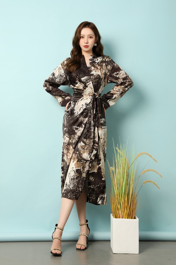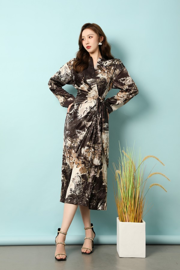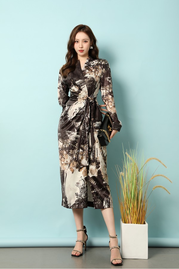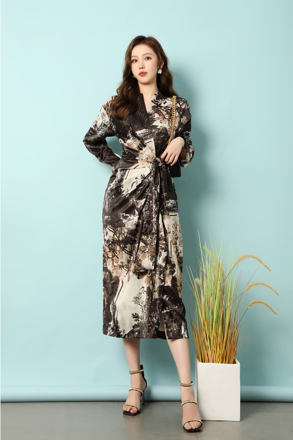 ANSUABEL 中式水墨印花光泽感醋酸连衣裙 18185