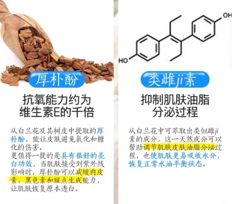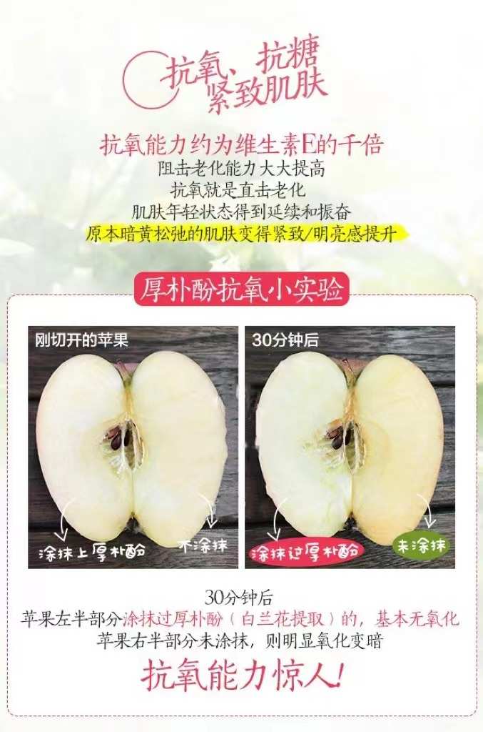 功效:优雅独特的东方温柔香,透白抗氧抗糖,富含抗氧化成分朴厚酚,抗氧化抗糖能力是素生维E的千倍。