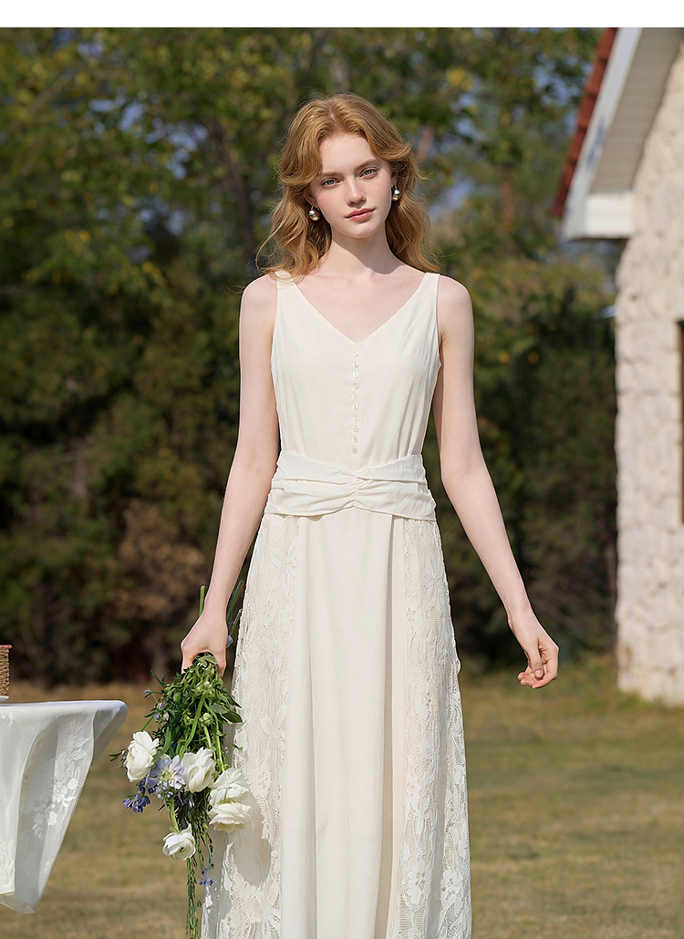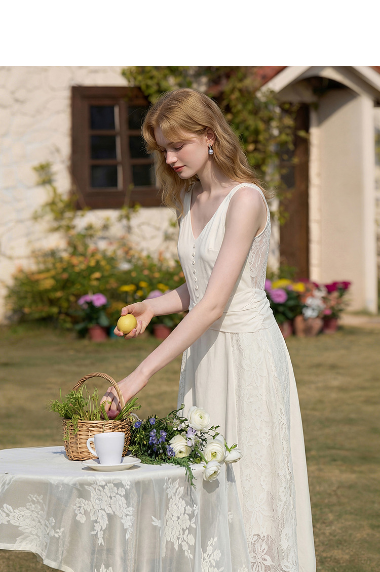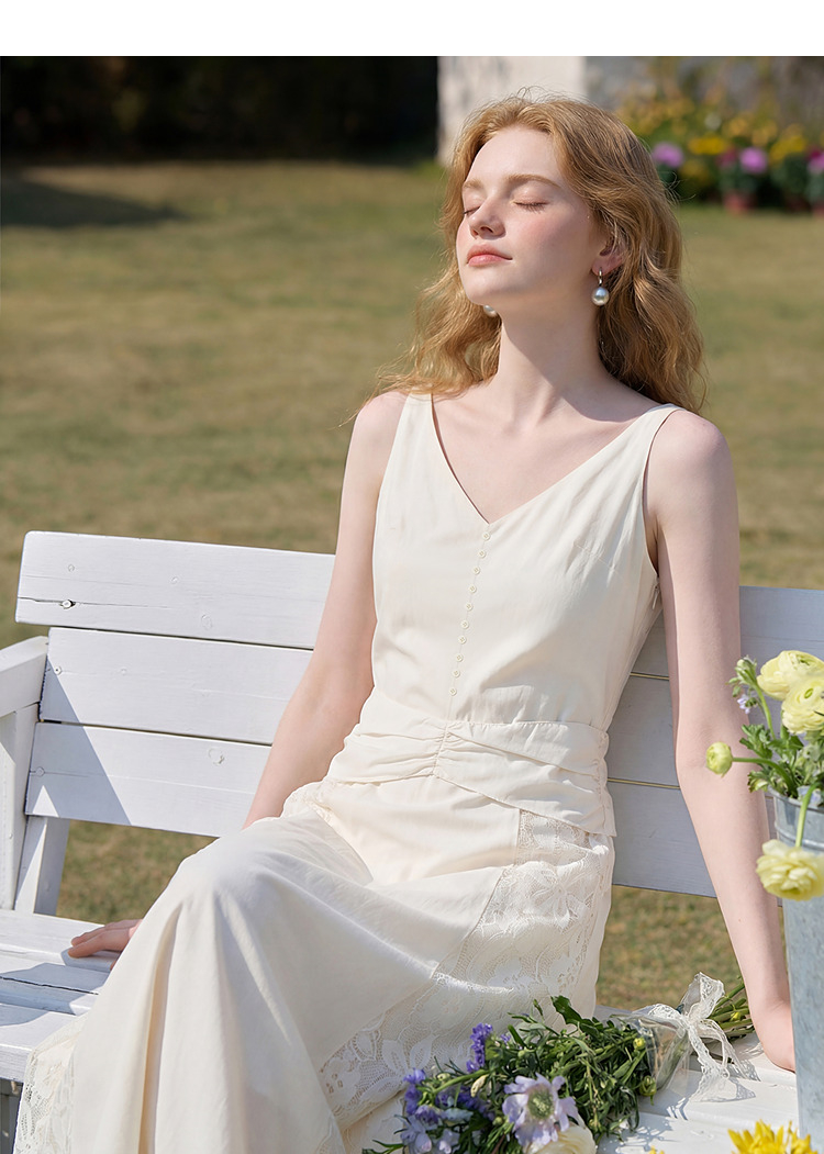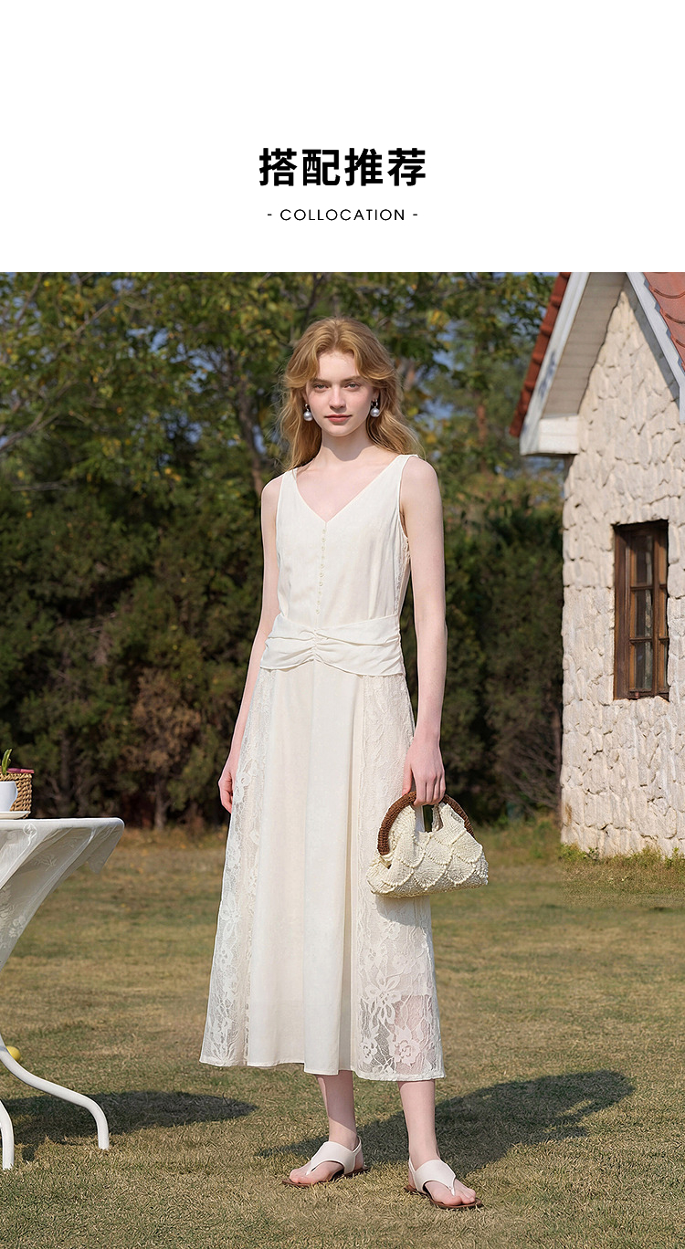 西遇法式V领吊带连衣裙女2026夏季新款重工蕾丝拼接气质背心长裙E0060266