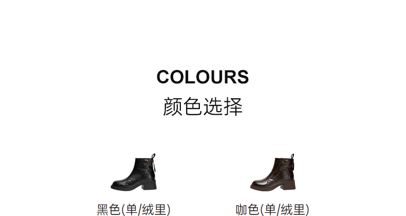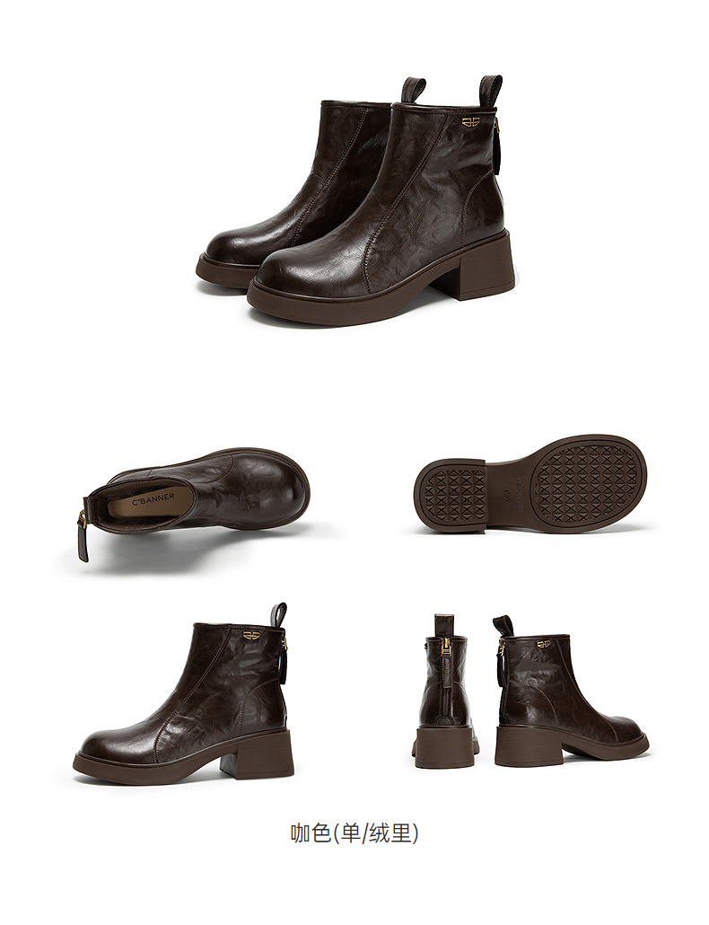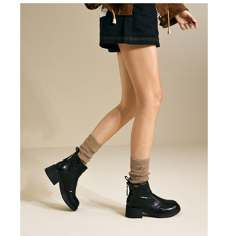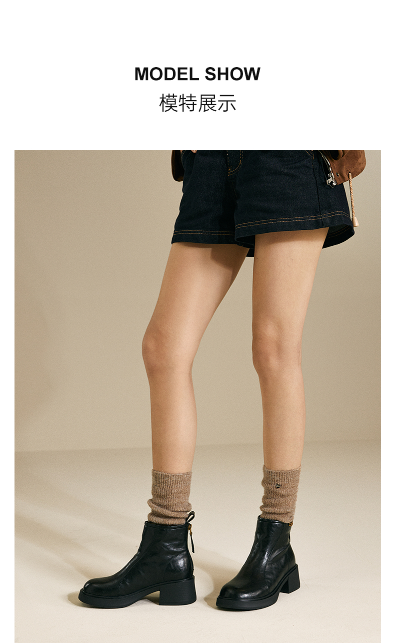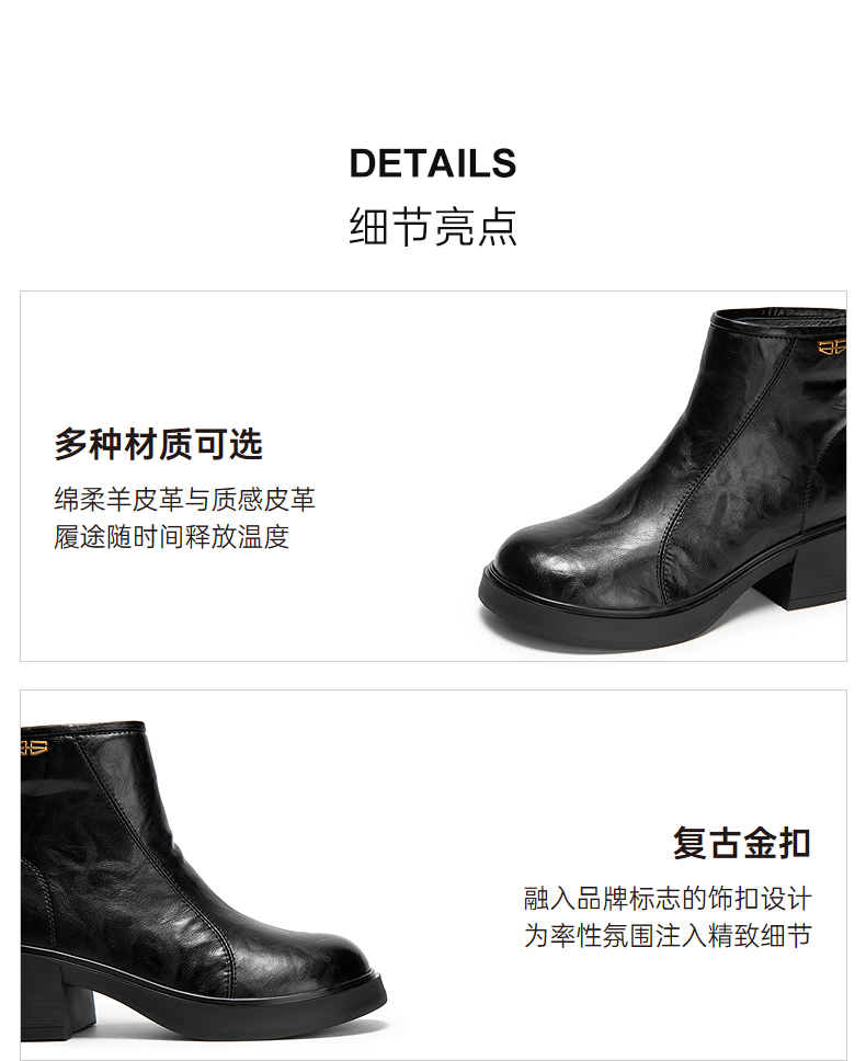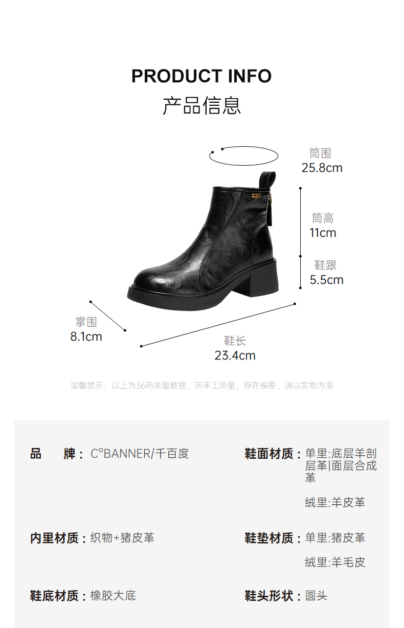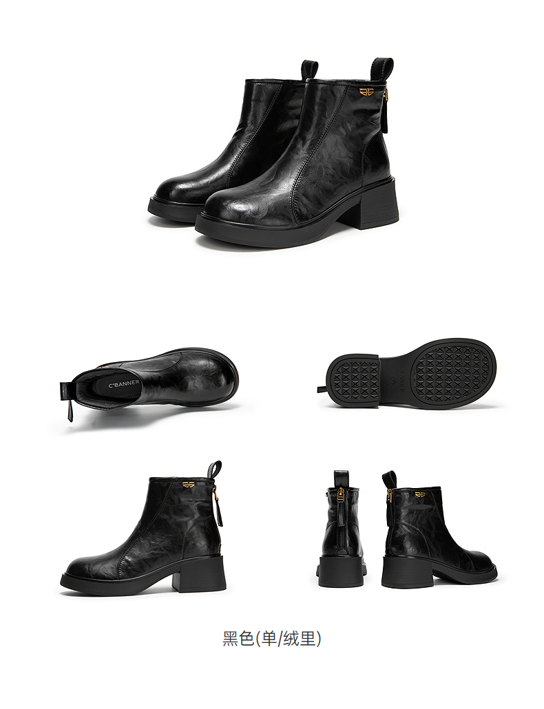 千百度粗跟切尔西靴女厚底羊皮靴增高加绒保暖短靴子A25552504