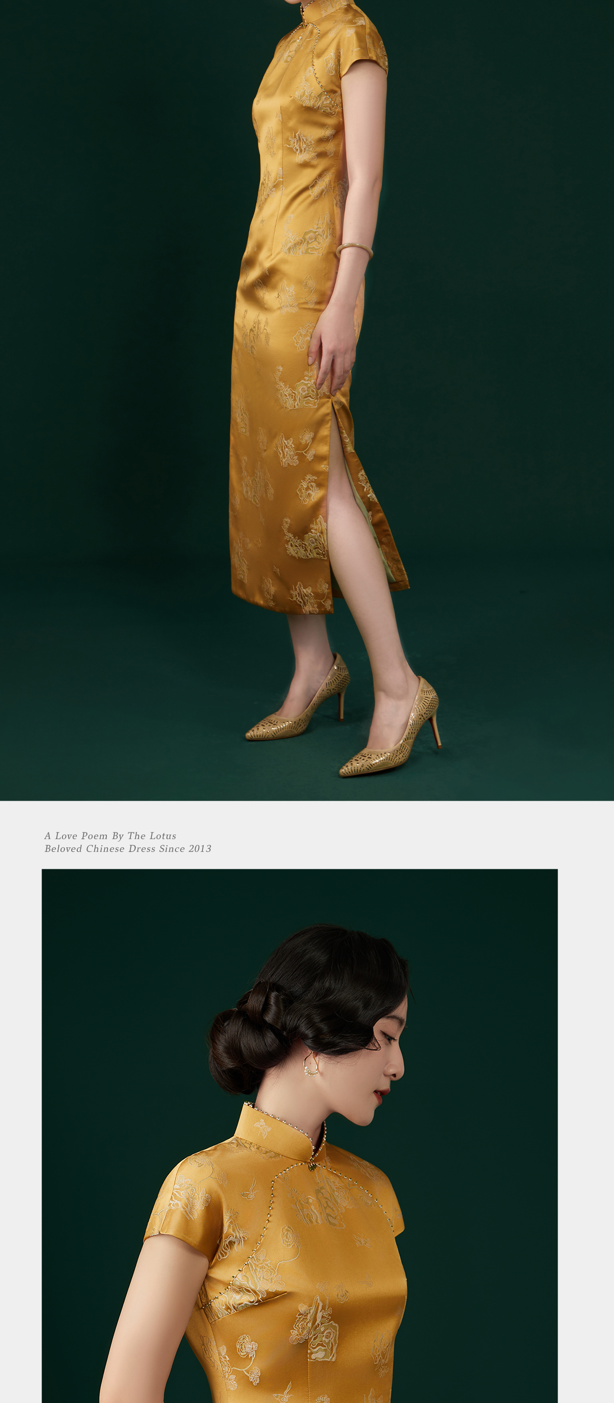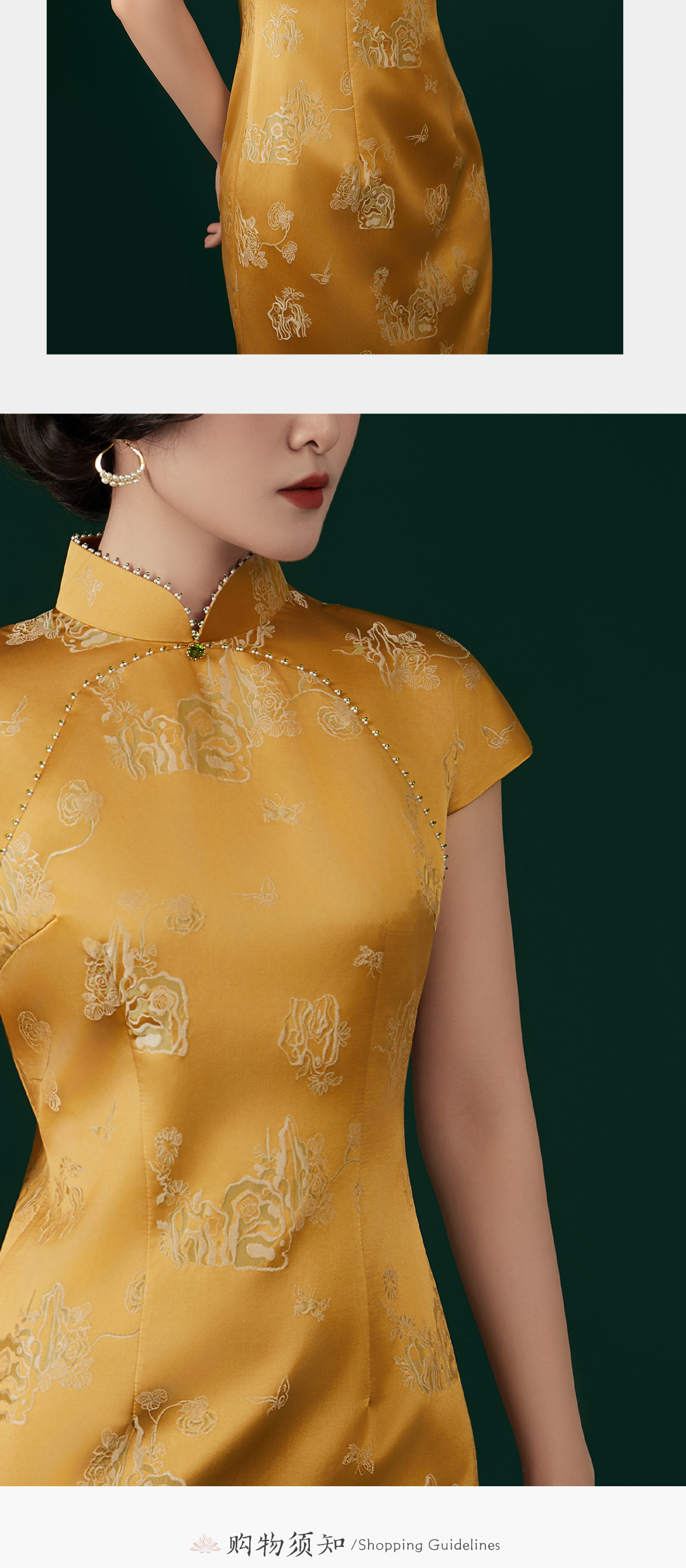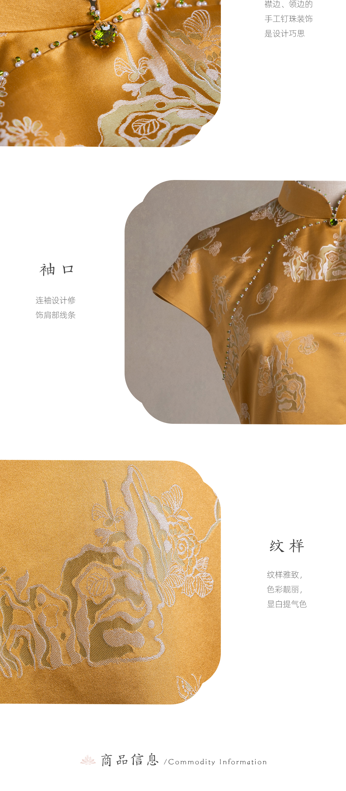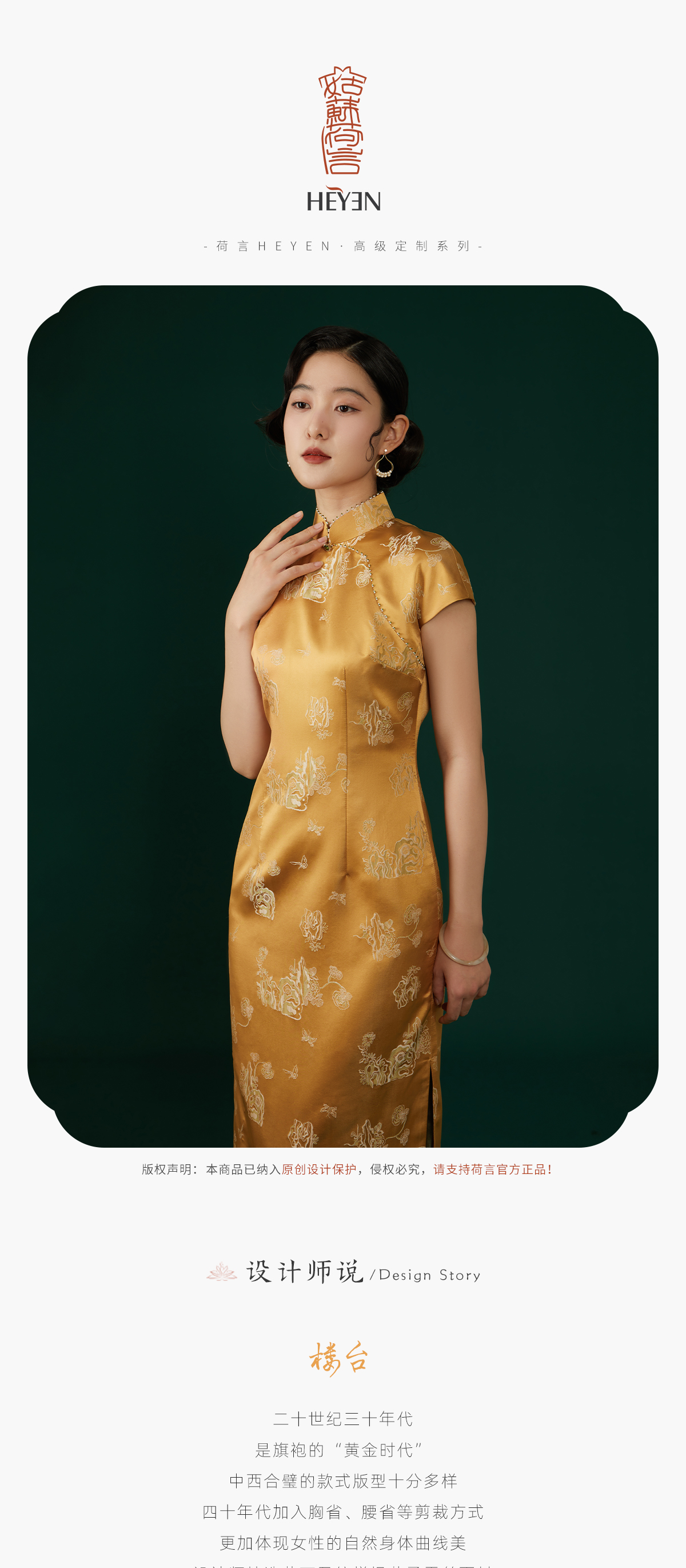 荷言HEYEN 楼台 花下君提花桑蚕丝金黄色旗袍手工钉珠装饰高级定制