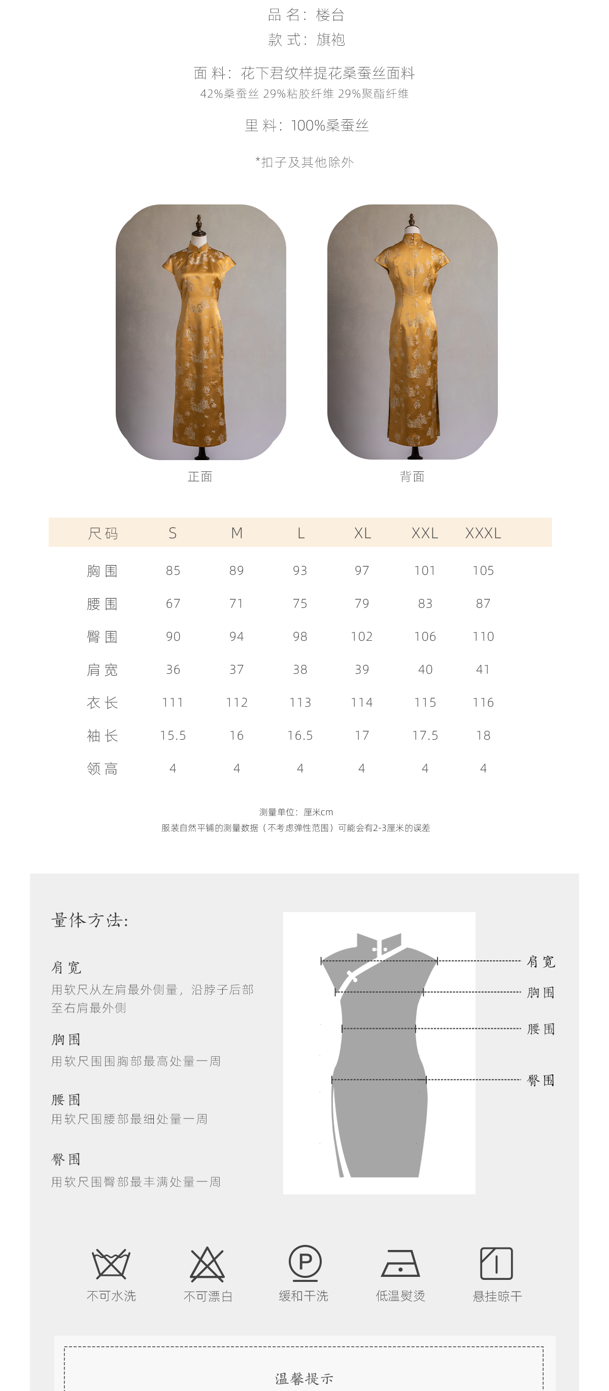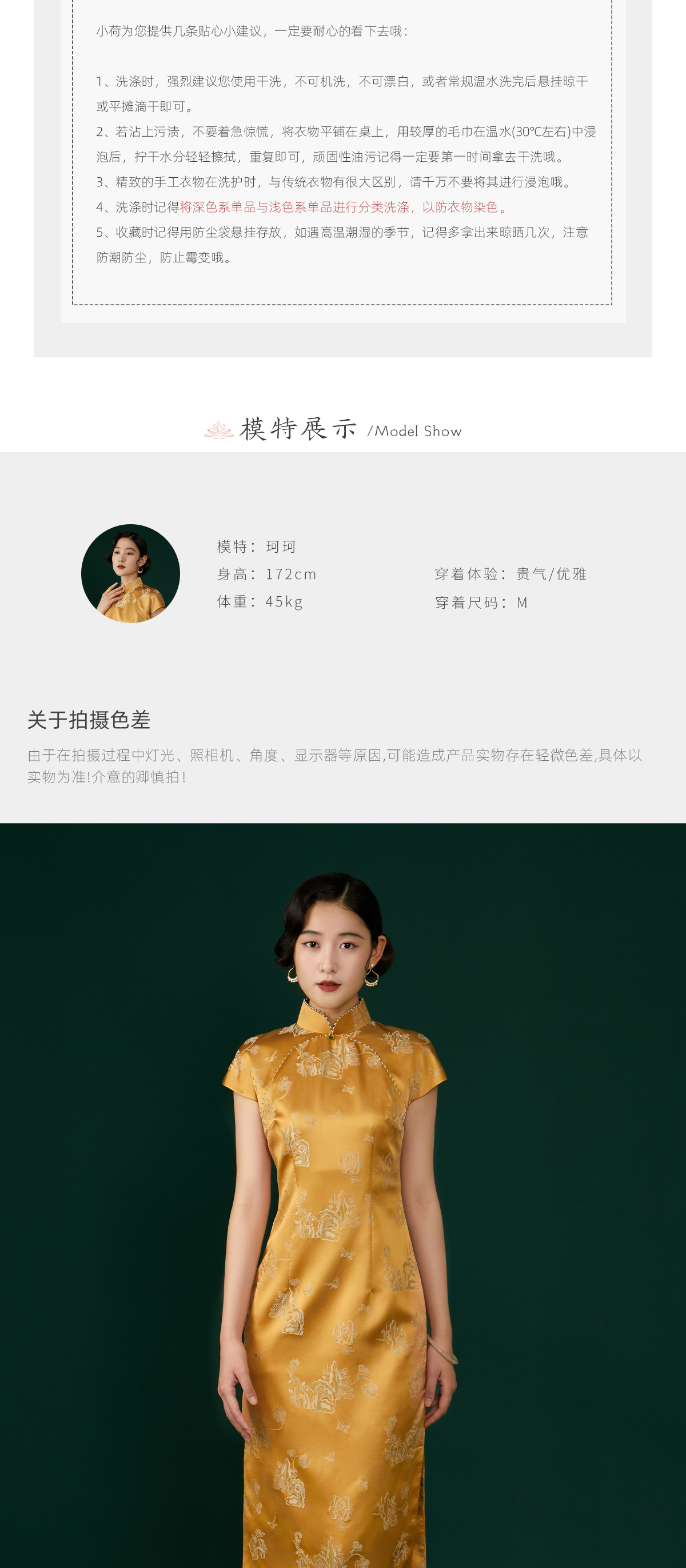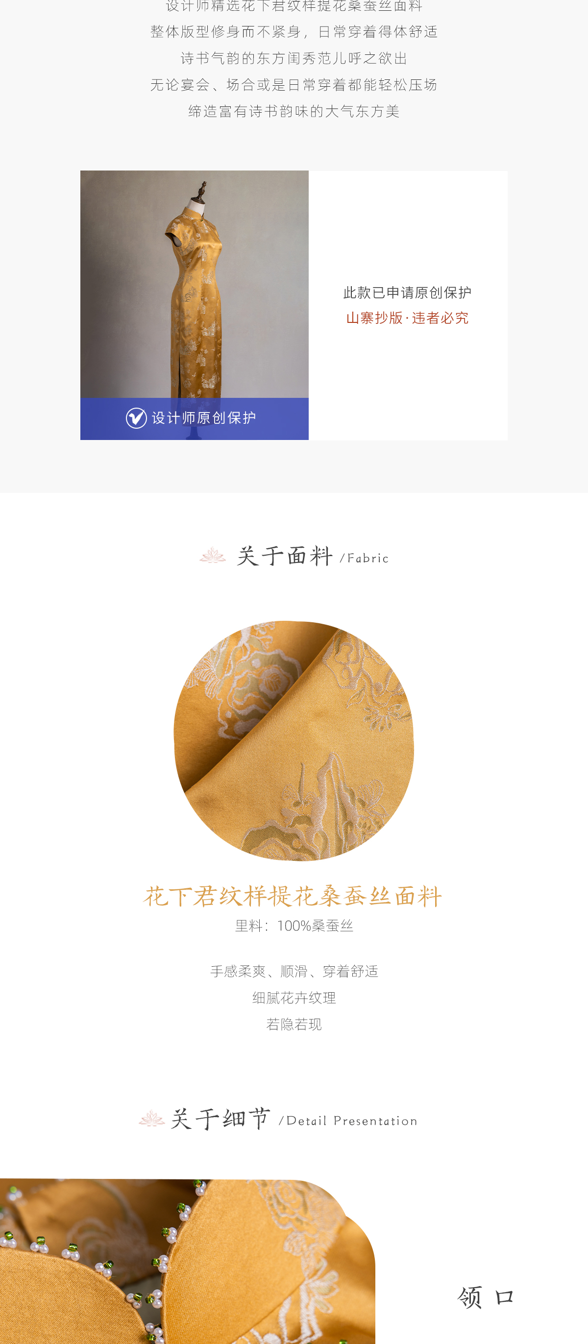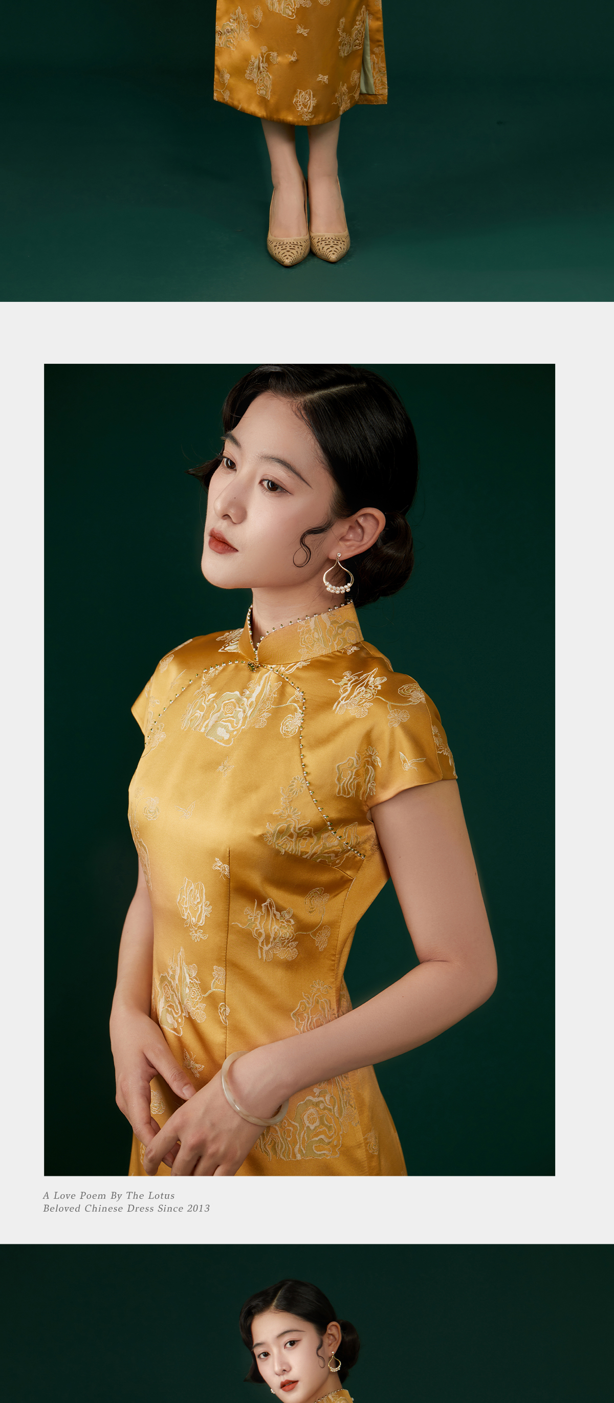 荷言HEYEN 楼台 花下君提花桑蚕丝金黄色旗袍手工钉珠装饰高级定制