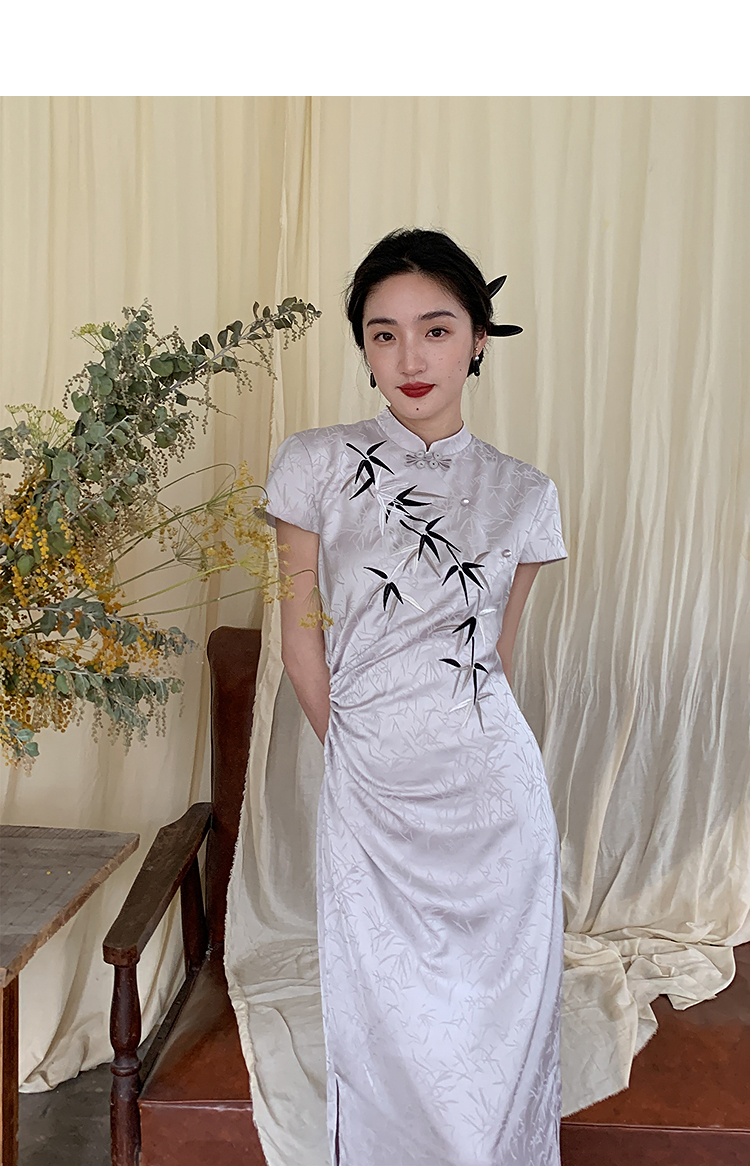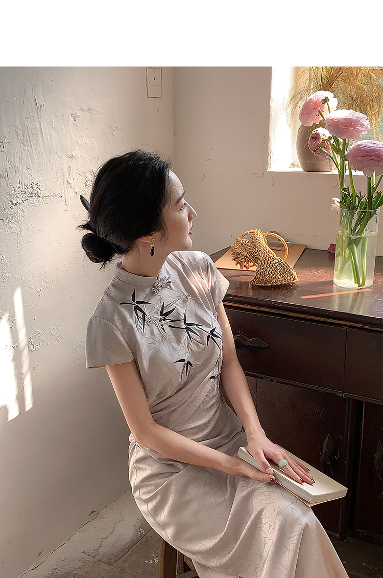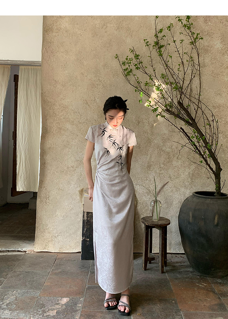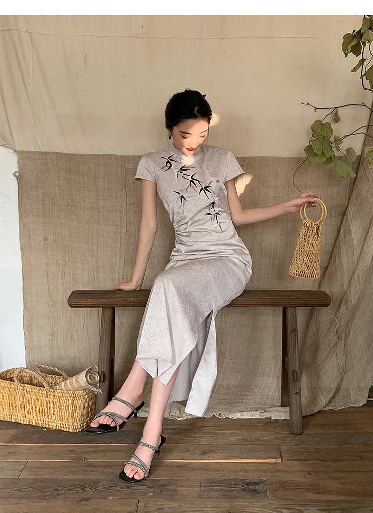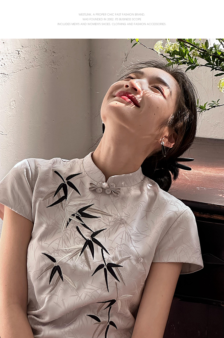 西遇新中式旗袍女夏季新款竹子灰色盘扣修身收腰短袖连衣裙SS150341