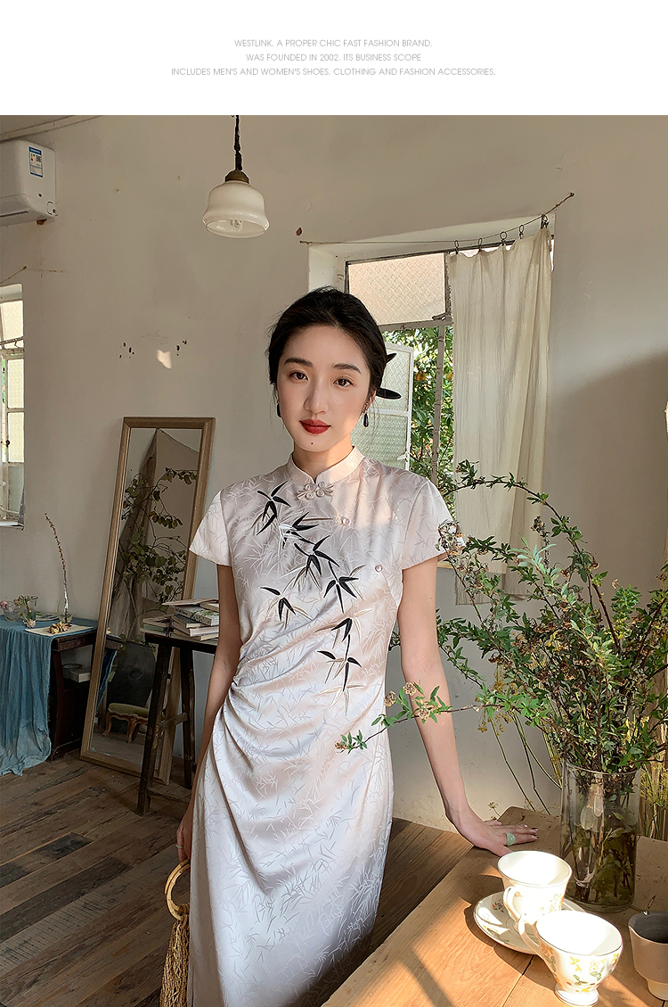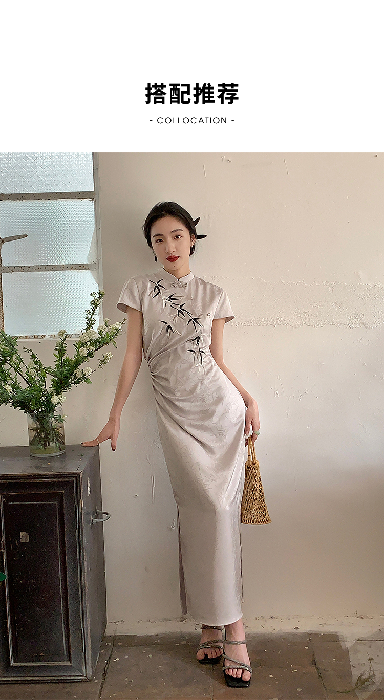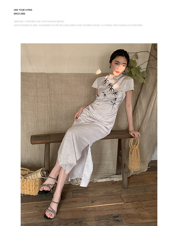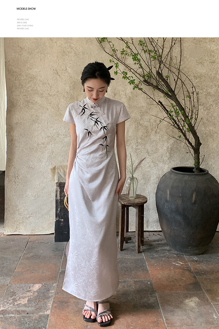 西遇新中式旗袍女夏季新款竹子灰色盘扣修身收腰短袖连衣裙SS150341