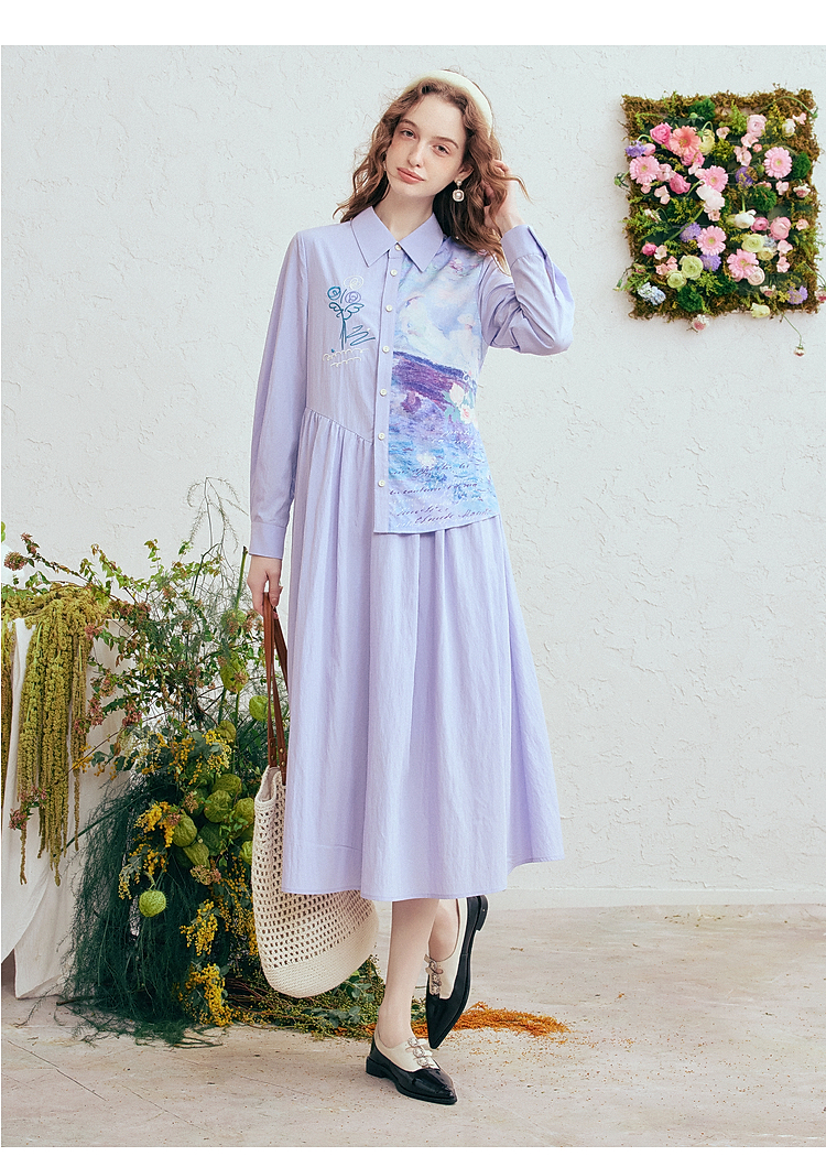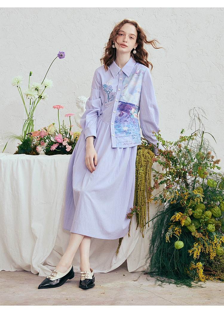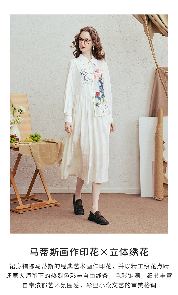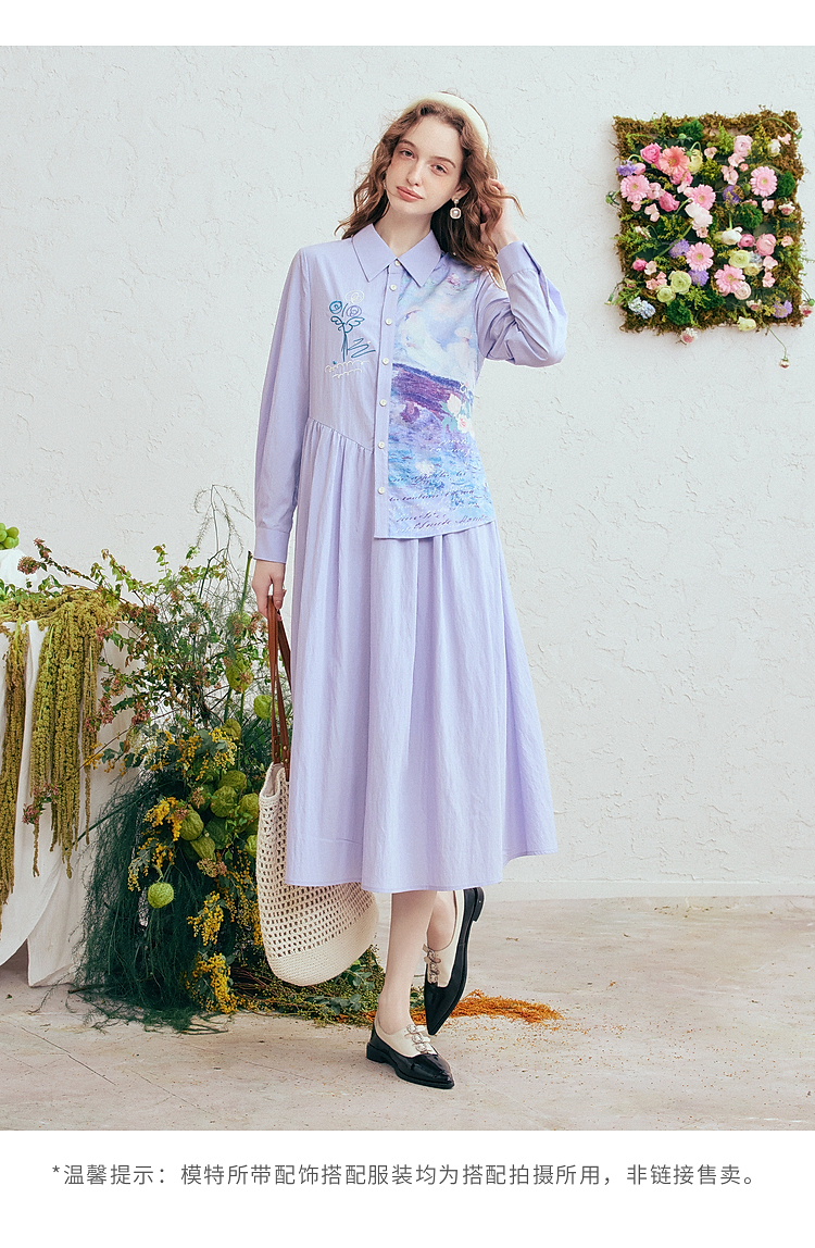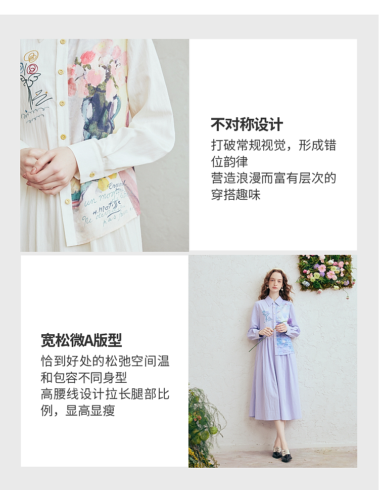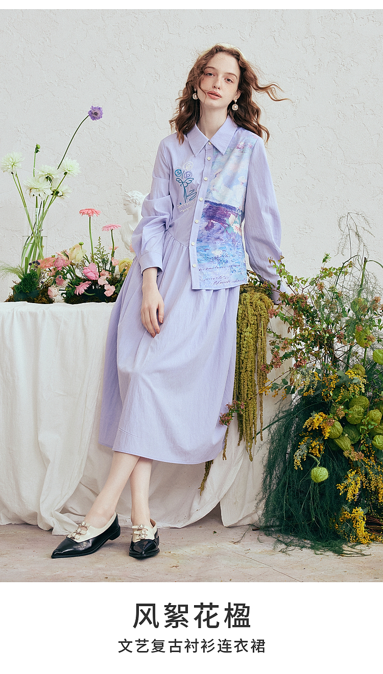 两三事 风絮花楹 2026春季新款文艺风刺绣印花不对称a字连衣裙