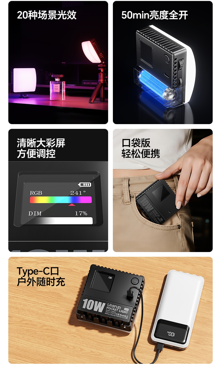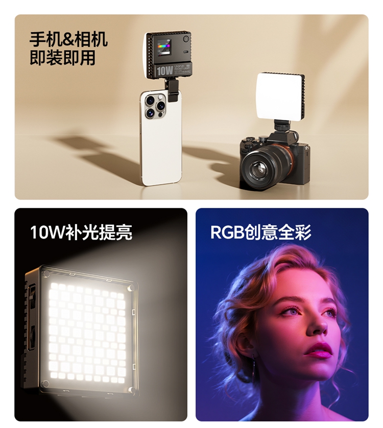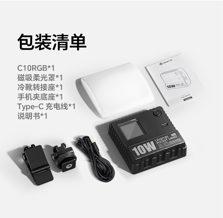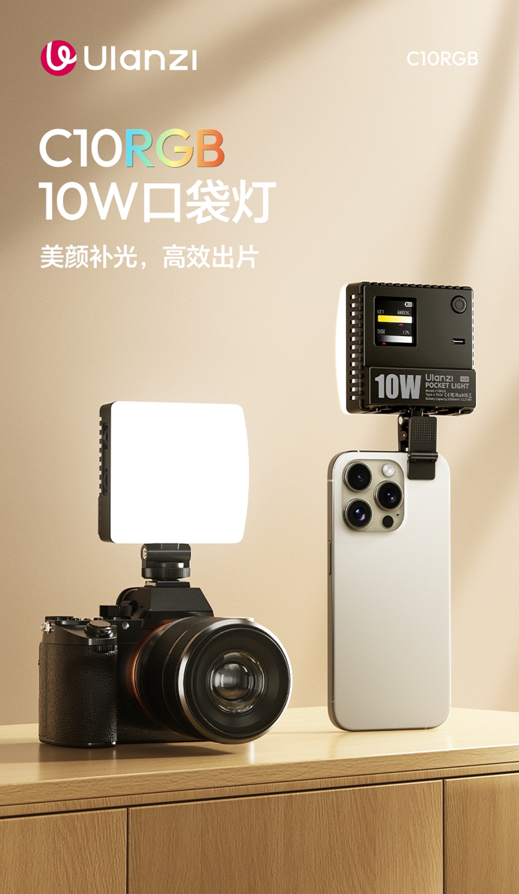 Ulanzi优篮子 C10RGB口袋10W补光灯直播视频拍摄双色温摄影灯led便携RGB全彩常亮灯微单反相机手机通用打光灯