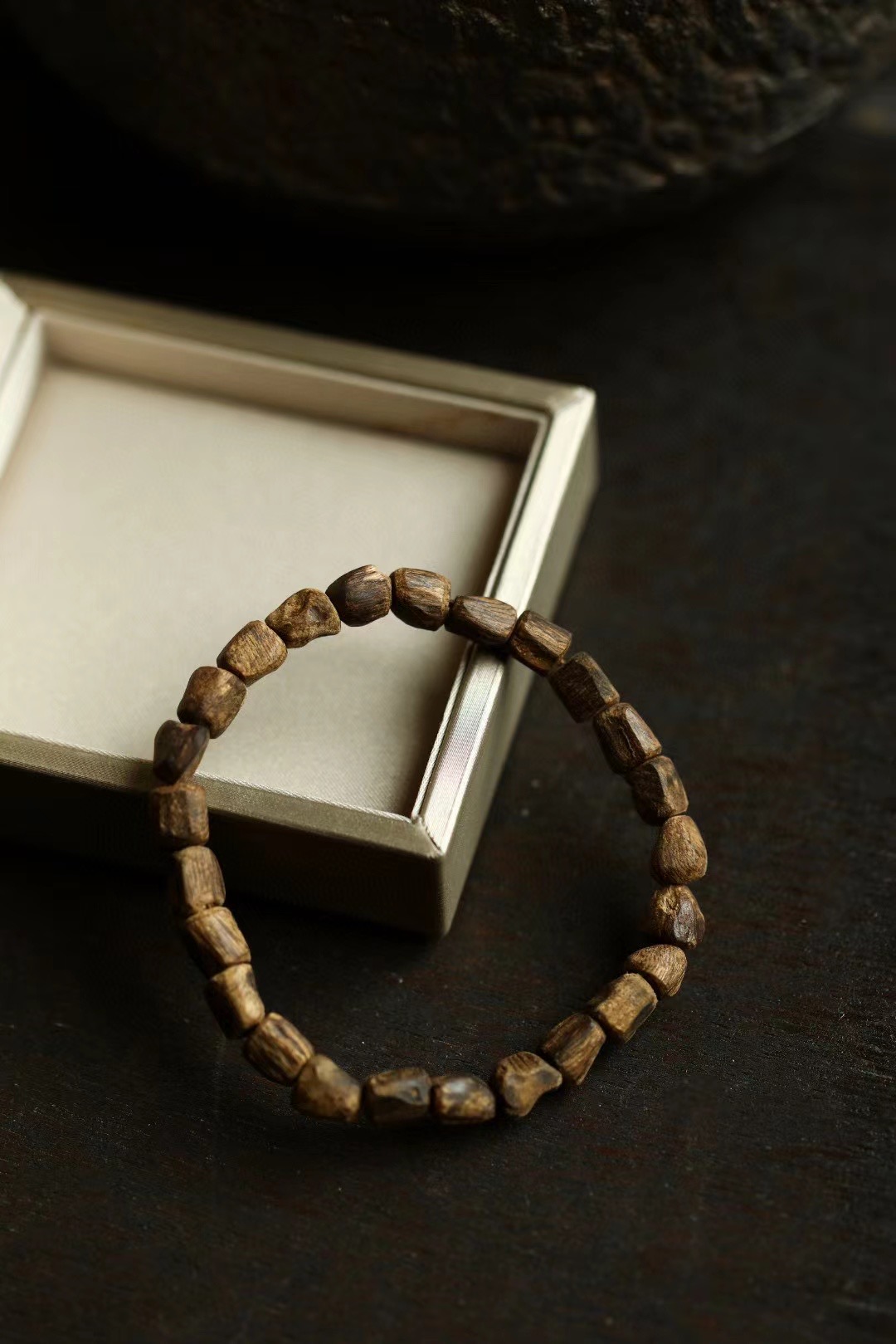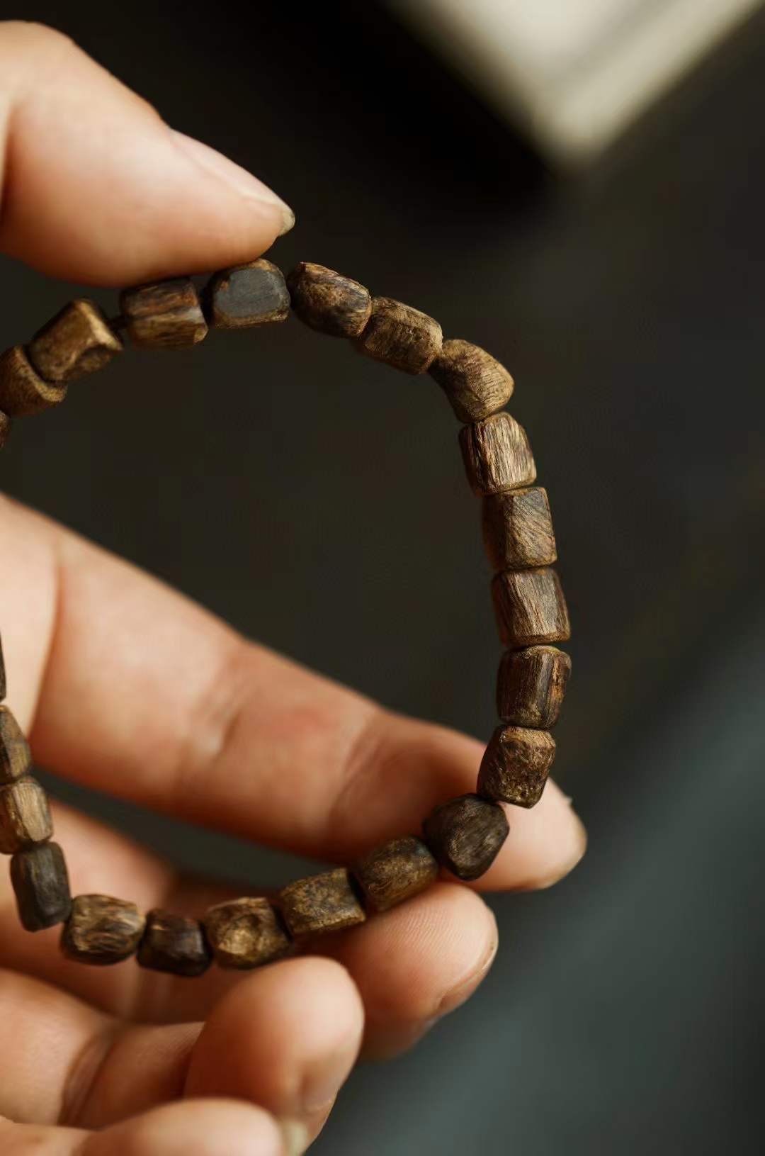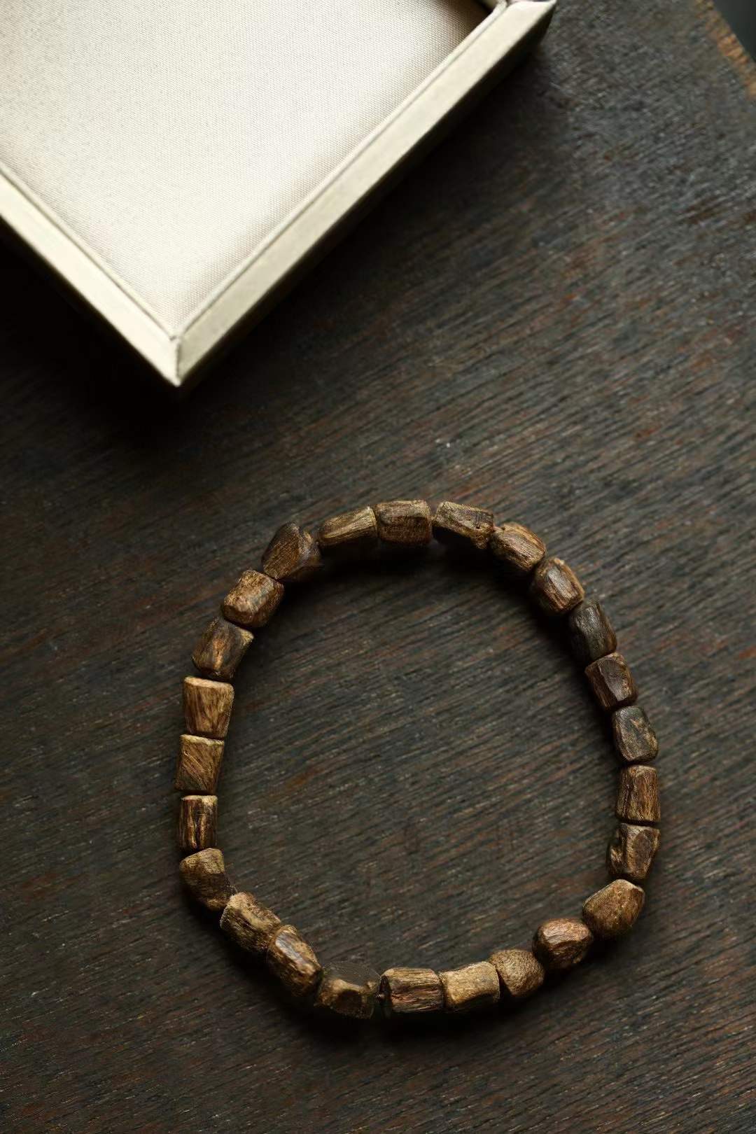 沉水级,随型取材,结香坚实,生闻有乳香甜意,有独特的清凉感,幽柔清雅,佩戴雅致。