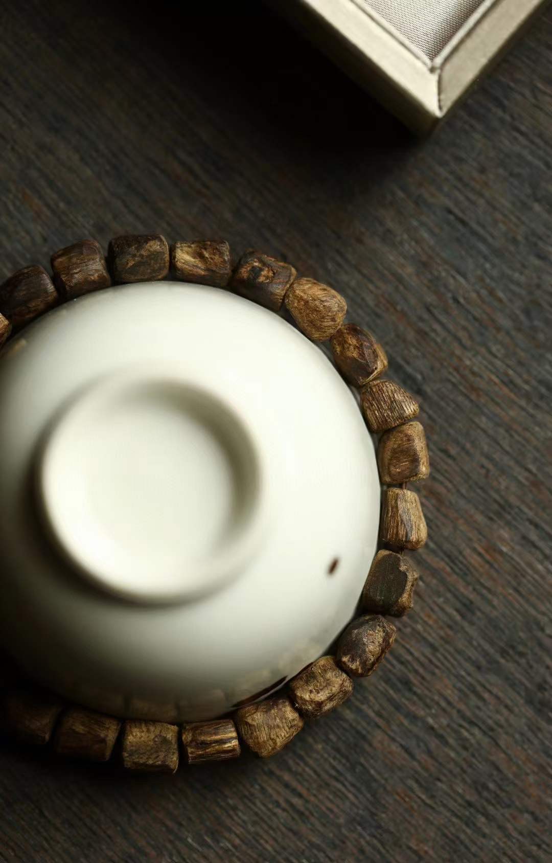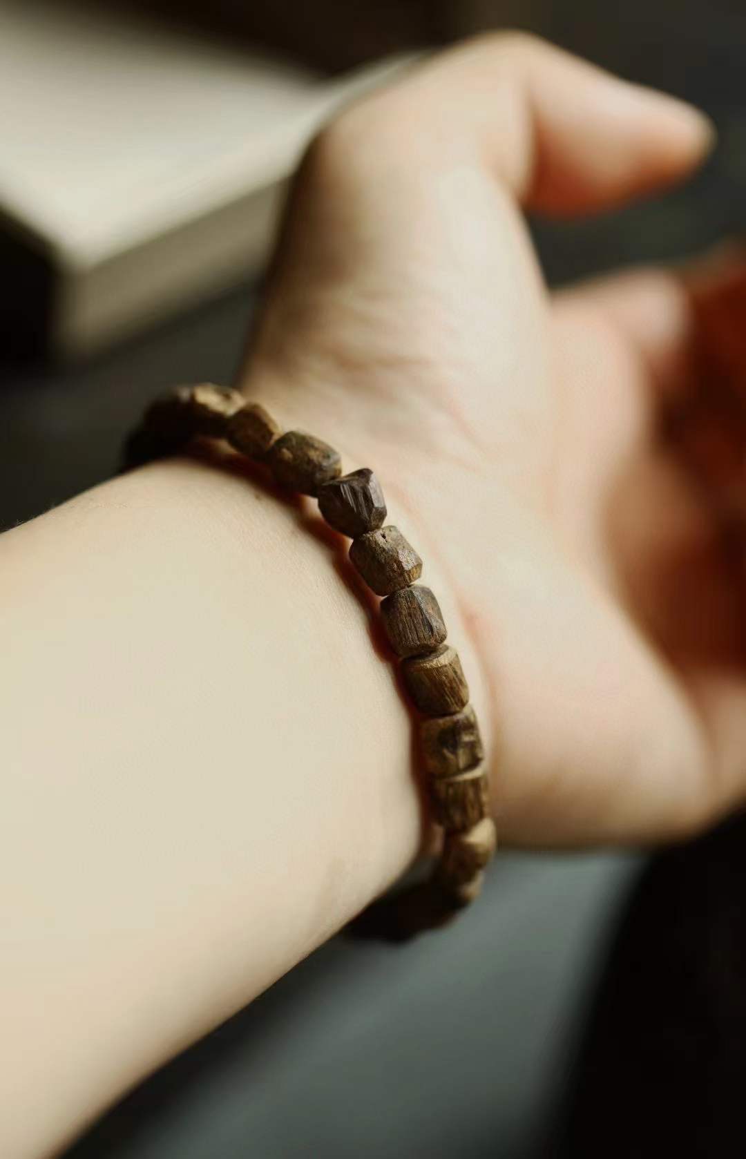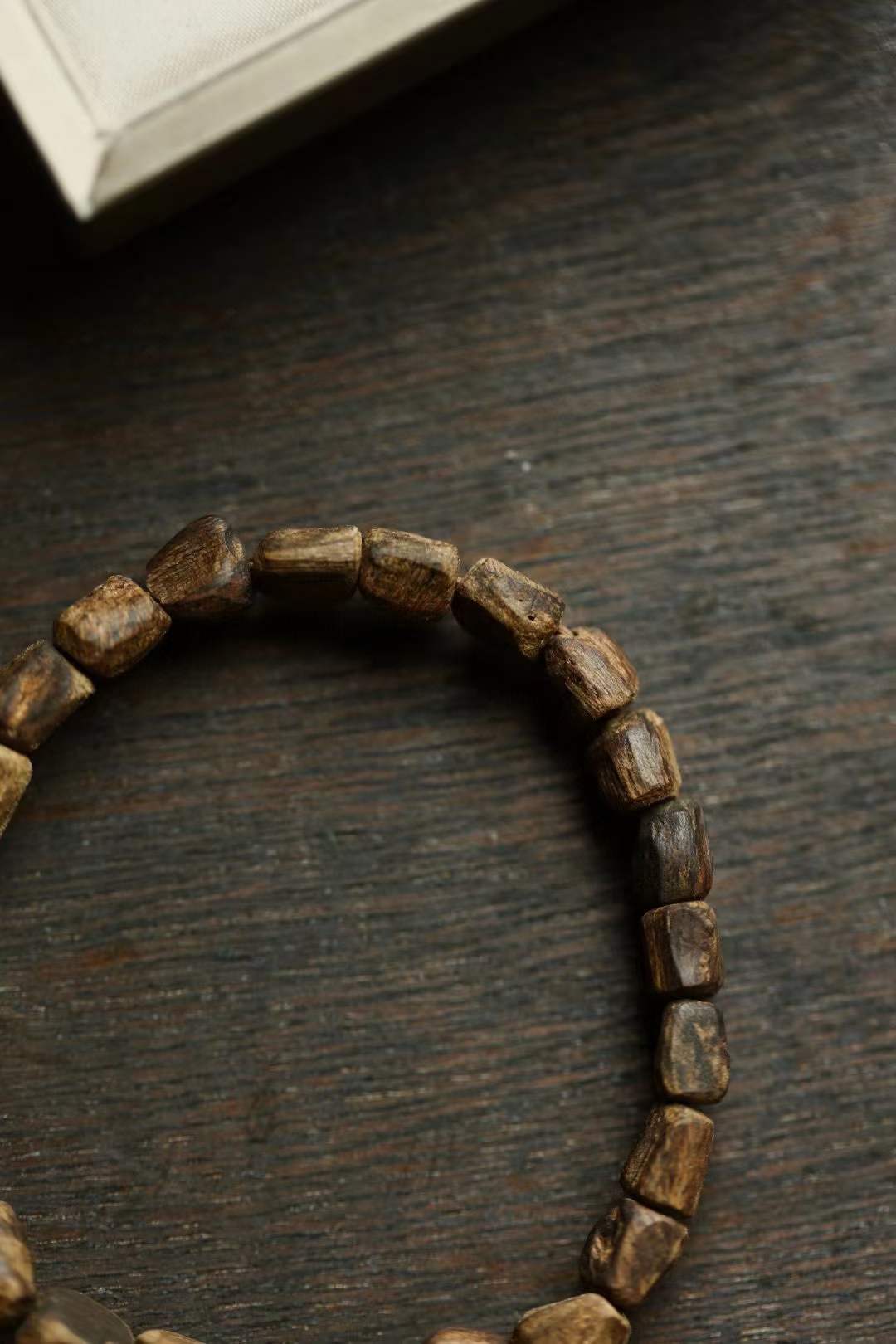 沉水级,随型取材,结香坚实,生闻有乳香甜意,有独特的清凉感,幽柔清雅,佩戴雅致。