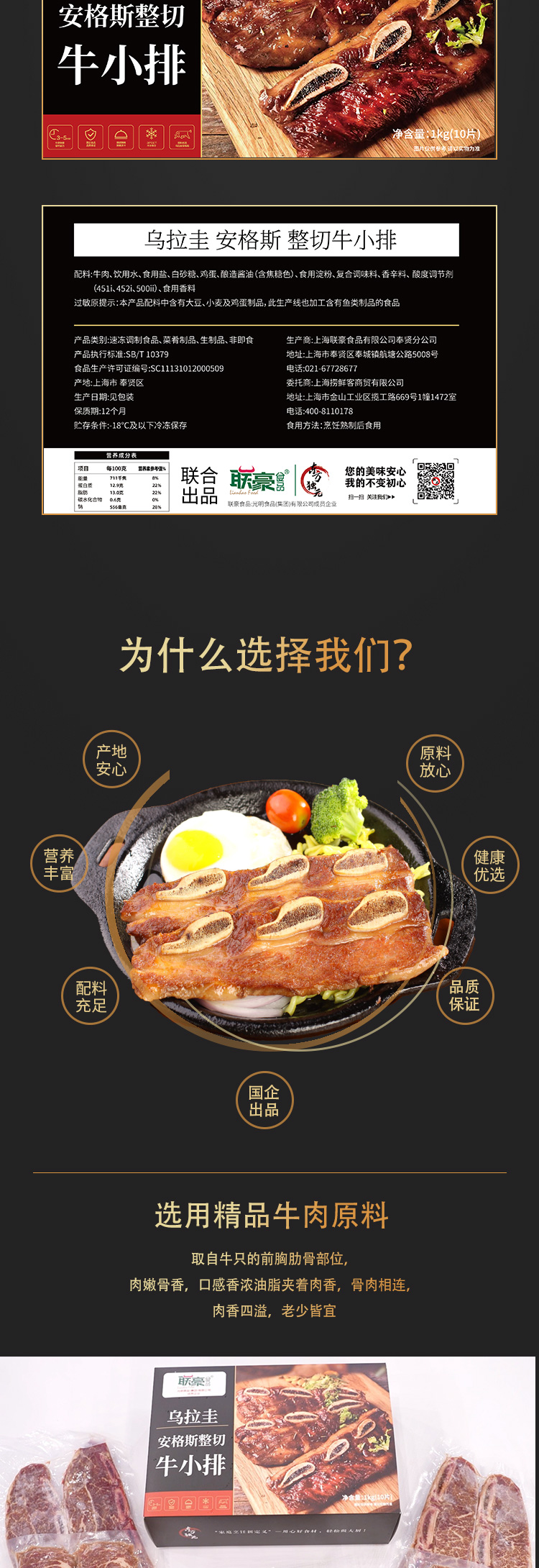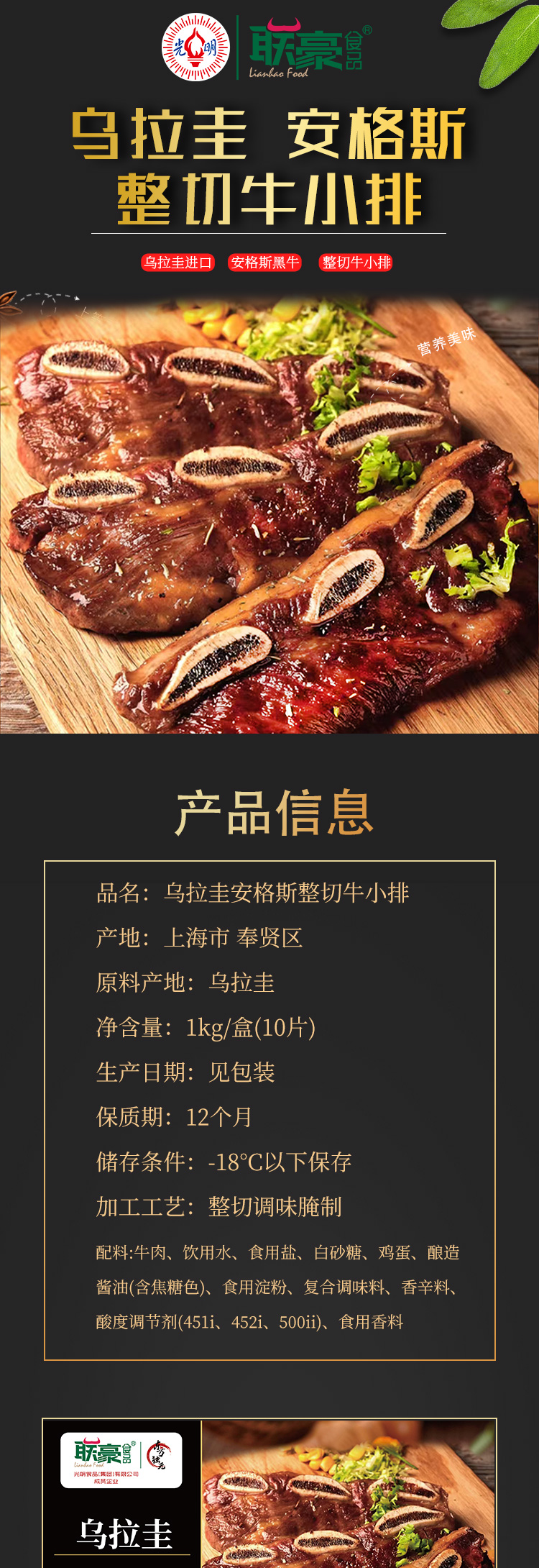 【光明联豪】乌拉圭安格斯整切牛小排 1kg/盒(每盒含5袋,共10片)